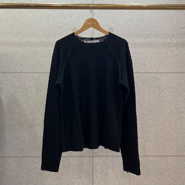 【品番】5B004-0225-17 【カラー】BLACK 【素材】WOOL : 100% 【サイズ】S 【Size srec】 (S)着丈:約63.0cm・肩幅:約43.0cm・袖丈:約69.0cm・身幅:約51.0cm ※平置きで測っています 表出しにした縫い代と構築的なパネル構造が特徴のクルーネックトップ。前身頃がラグラン袖、後身頃がセットインの変形ラグランデザイン。 ゆったりとしたルーズフィットシルエット。 戦後ドイツを代表する芸術家アンゼルム ・キーファーの作品の特徴的な地層のように塗り固めたような多層を、独特なダメージ感のあるウールクラッシュジャガード生地で表現。