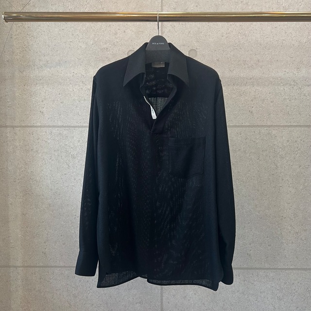 【品番】26SS-B-BL03 【カラー】Black 【素材】 (body) Triacetate : 54% Wool : 34% Polyester : 12% 【サイズ】1 【Size srec】 (1)着丈:約84.0cm・肩幅:約51.0cm・袖丈:約66.5cm・身幅:約62.0cm ※平置きで測っております ゆったりしたシルエットのスキッパーシャツです。 サイドに深めのスリットが入っております。 袖の内側には、ブランドオリジナルの平ゴムが付いており、腕捲りがしやすい仕様になっております。 −生地− オーストラリア産メリノ種梳毛糸とレーヨンスラブリング糸を交織したサマーツィードです。 生地に凹凸があり、通気性の良い生地です。 ※交織(こうしょく)・・・経糸と横糸に2種類以上の異なる糸を用いて織ること。 ※缶バッチ1個付きます。 ※身長177cm
