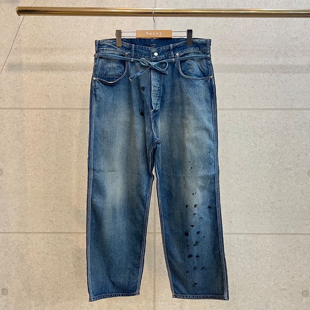 【品番】25AW-B-PT08 【カラー】INDIGO 【素材】 (body) COTTON : 100% 【サイズ】0 【Size srec】 (0)ウエスト:約38.0cm(76cm)・股上:約35.0cm・股下:約77.0cm・わたり周り:約32.5cm・裾幅:約27.5cm ※平置きで測っております ワイドテーパードの5ポケットパンツです。 デニム生地に顔料インクジェットを施し、その後加工をして色を落としています。 顔料を厚く盛ることによって立体感を出し、尚且つ柄を線で表現することによって刺繍のような見え方にしています。 ※身長168cm