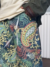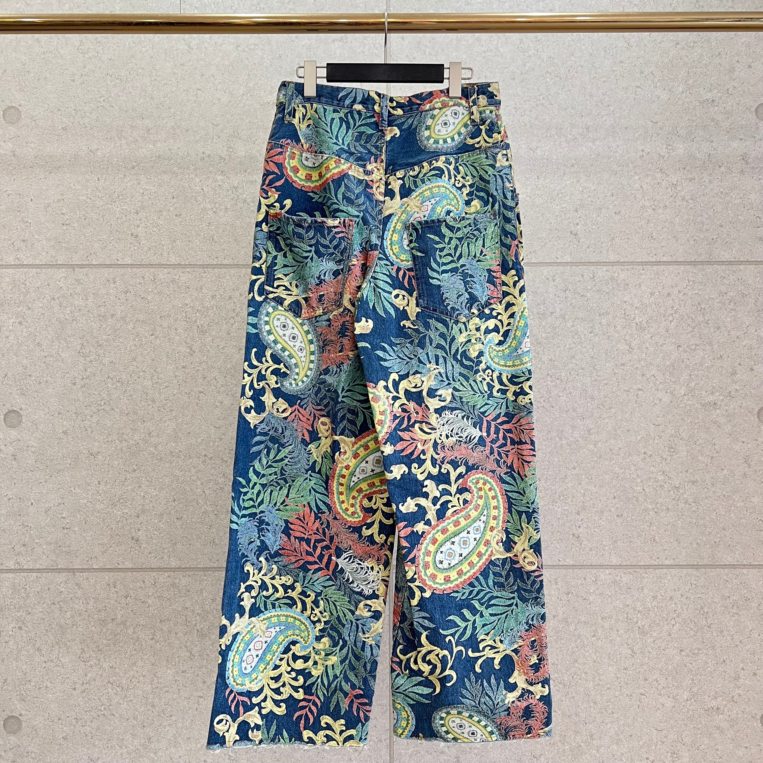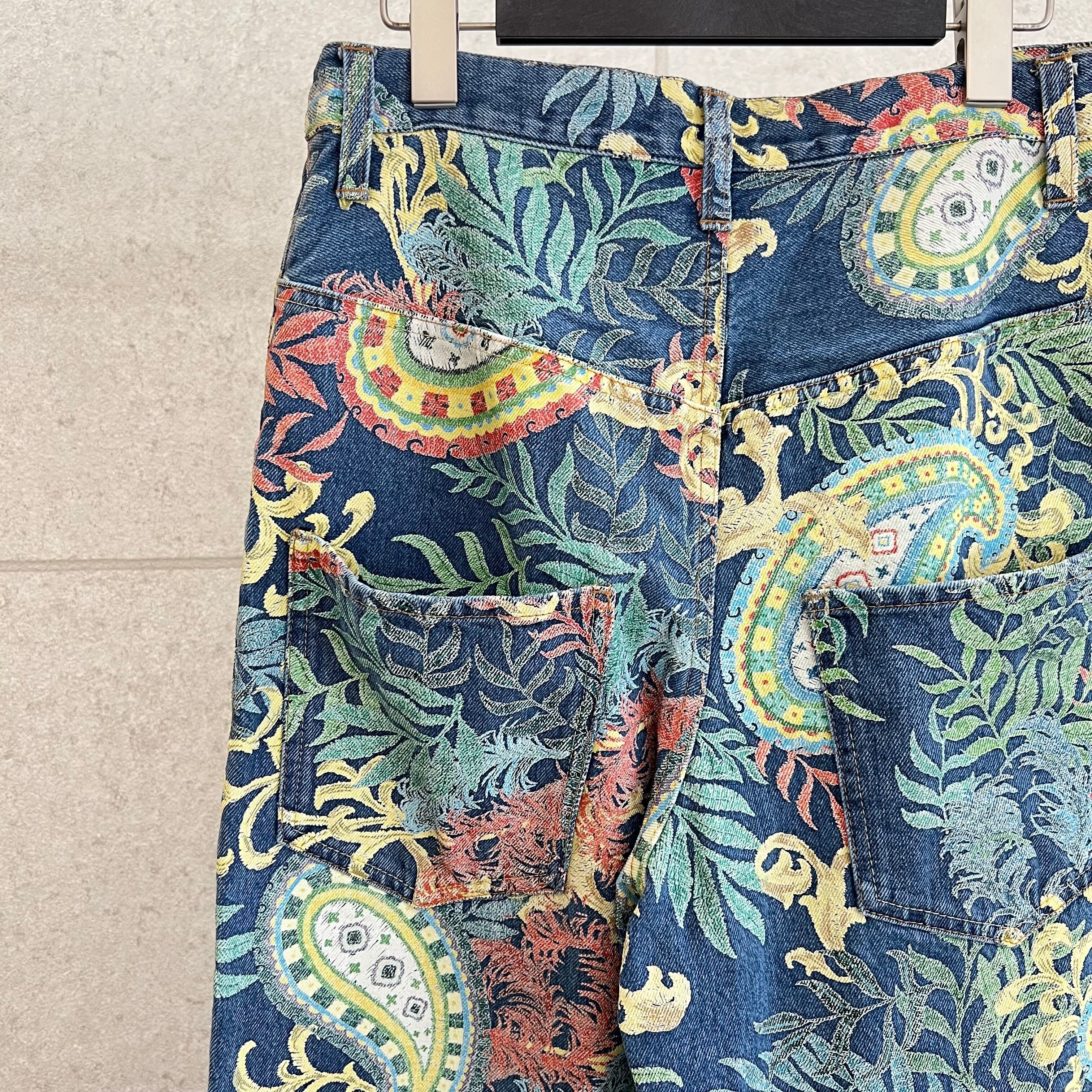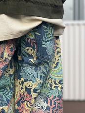 デニム生地に顔料インクジェットを施し、その後加工をして色を落としています。