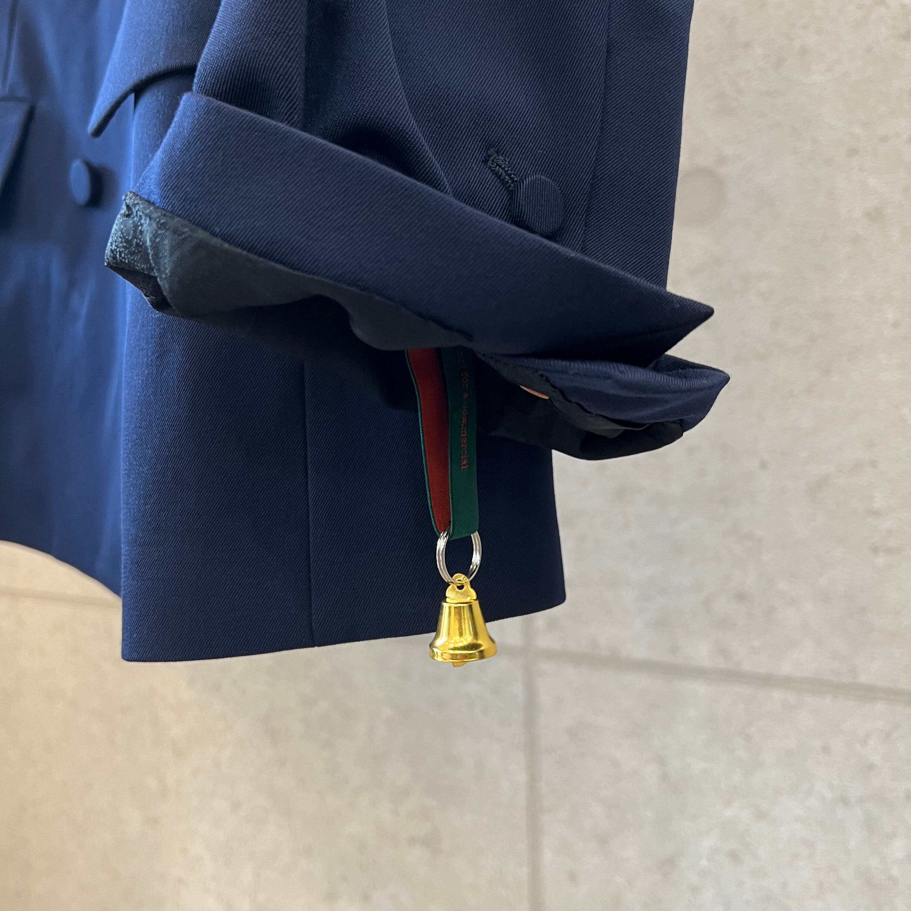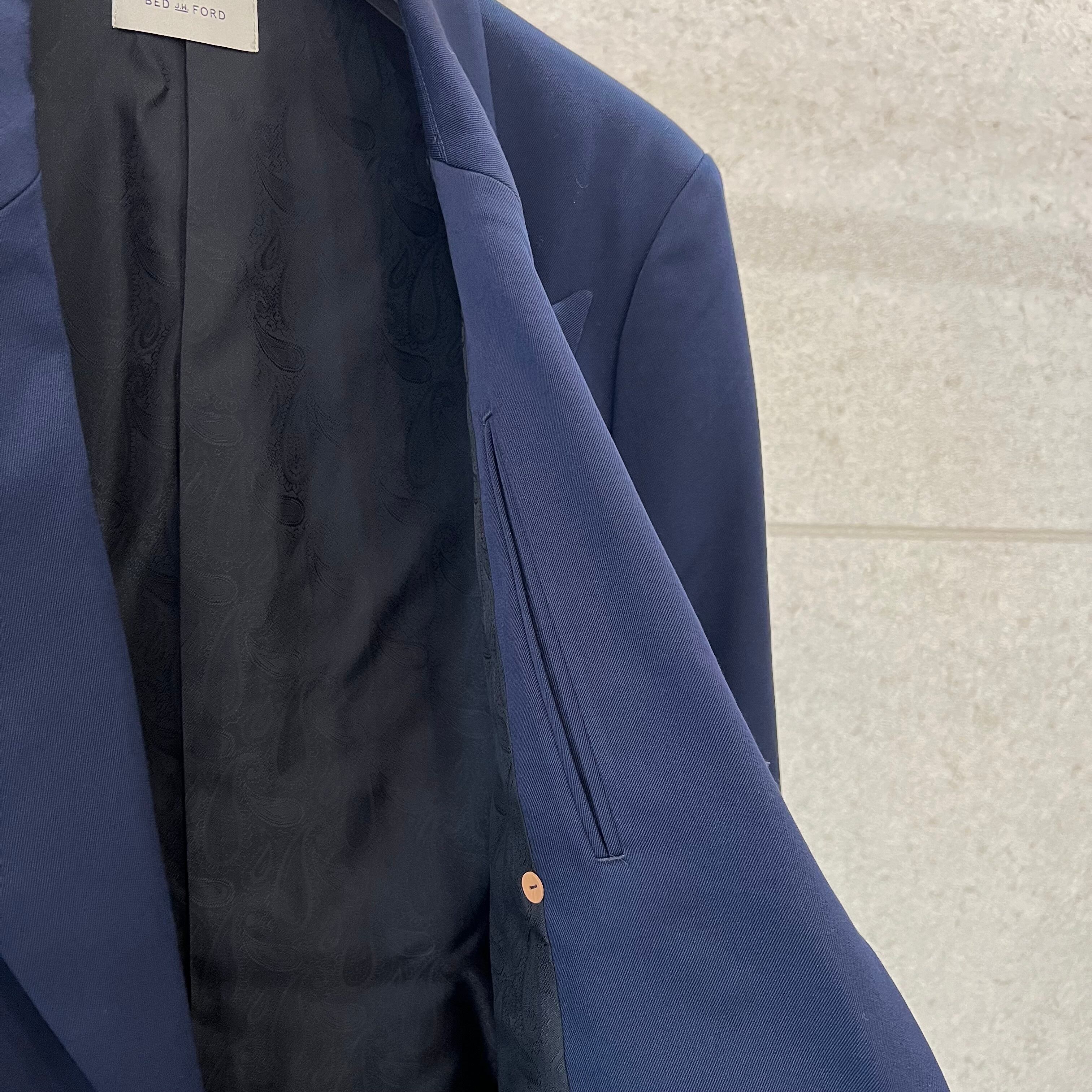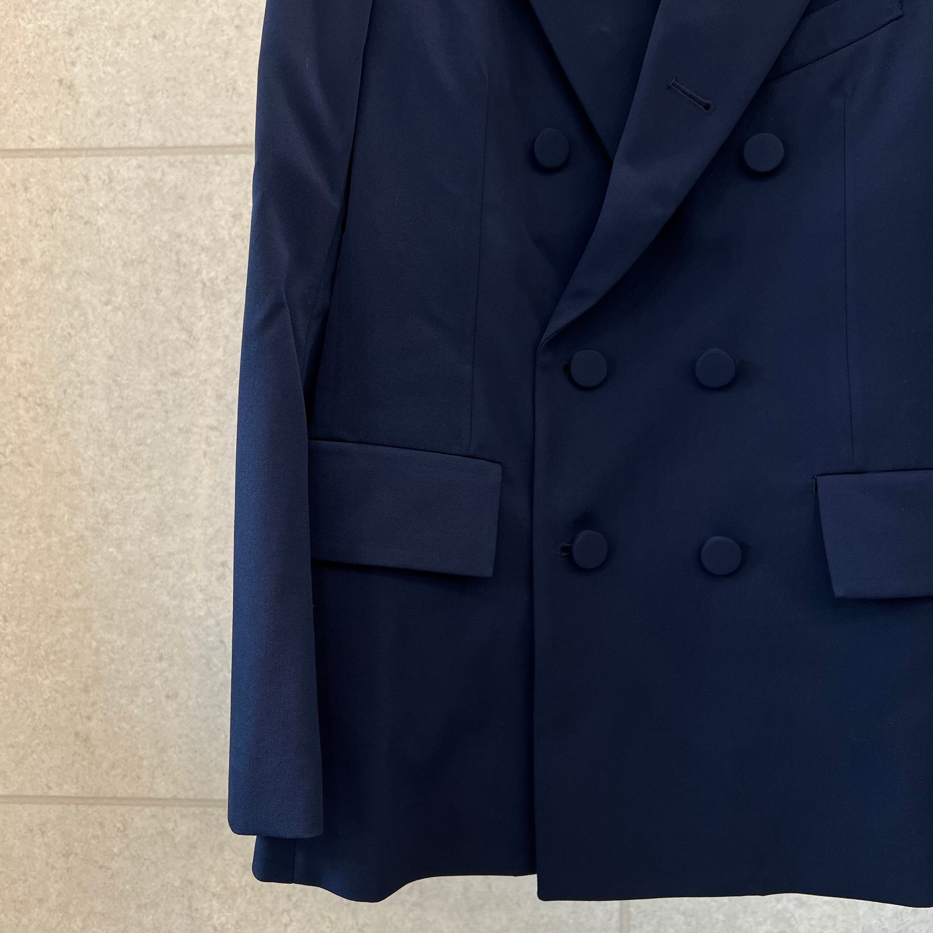 ピークドラペルのダブルブレストジャケットは、襟を立てて着用することも可能です。