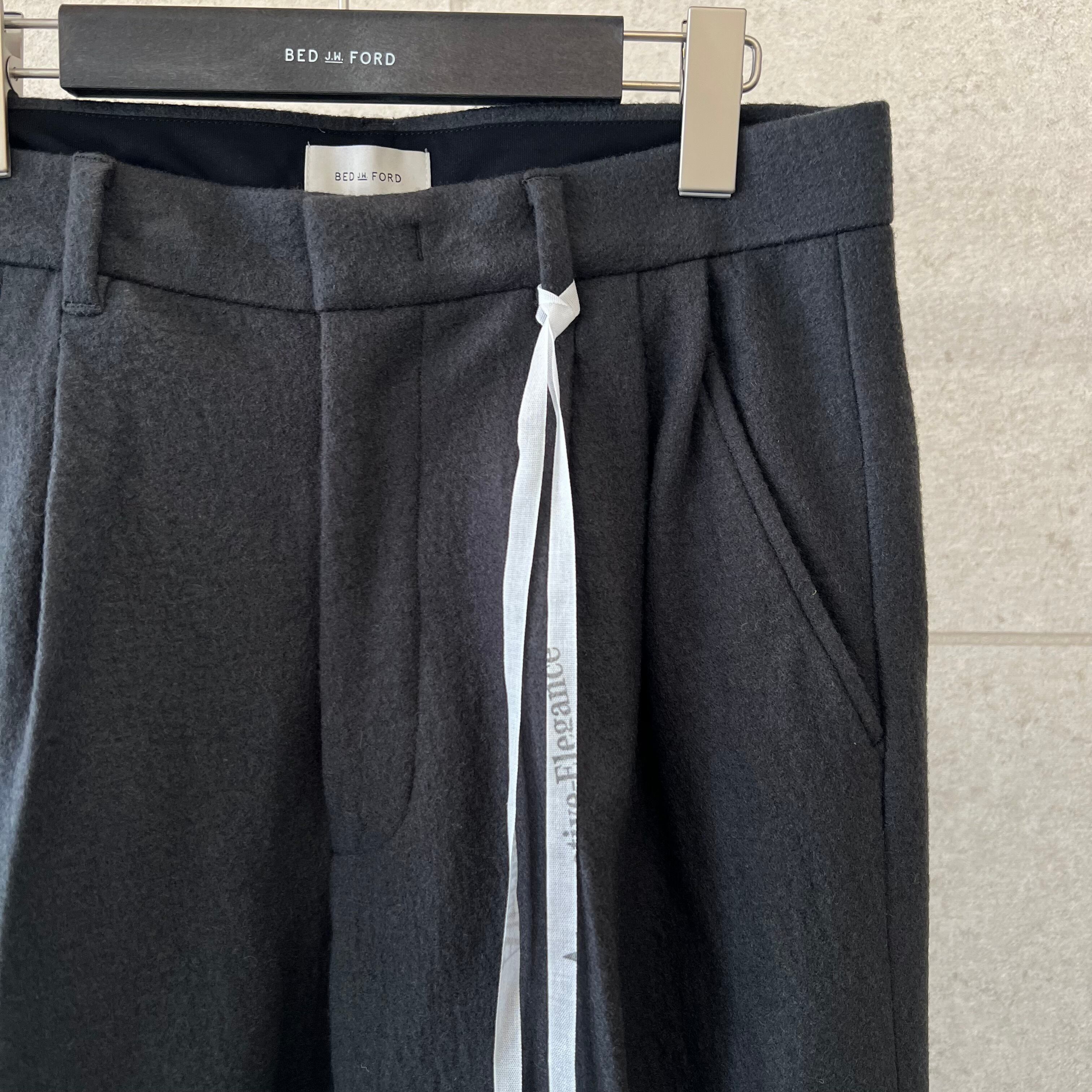 生地は梳毛糸を使ったウール天竺を使用しクレーター加工をしている為、陰影がありムードを感じられる表情に仕上がった。起毛感があり、馴染みの良いソフトな風合いでウールスラックスながらスウェットパンツのような履き心地が特徴です