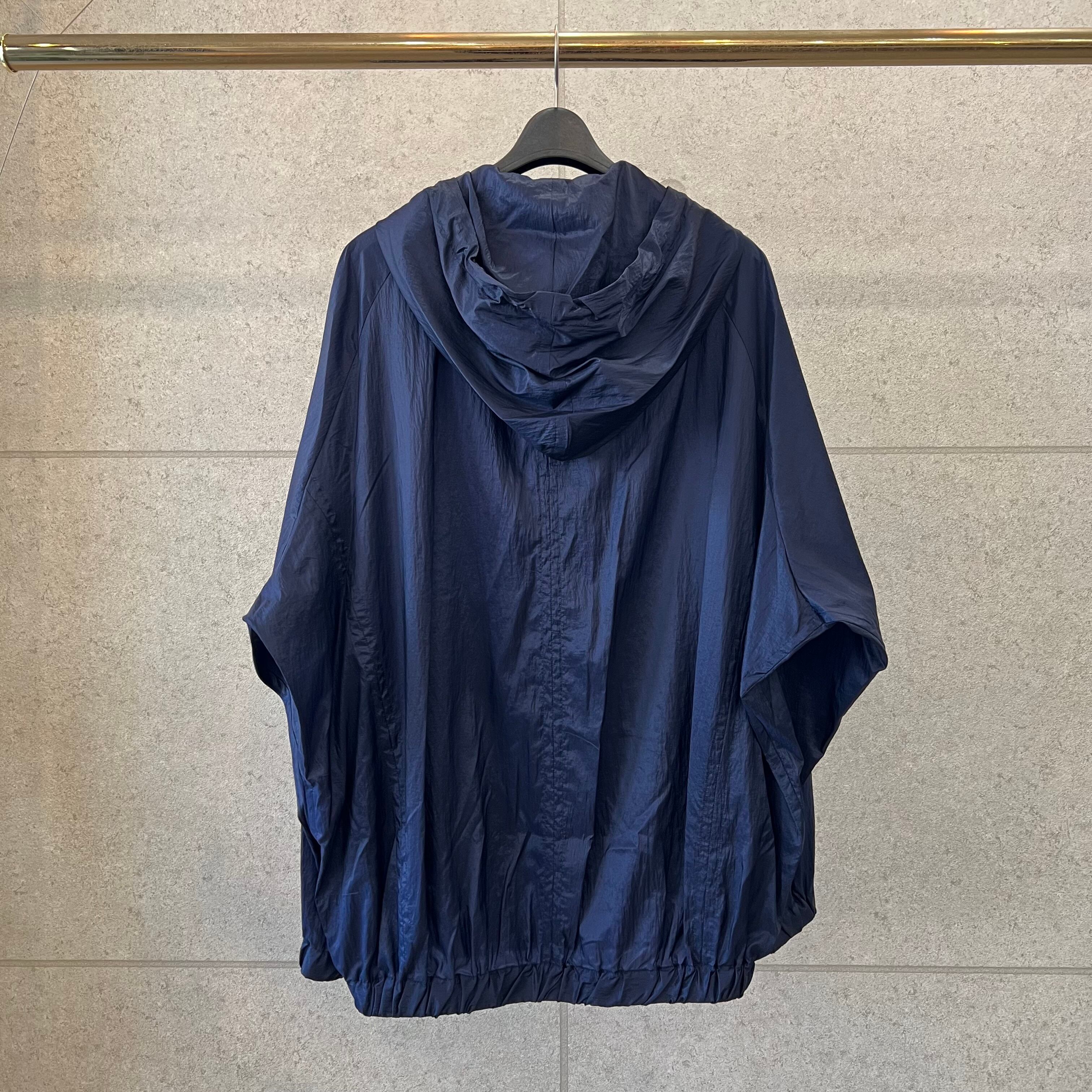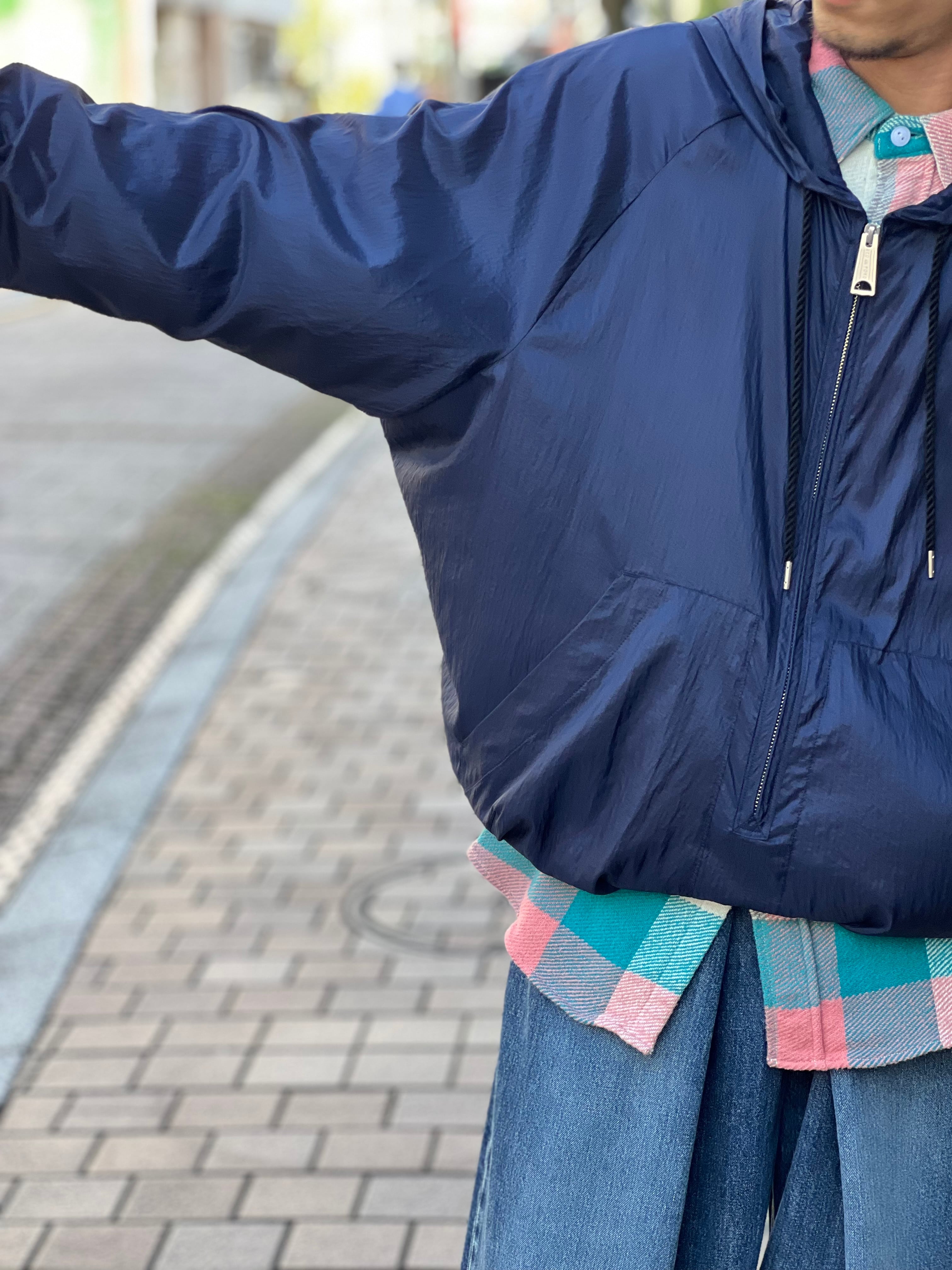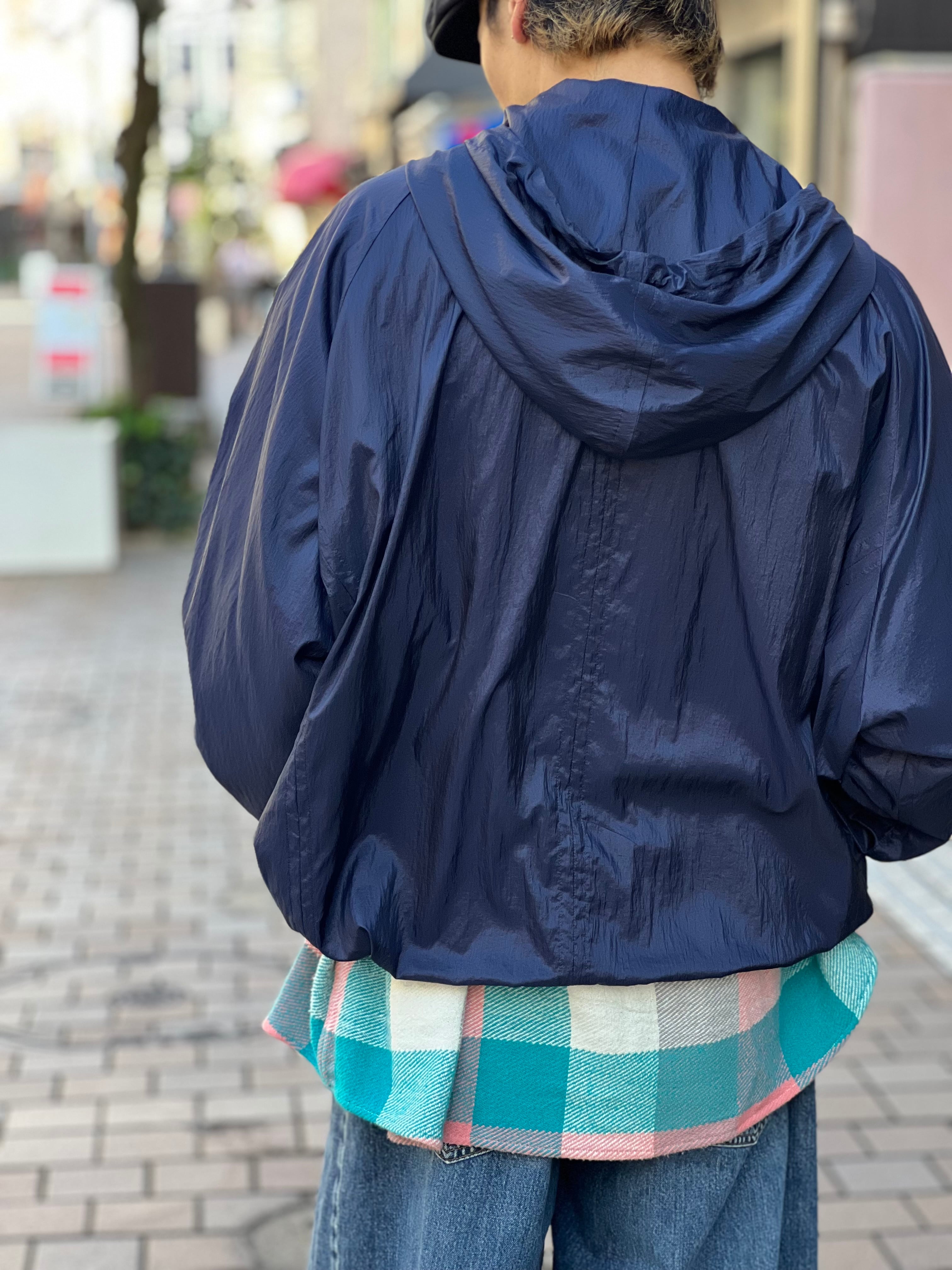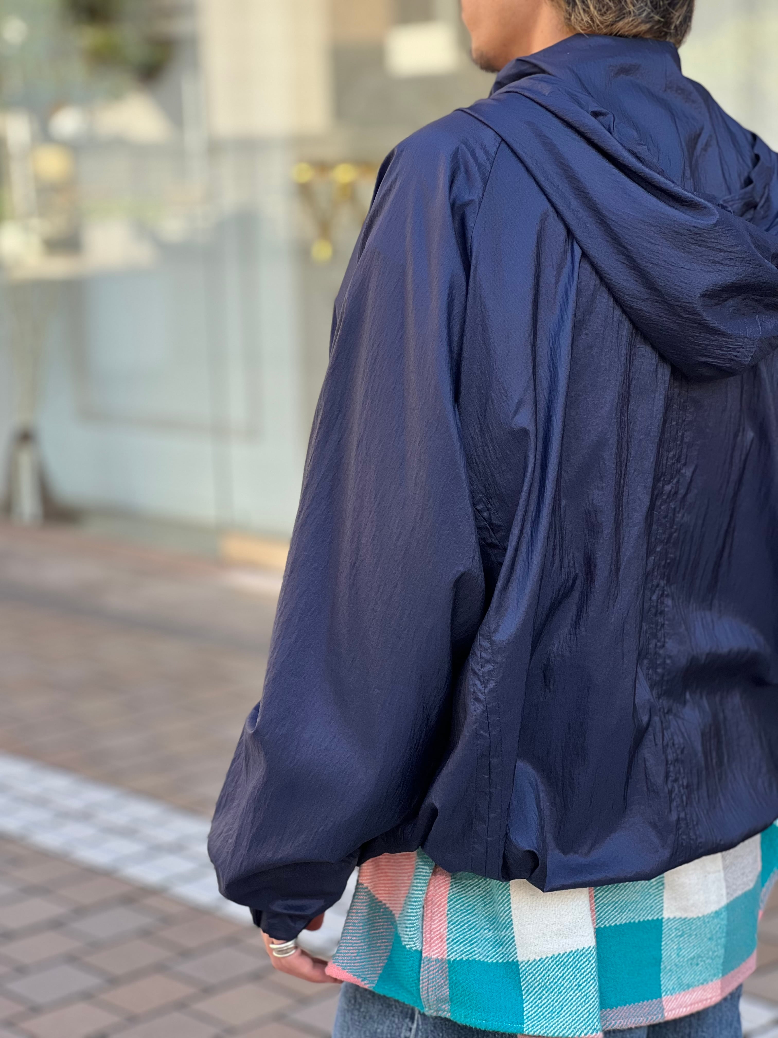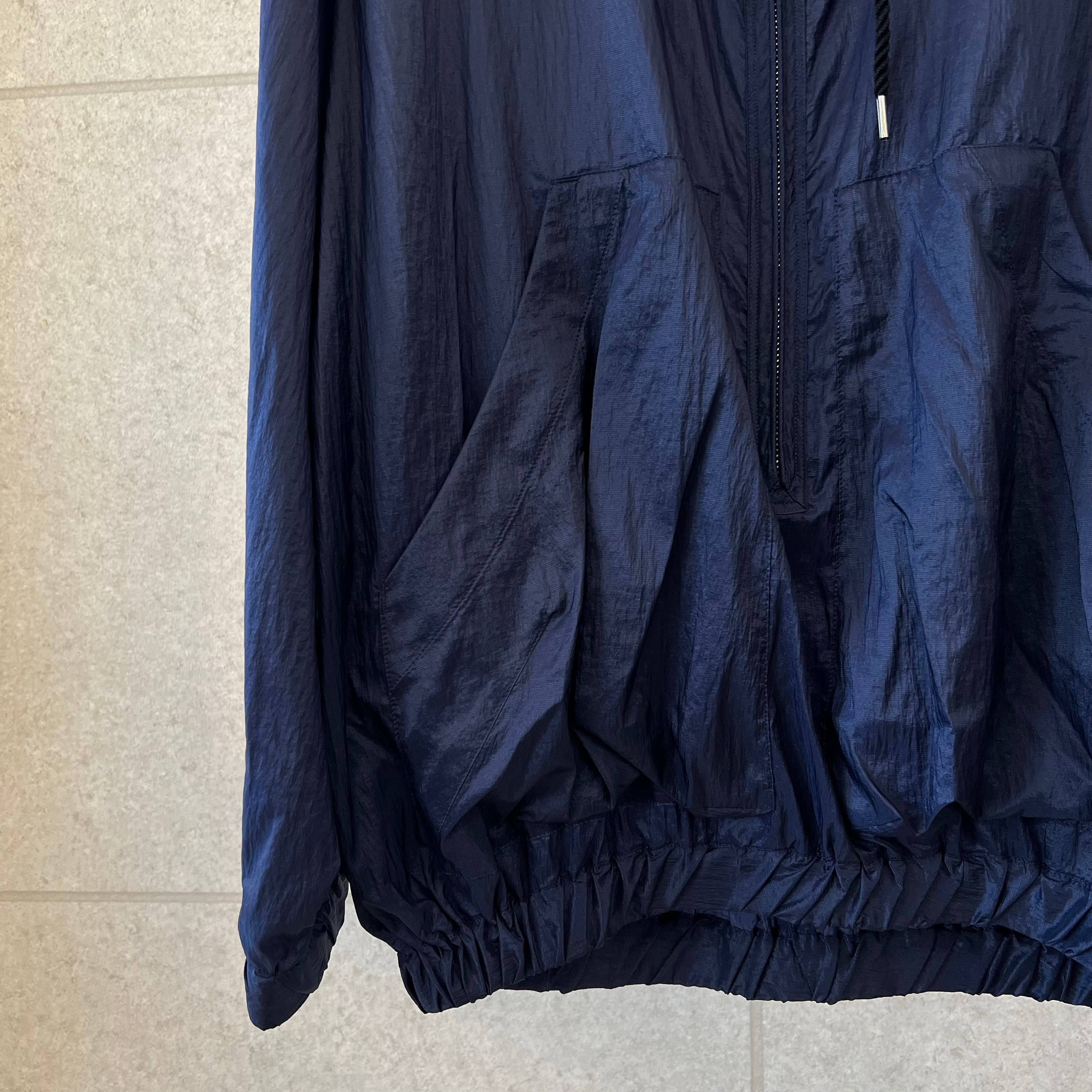 長めのフロントファスナーが目を惹くプルオーバーのナイロンパーカー。