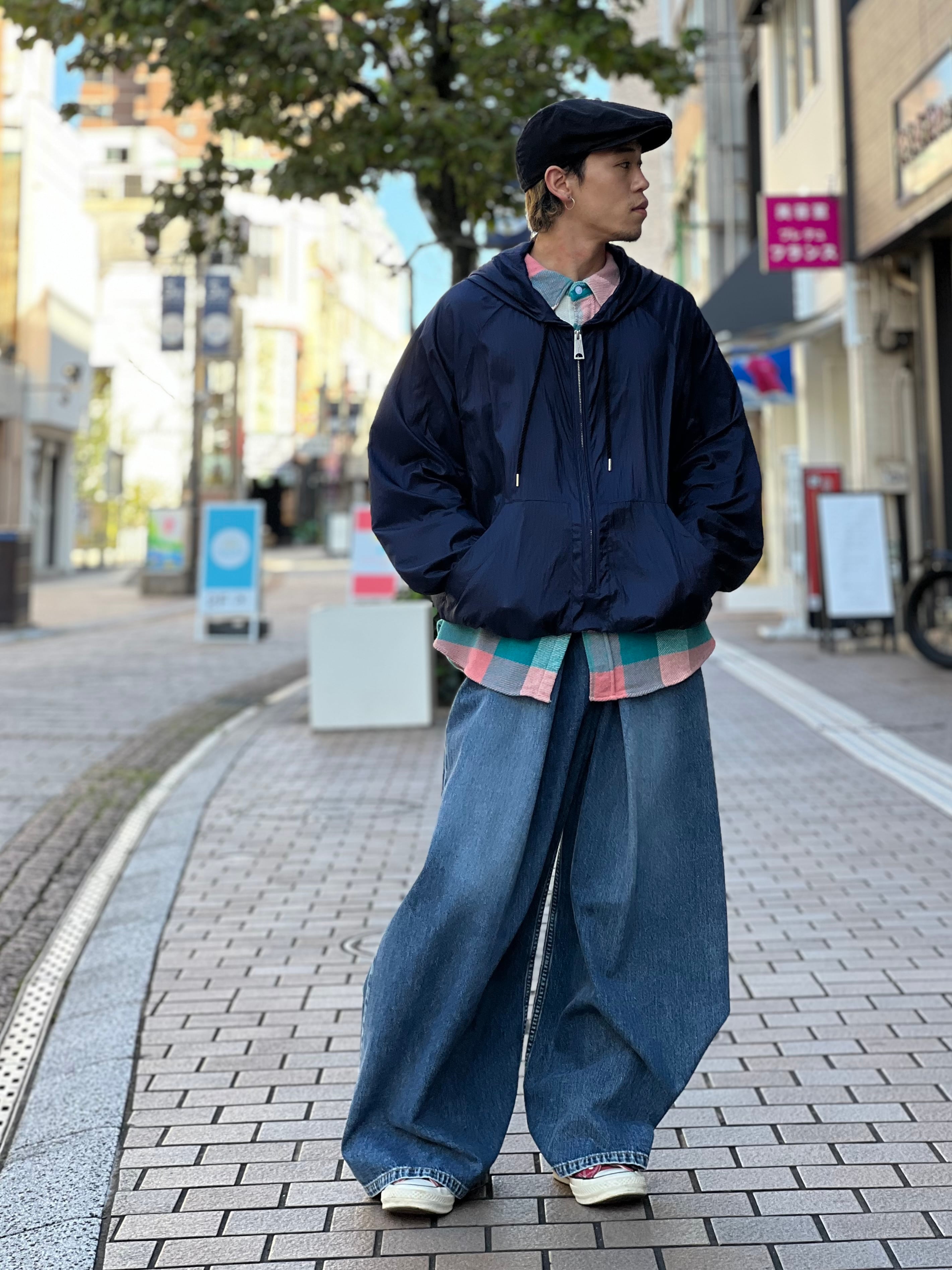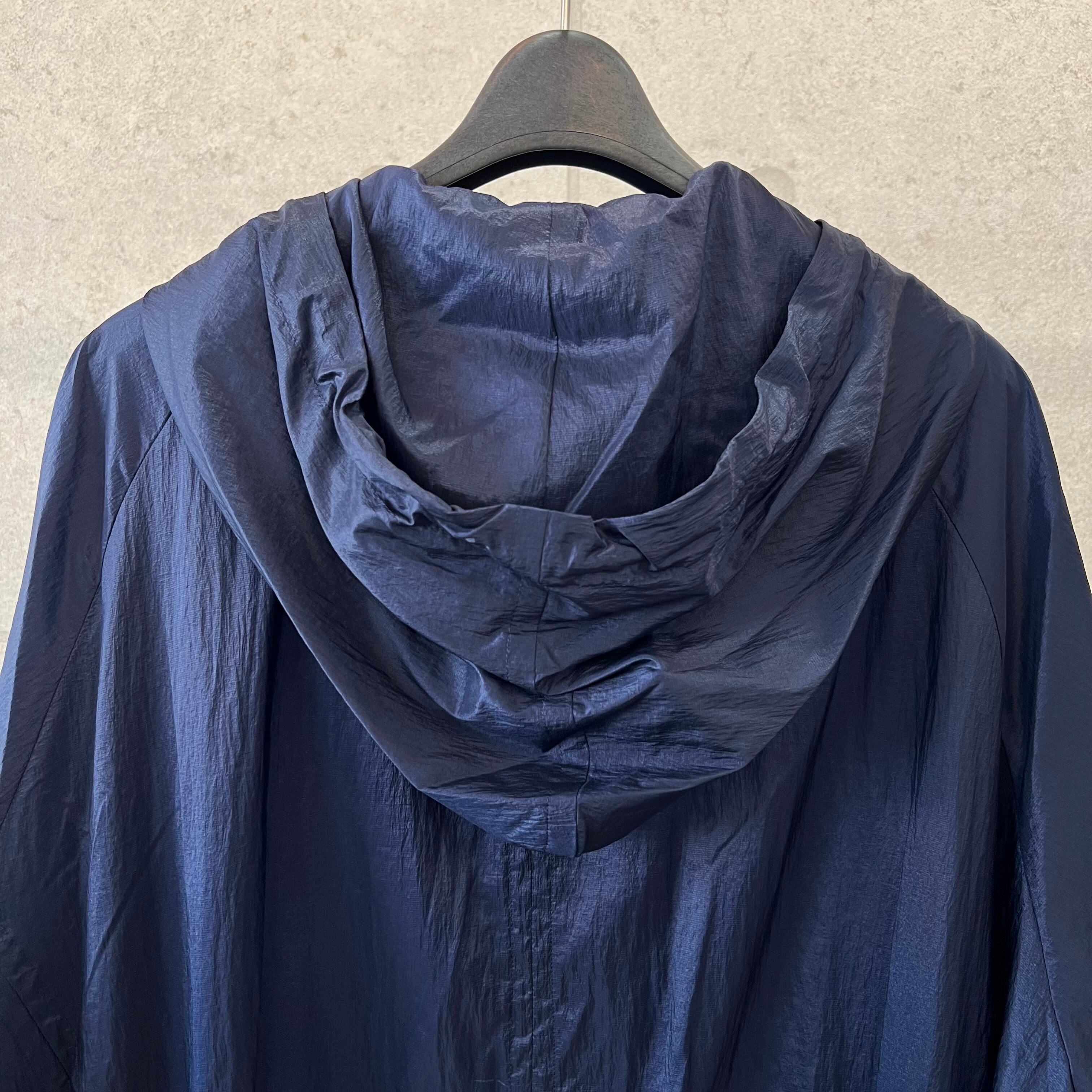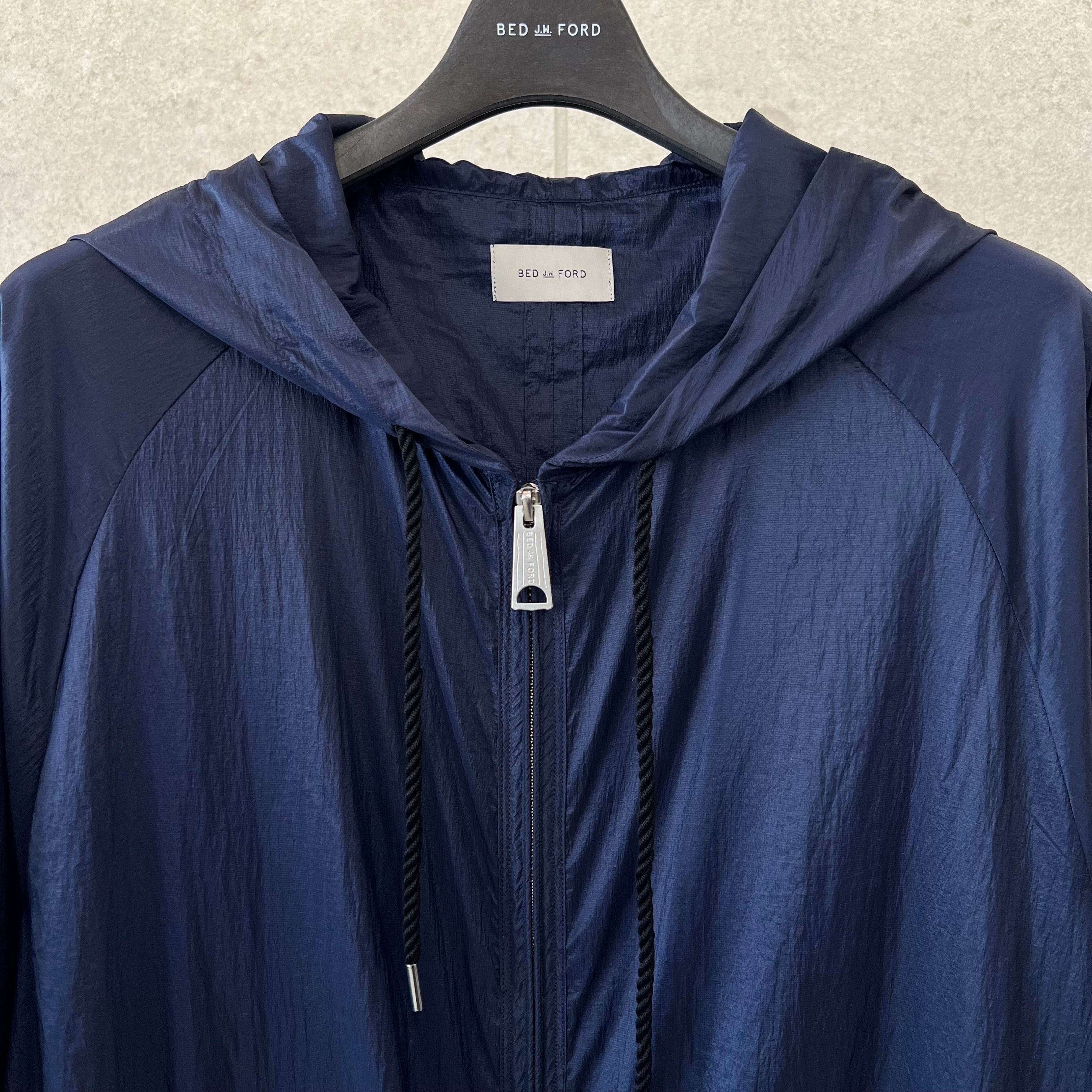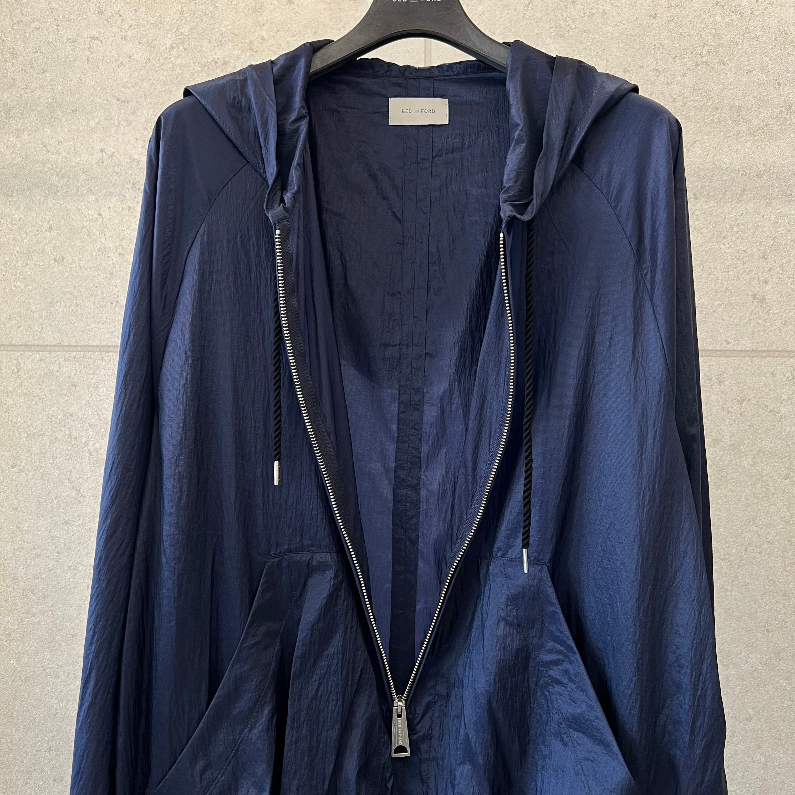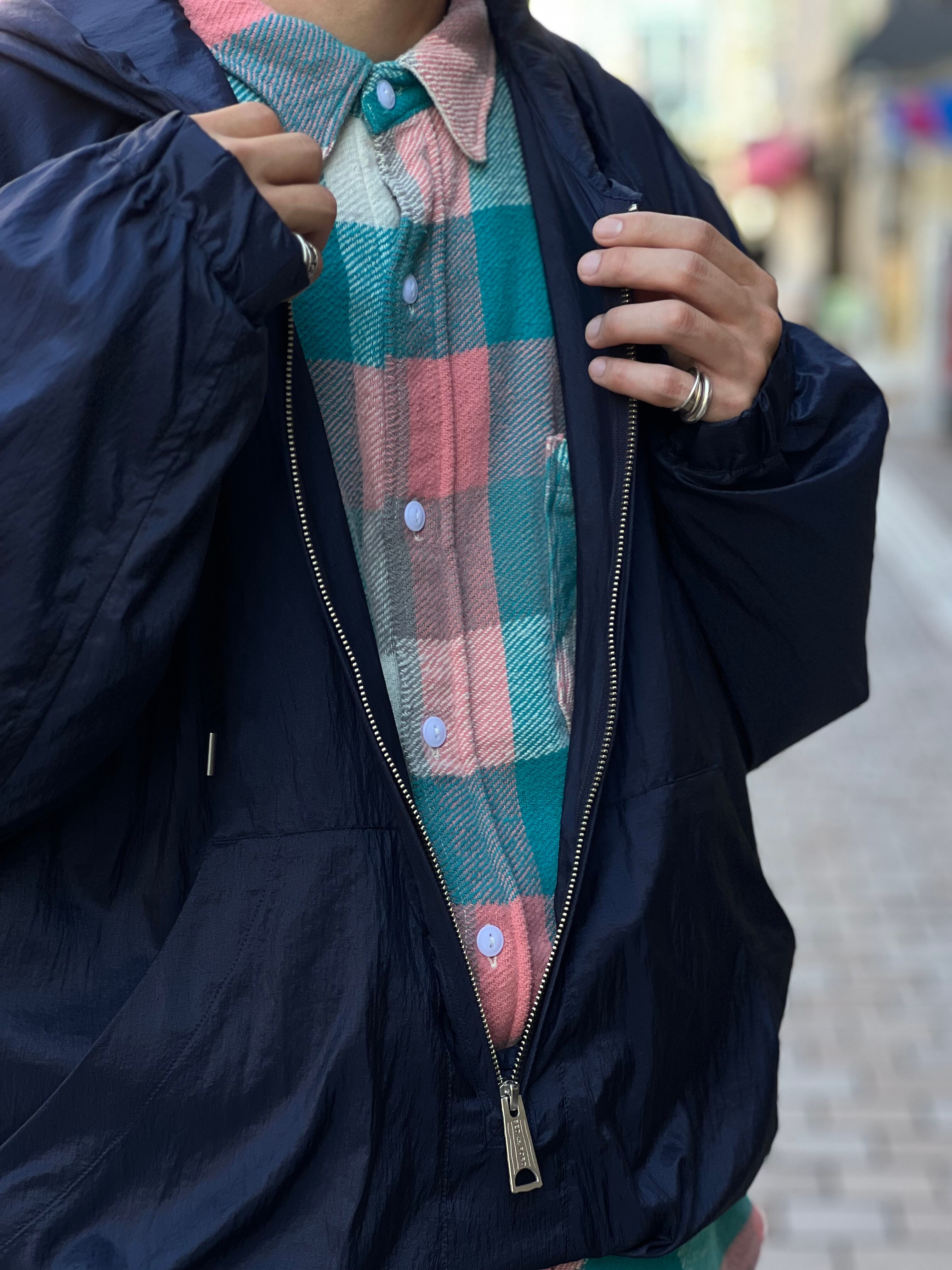 長めのフロントファスナーが目を惹くプルオーバーのナイロンパーカー。