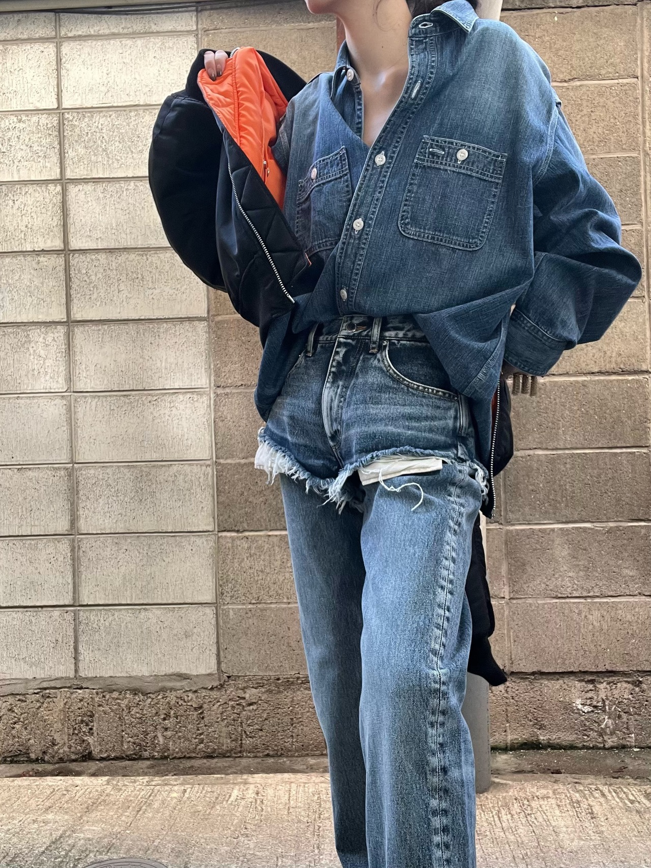 ステッチやエッジに残るあたりが独特な表情をもつ加工デニムを使用。