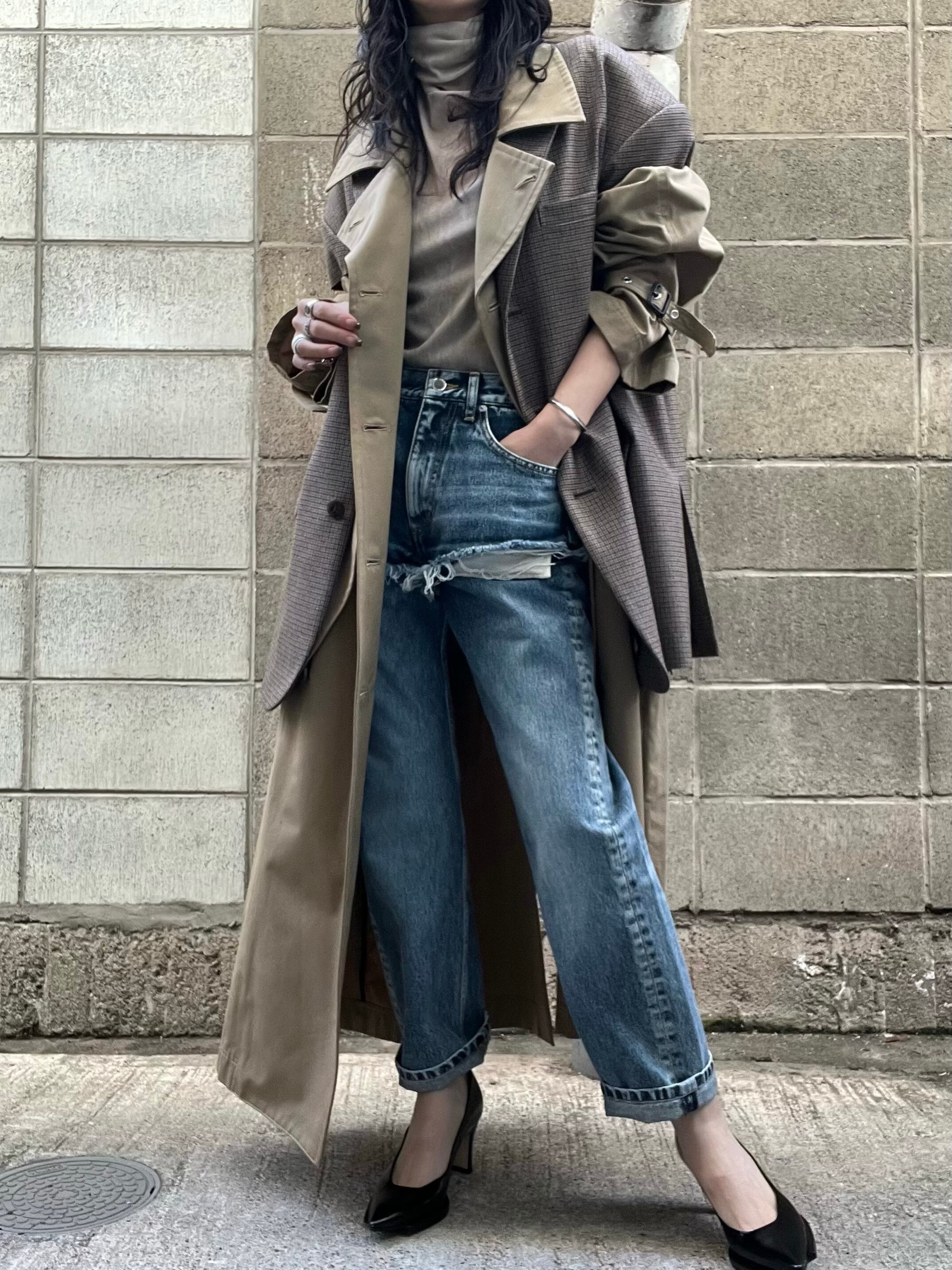 ストレートシルエット。膝裏のあたり加工も特徴的。