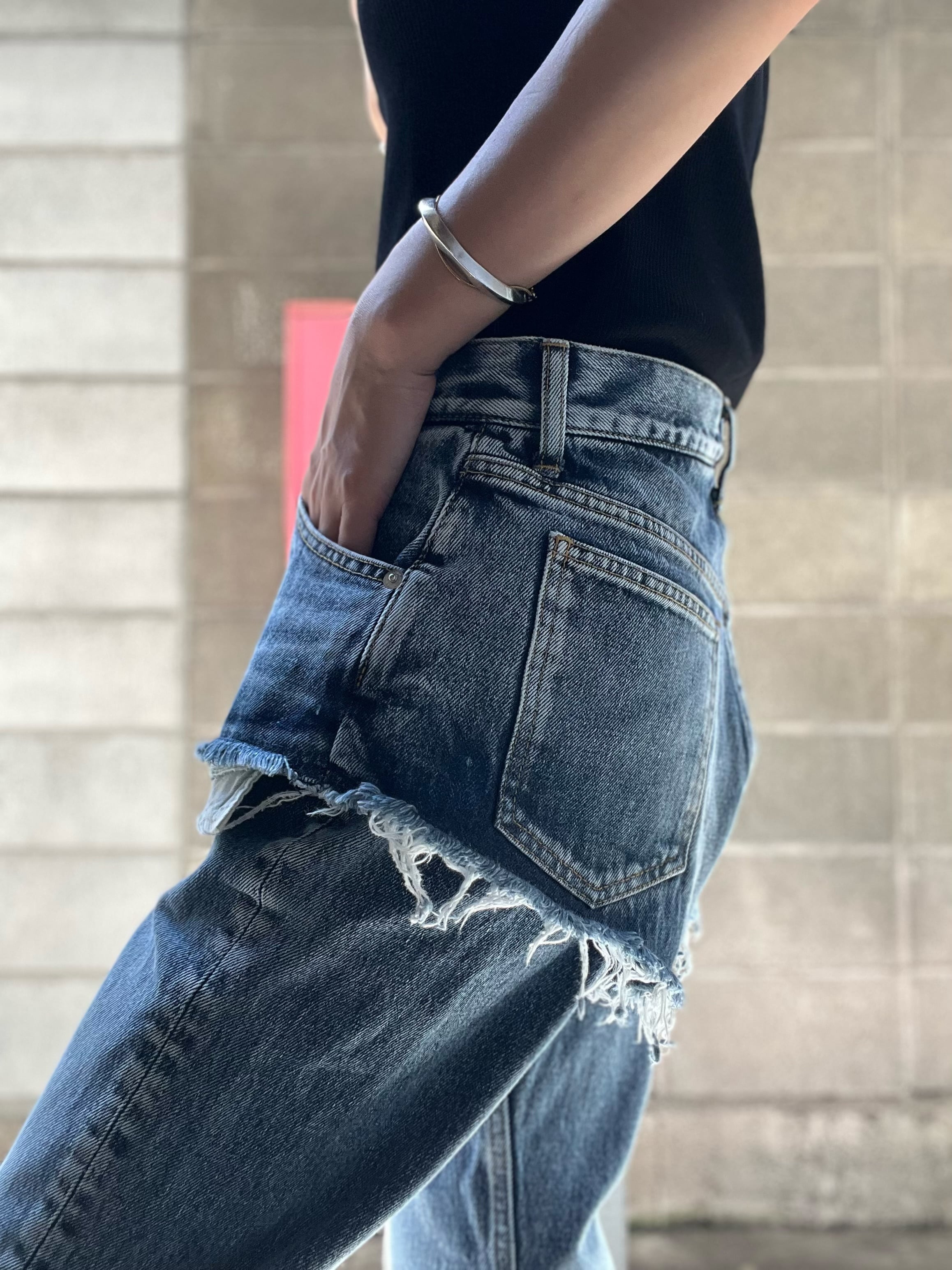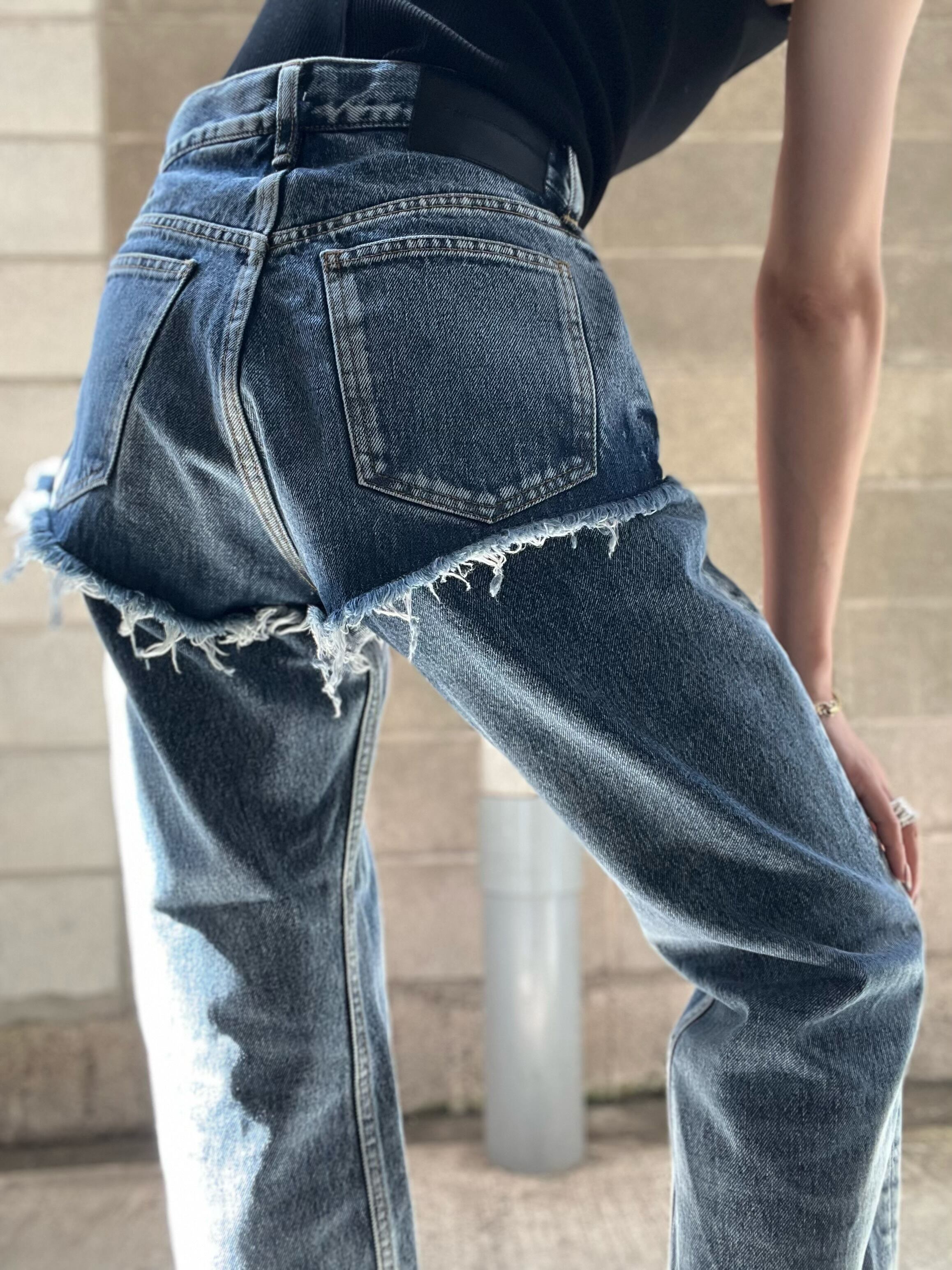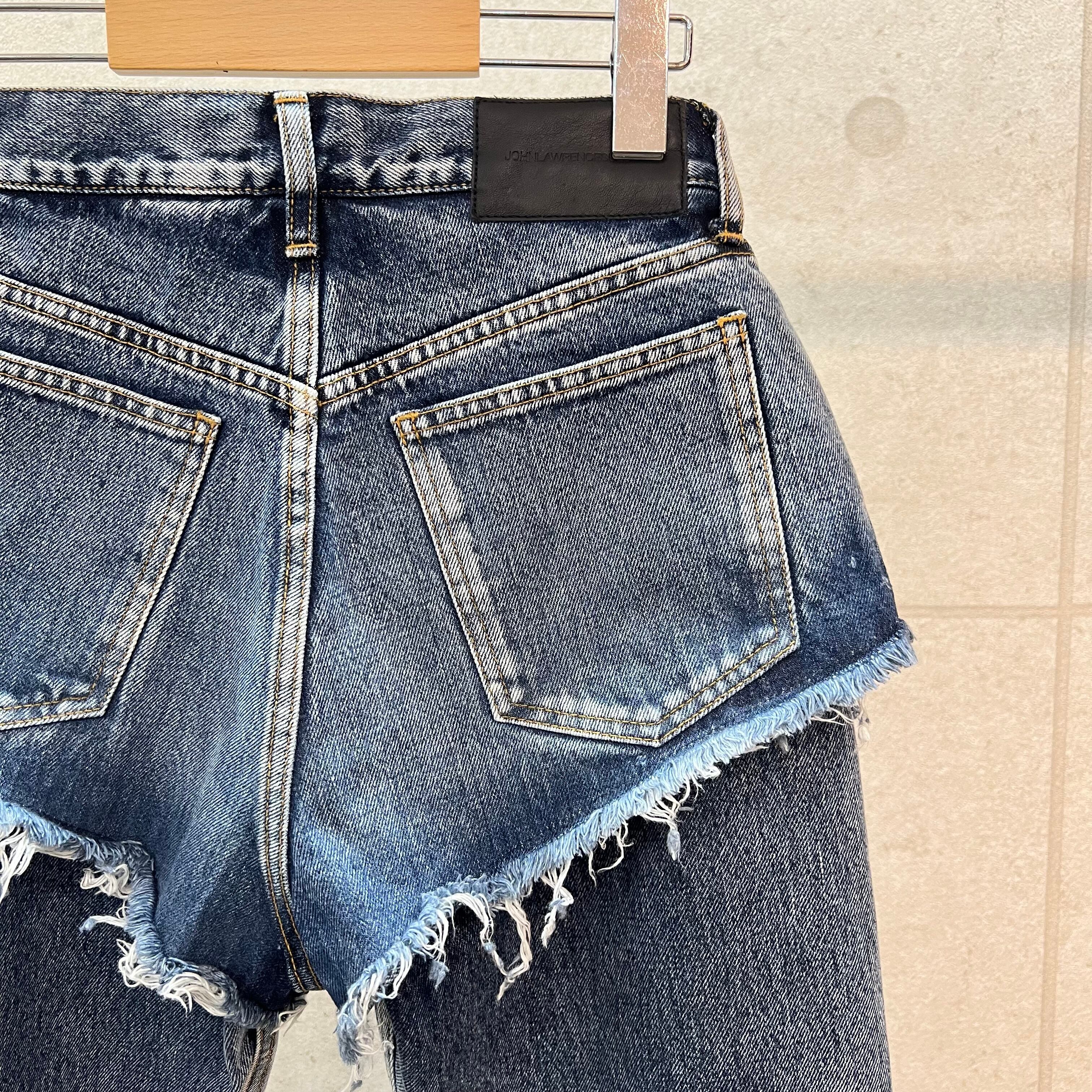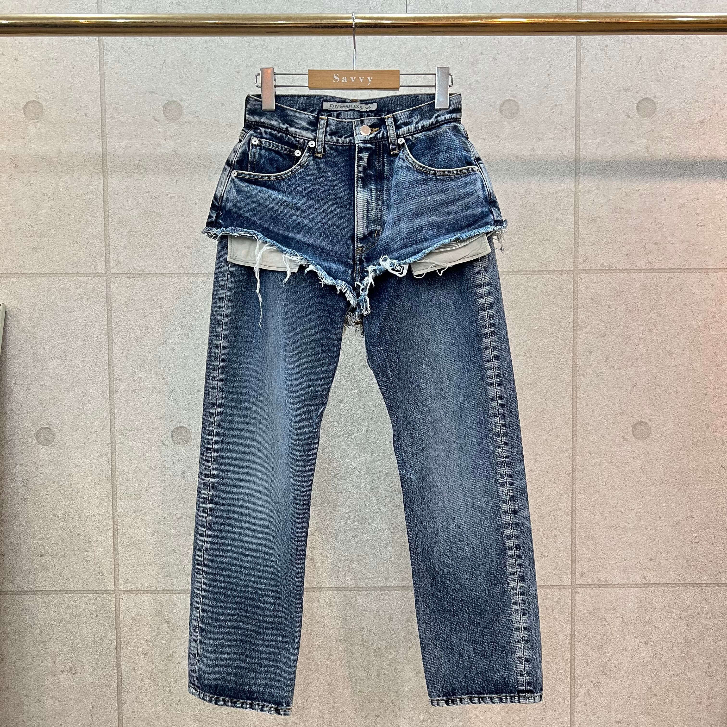 カットアウトしたホットパンツとストレートパンツをレイヤードしたデザインのデニムパンツ。
