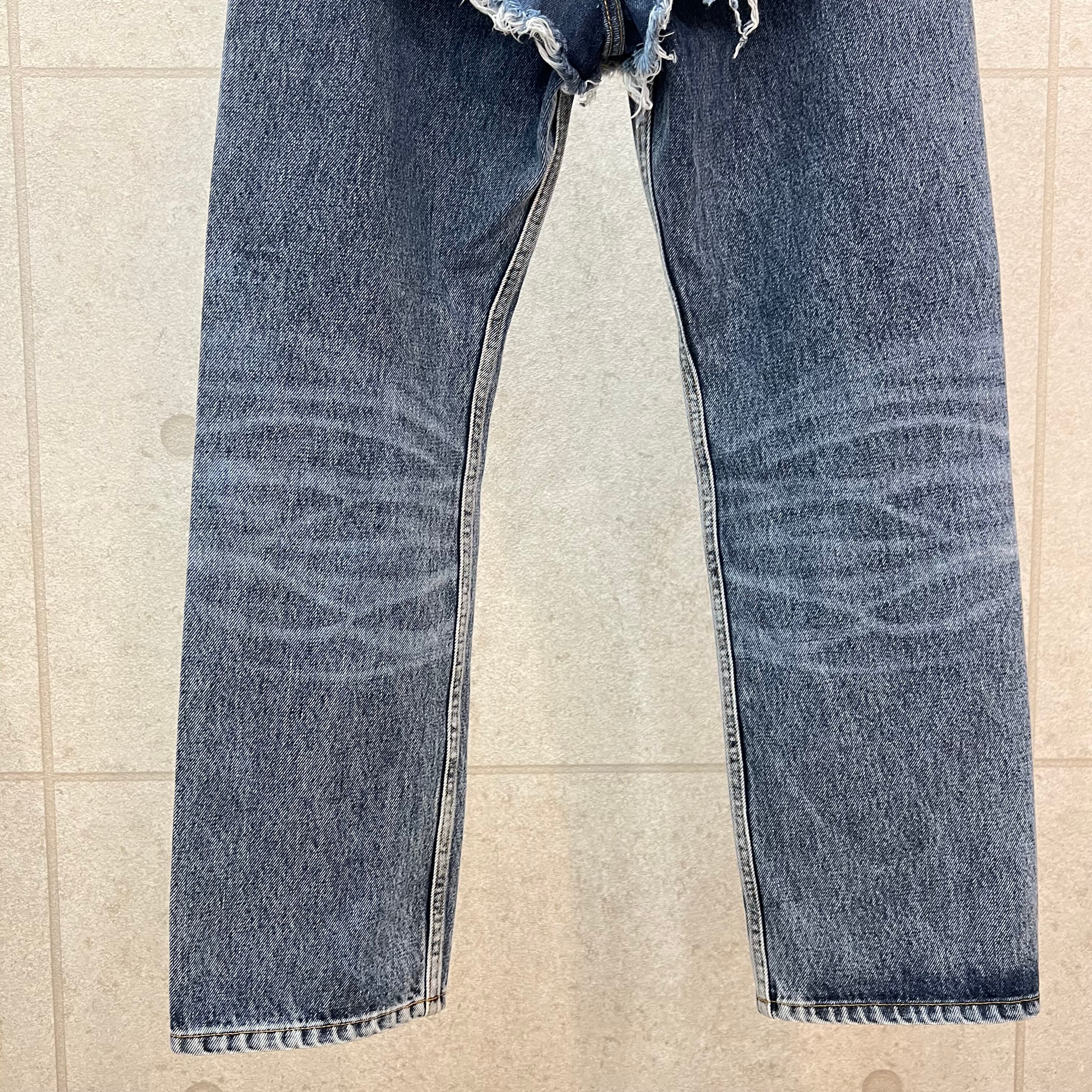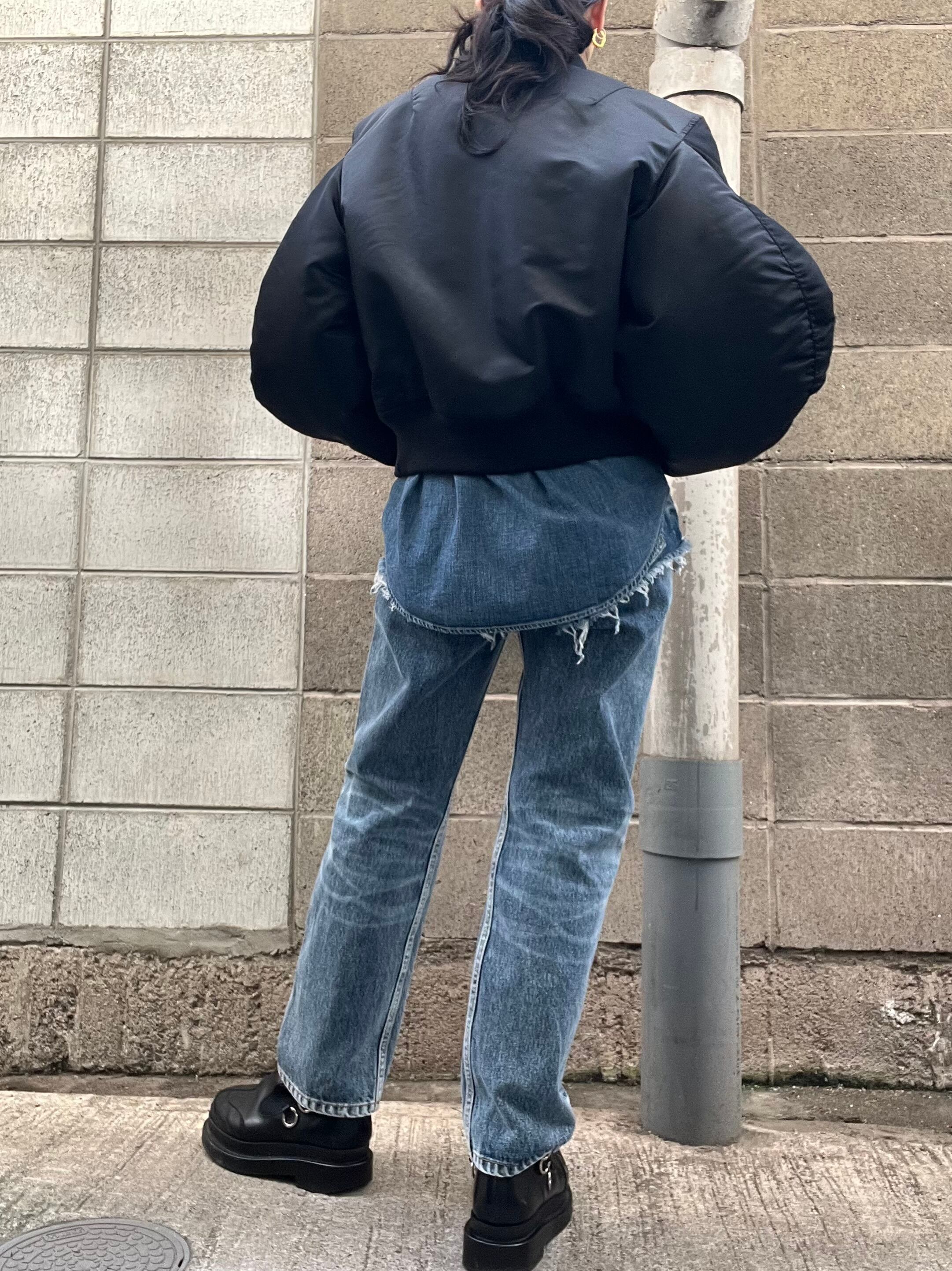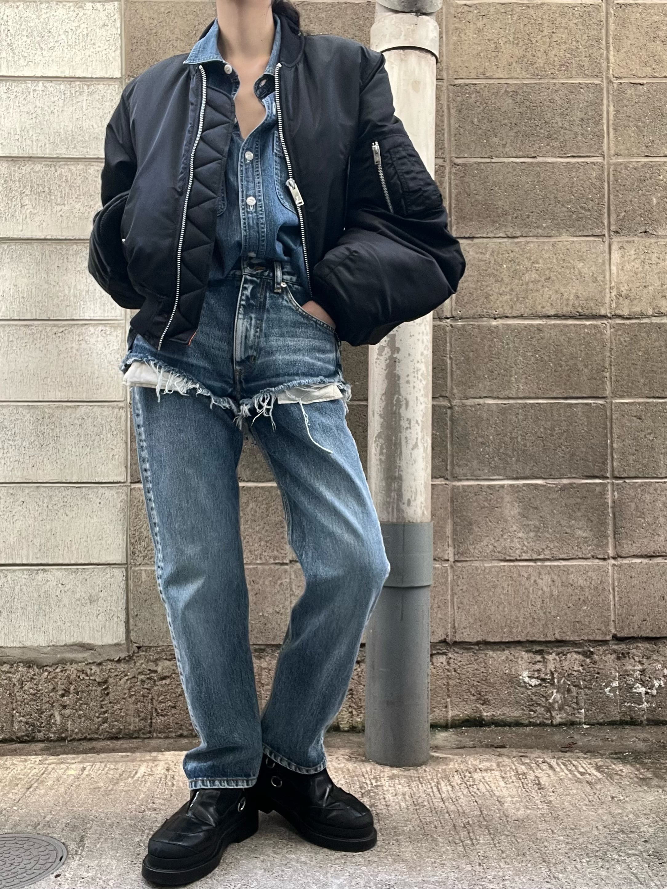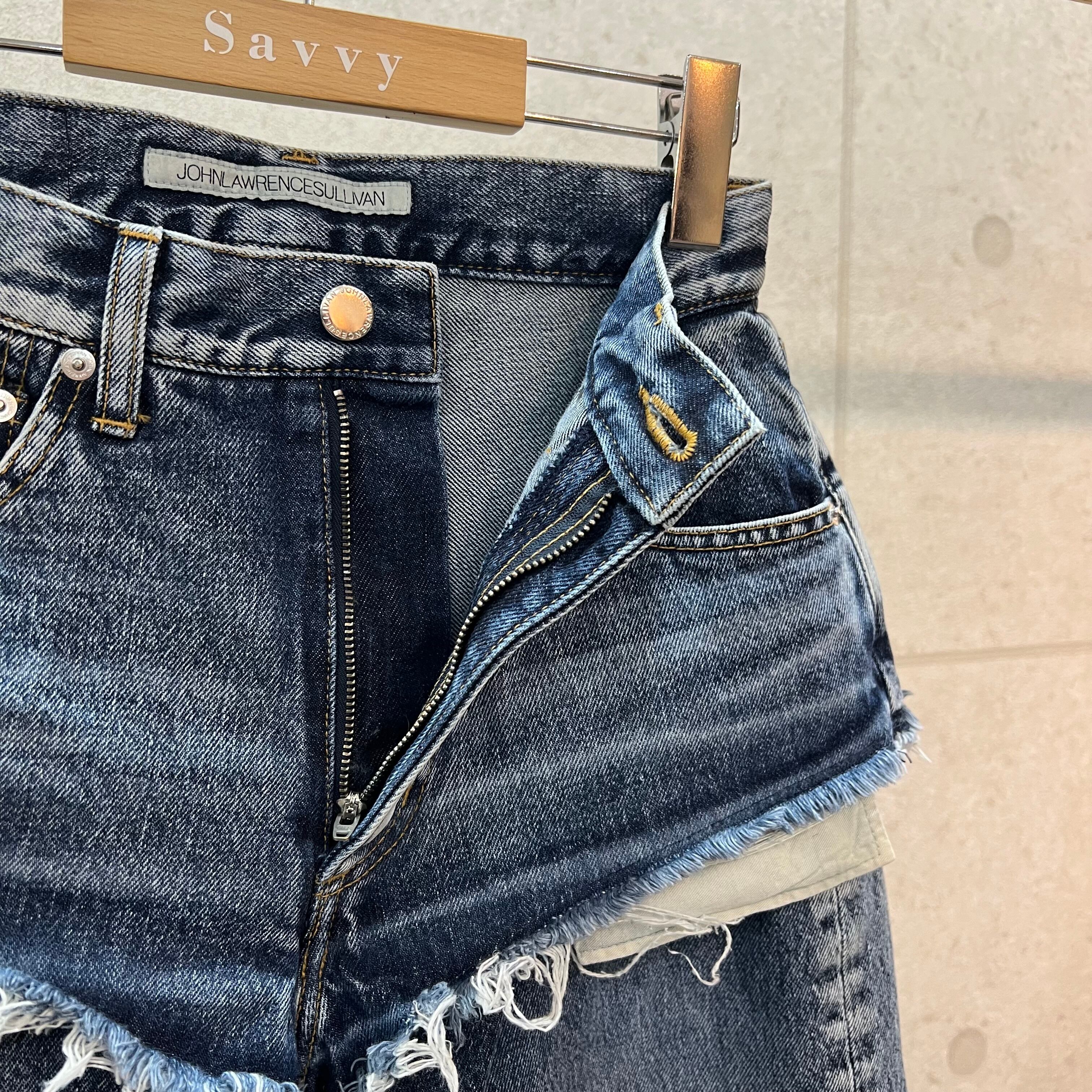 カットアウトしたホットパンツとストレートパンツをレイヤードしたデザインのデニムパンツ。