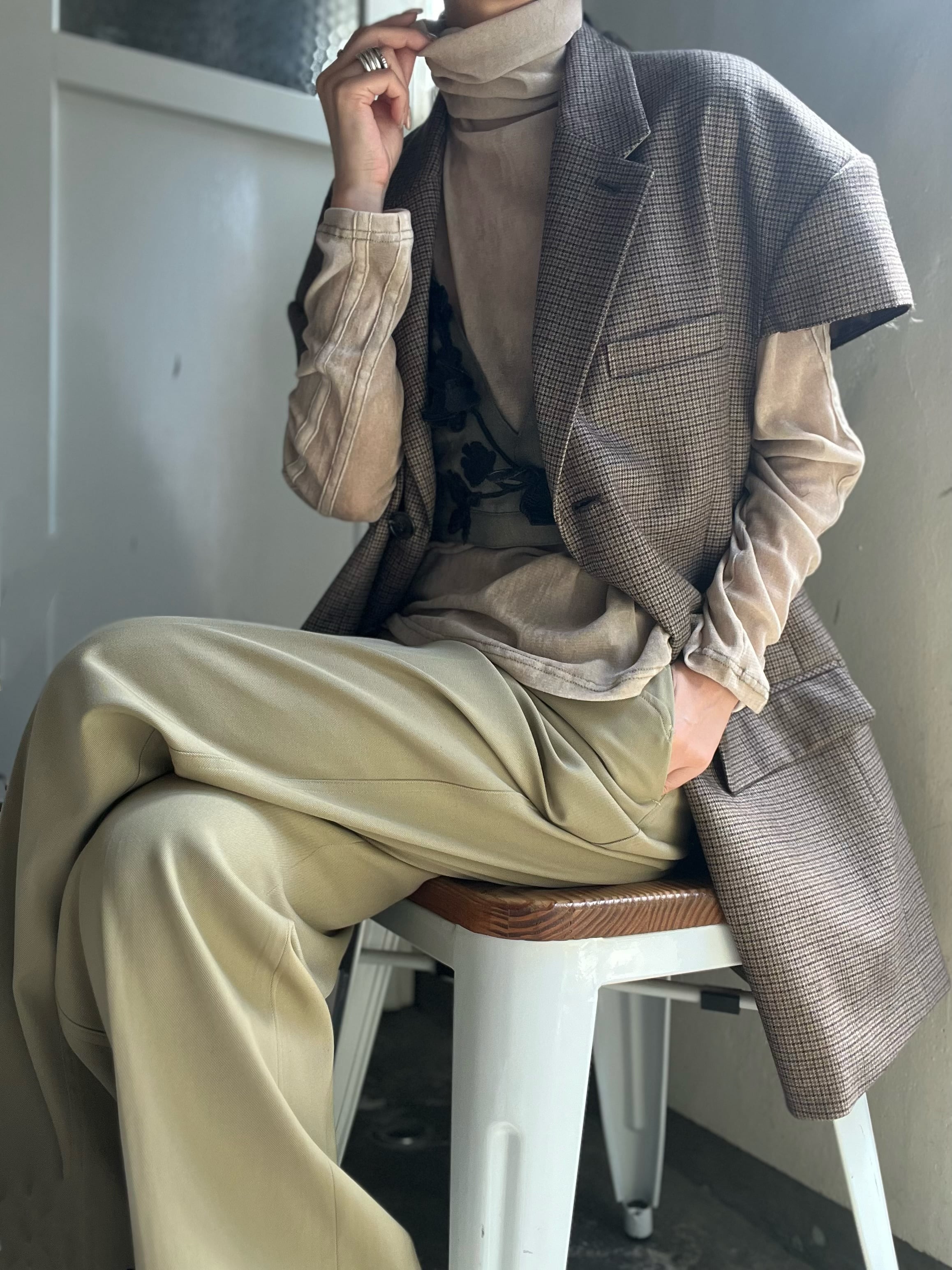 通年着用可能、ニットやジャケットの上にも羽織れる広めのアームホールや大きく開いた後スリットが特徴的です。