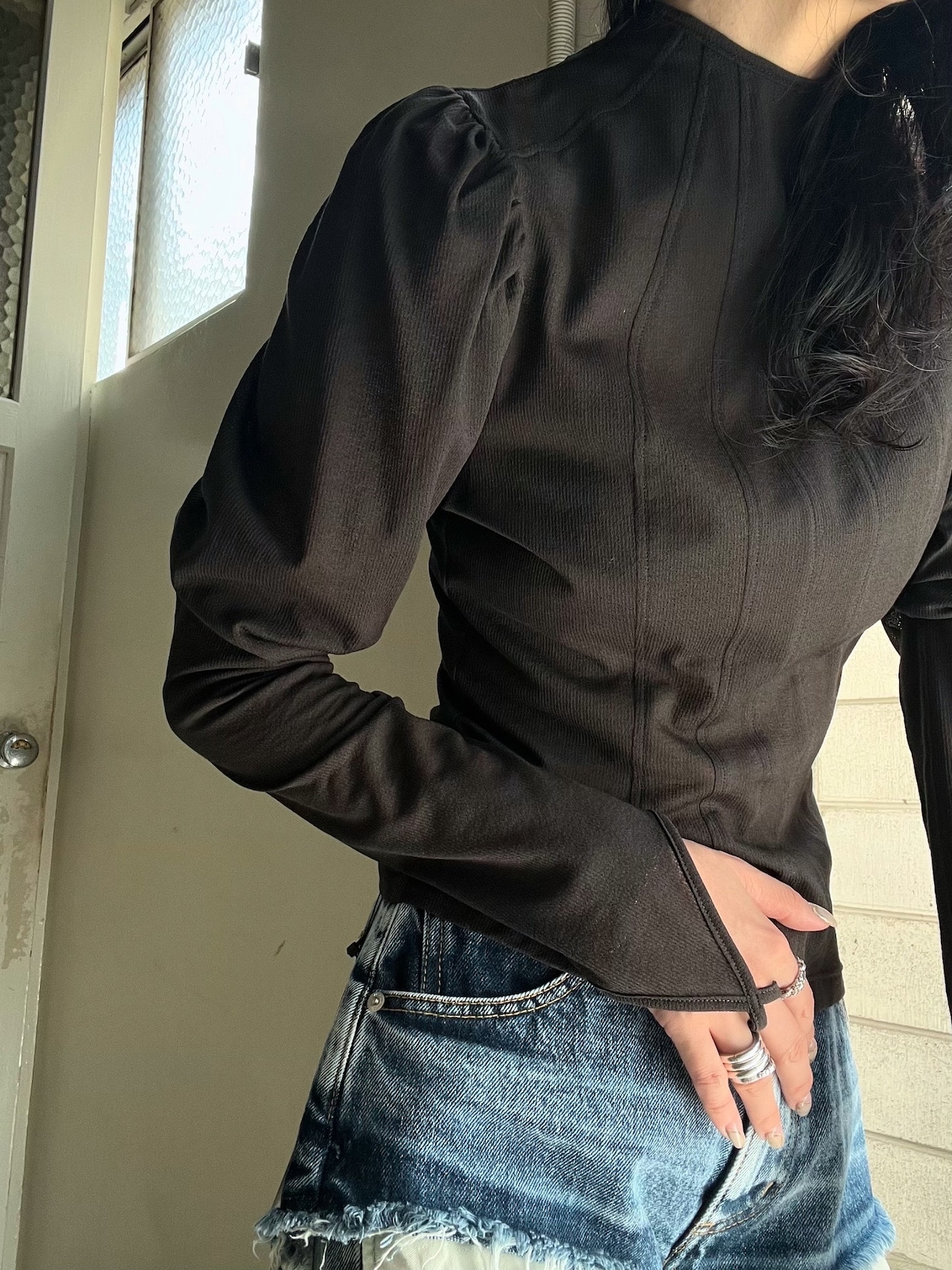 コルセットを思わせる様な身頃のカットラインとボリュームのあるタックパフスリーブが特徴的なモックネックトップス。