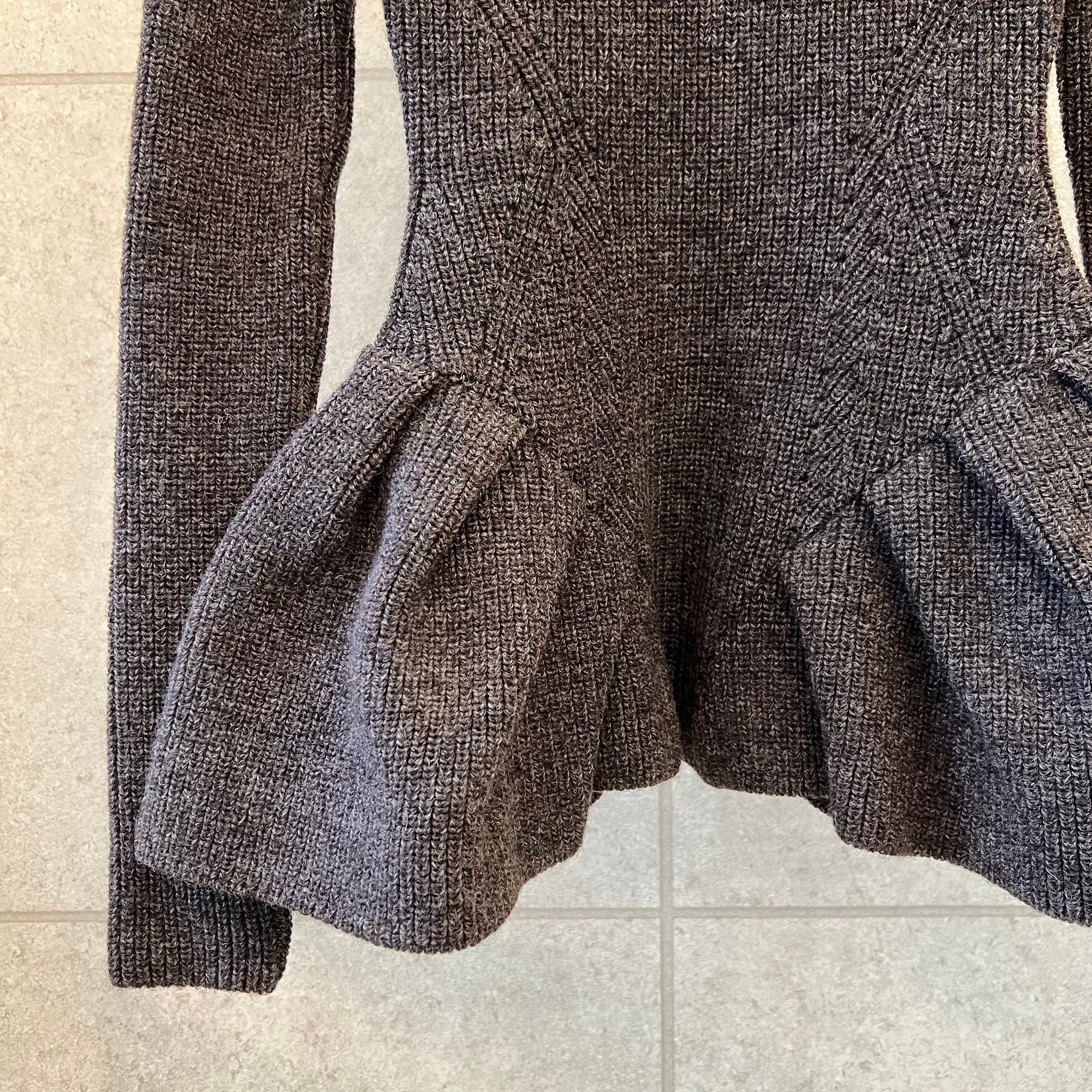 コルセットを連想させる柄編みの身頃に、ドレスの様なフリルパーツが付いたフェティッシュなデザインのぺプラムニットセーター。