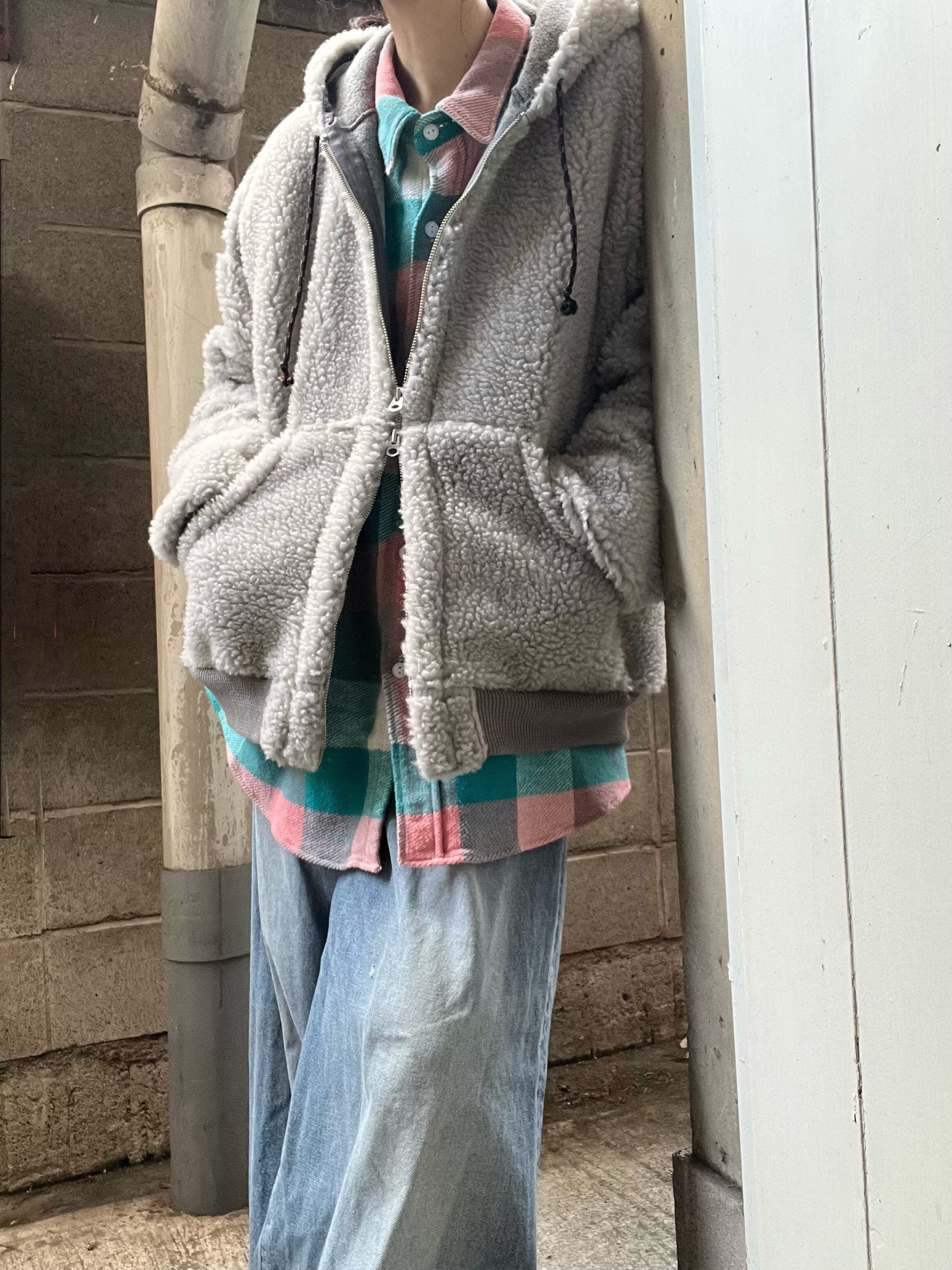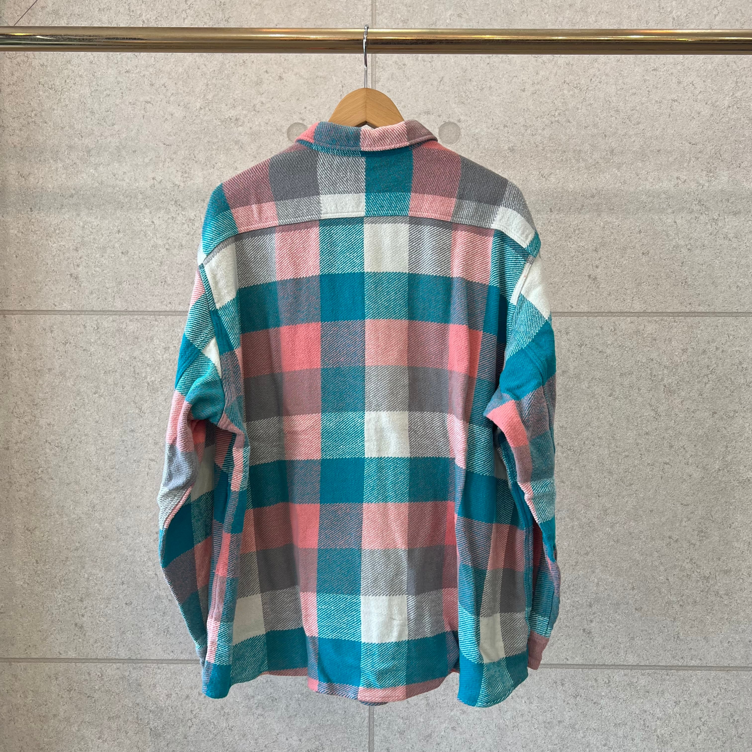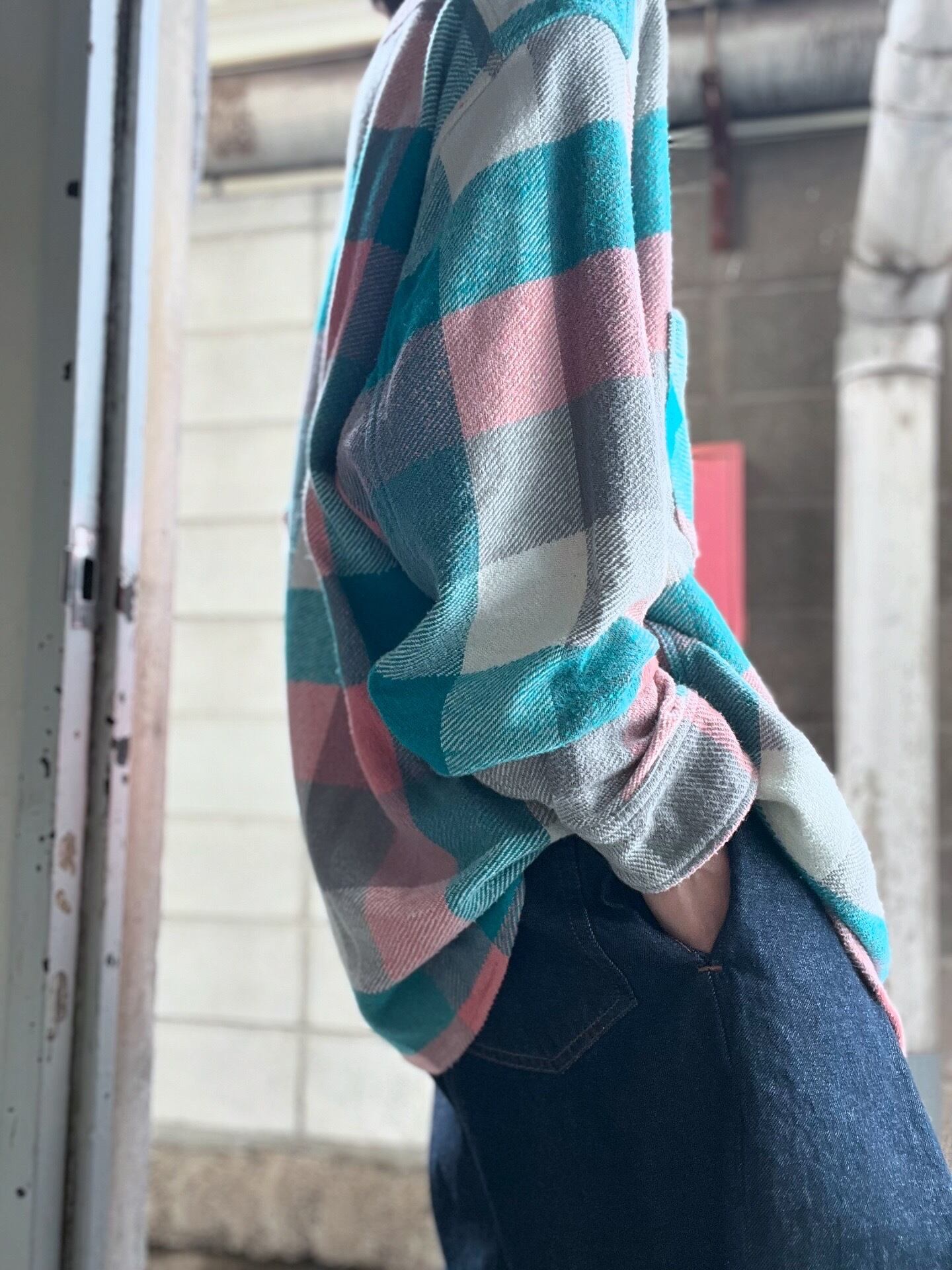 オリジナルで作成したカラフルなブラックチェックシャツ。古い時代のワークシャツの中でも稀に存在するファッション的なカラーリングのシャツをサンプリング。太番手のムラ糸に深めの起毛。加工でさらに起毛を飛ばしています。シルエットは16ハーフの緩めシルエットです。