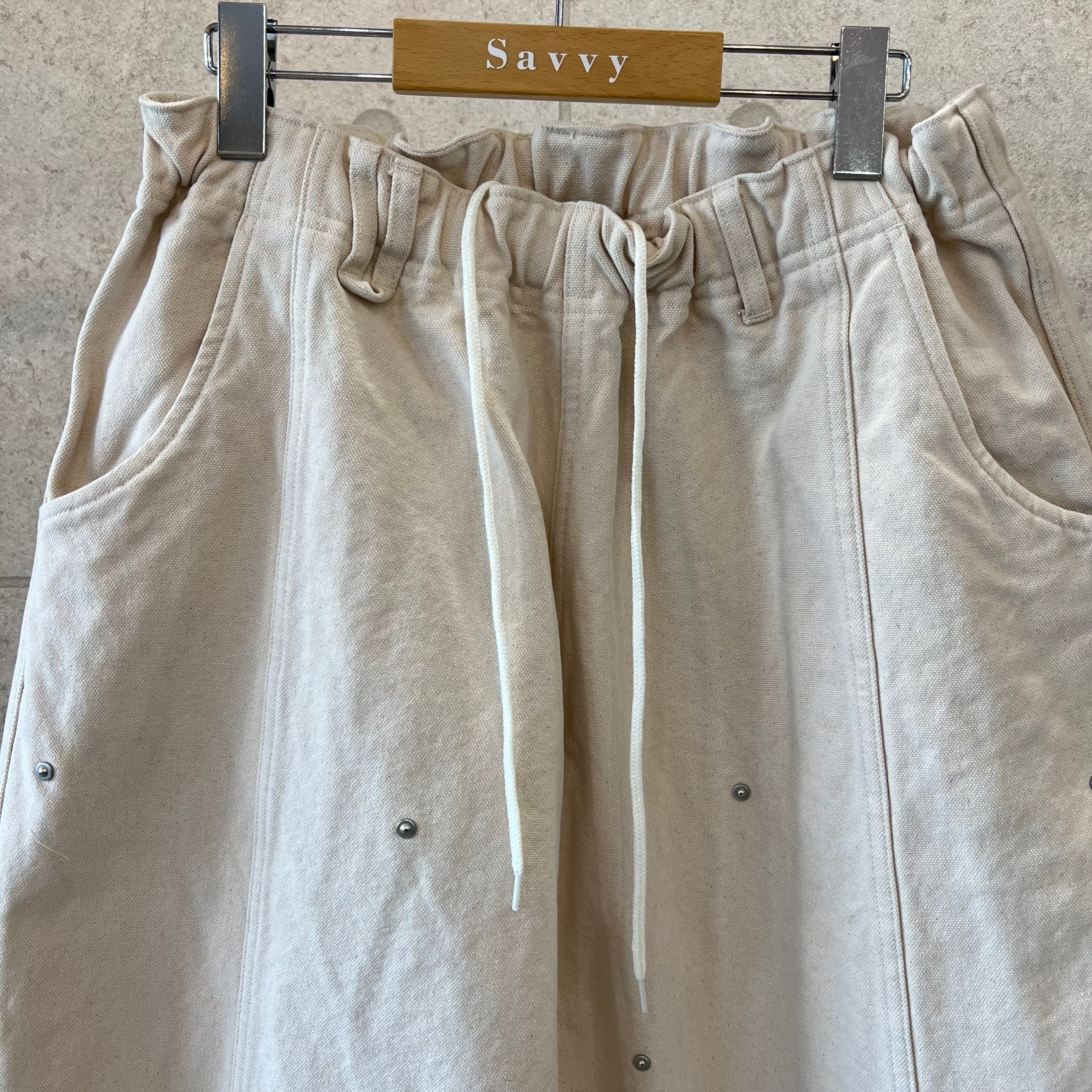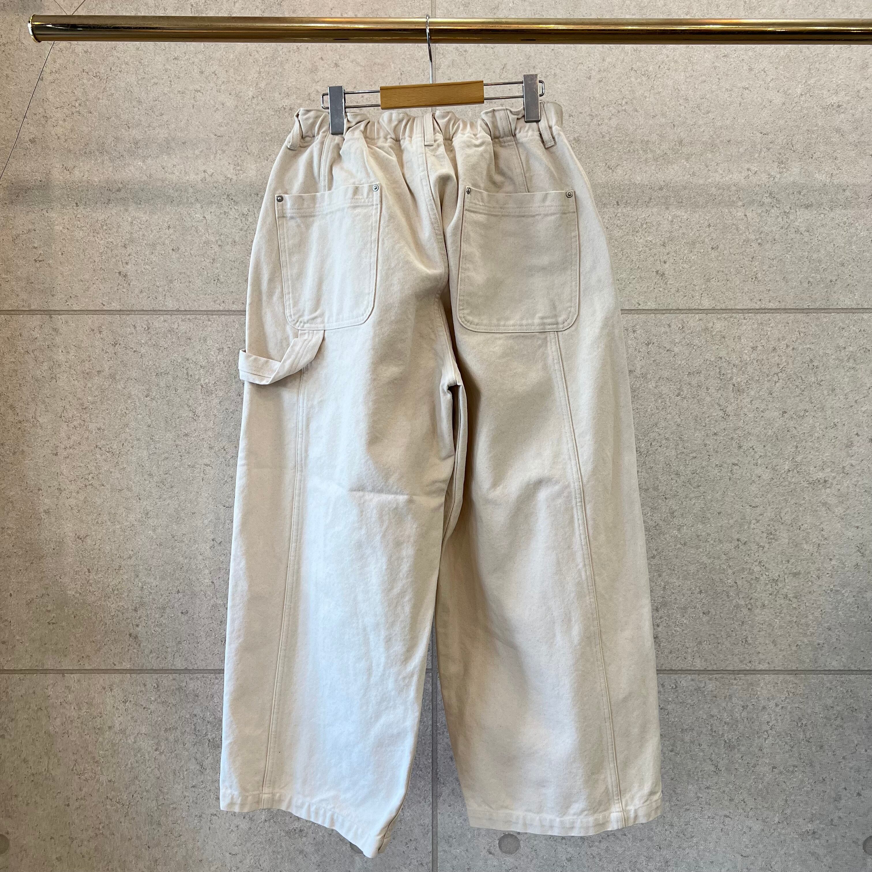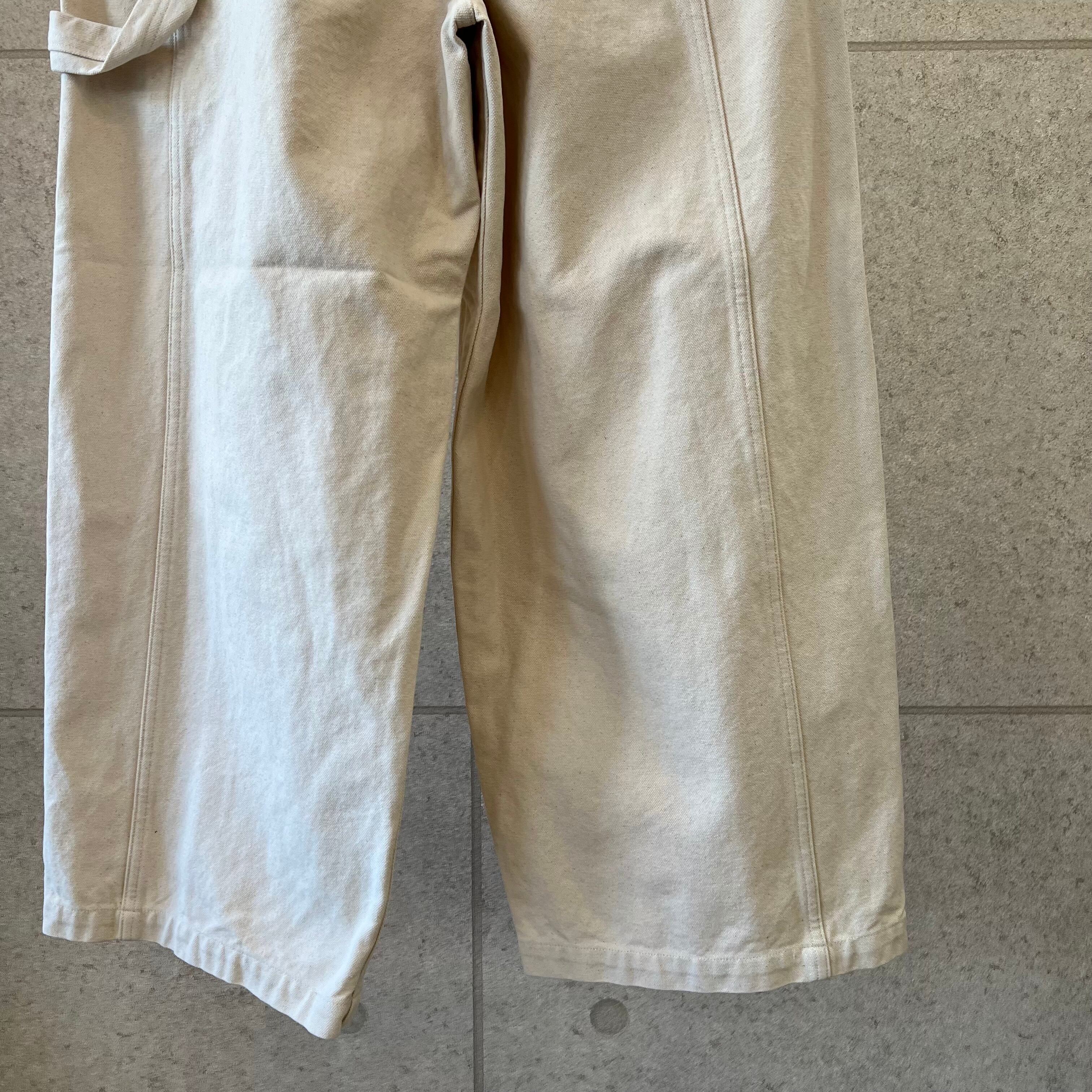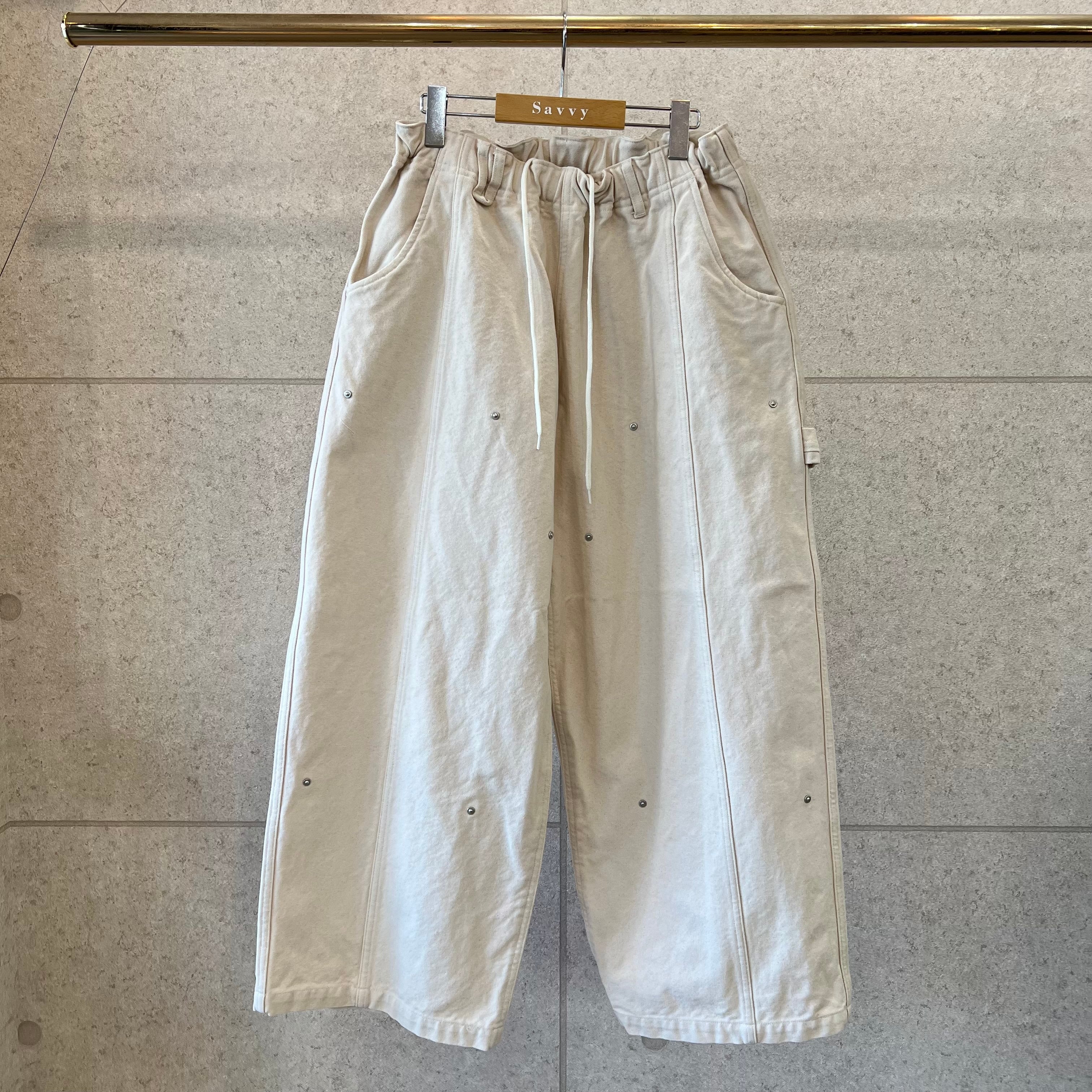タフなコットンヘヴィーダック生地を採用したVOO解釈のワークパンツ。太型バルーンシルエットをベースとしつつ、ペインターパンツを連想する箇所にリベットを打ったデザインとディテールが融合した仕上がりとなります。白顔料染め加工を施す事により若干の白茶け感と、ハリを強化したアイテムです。