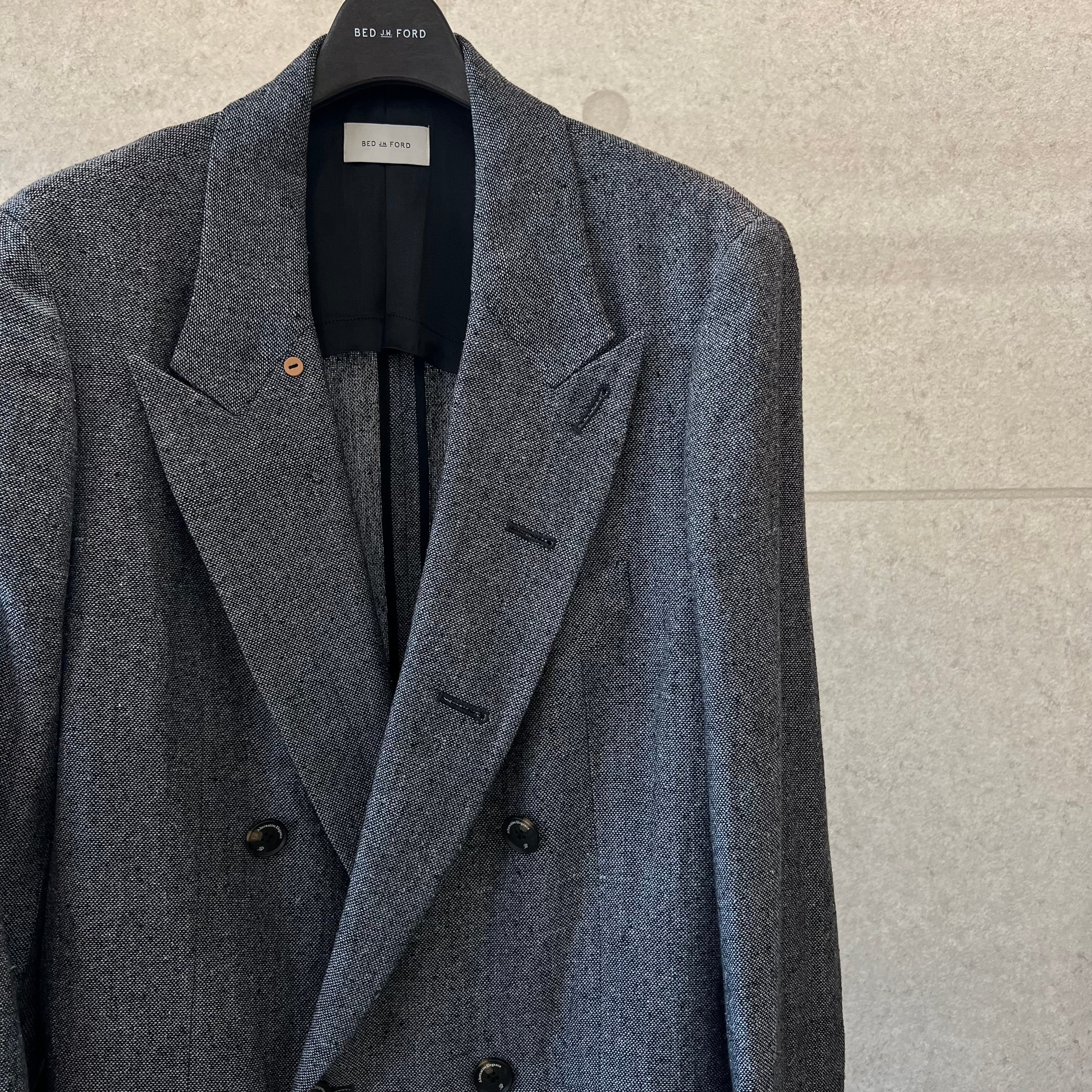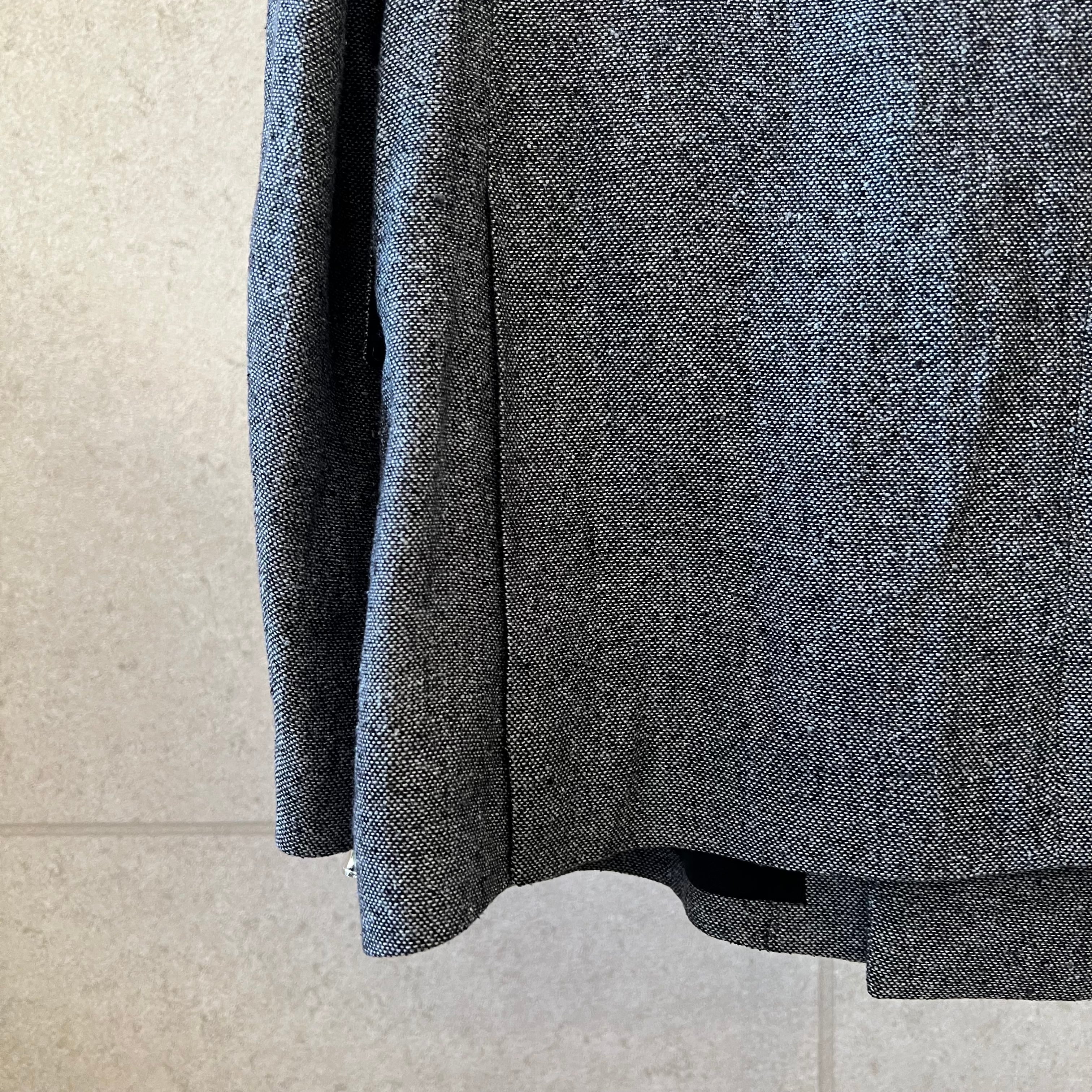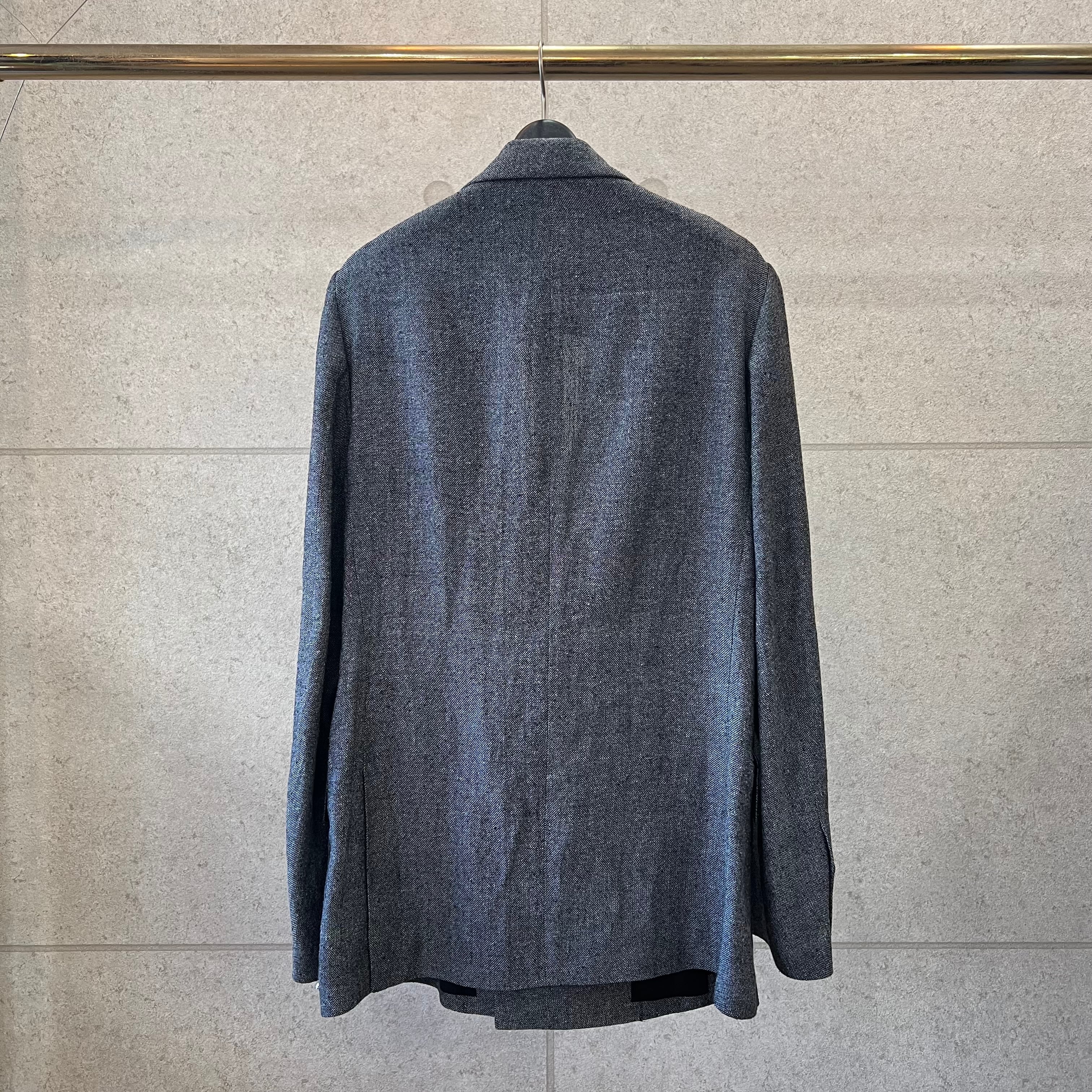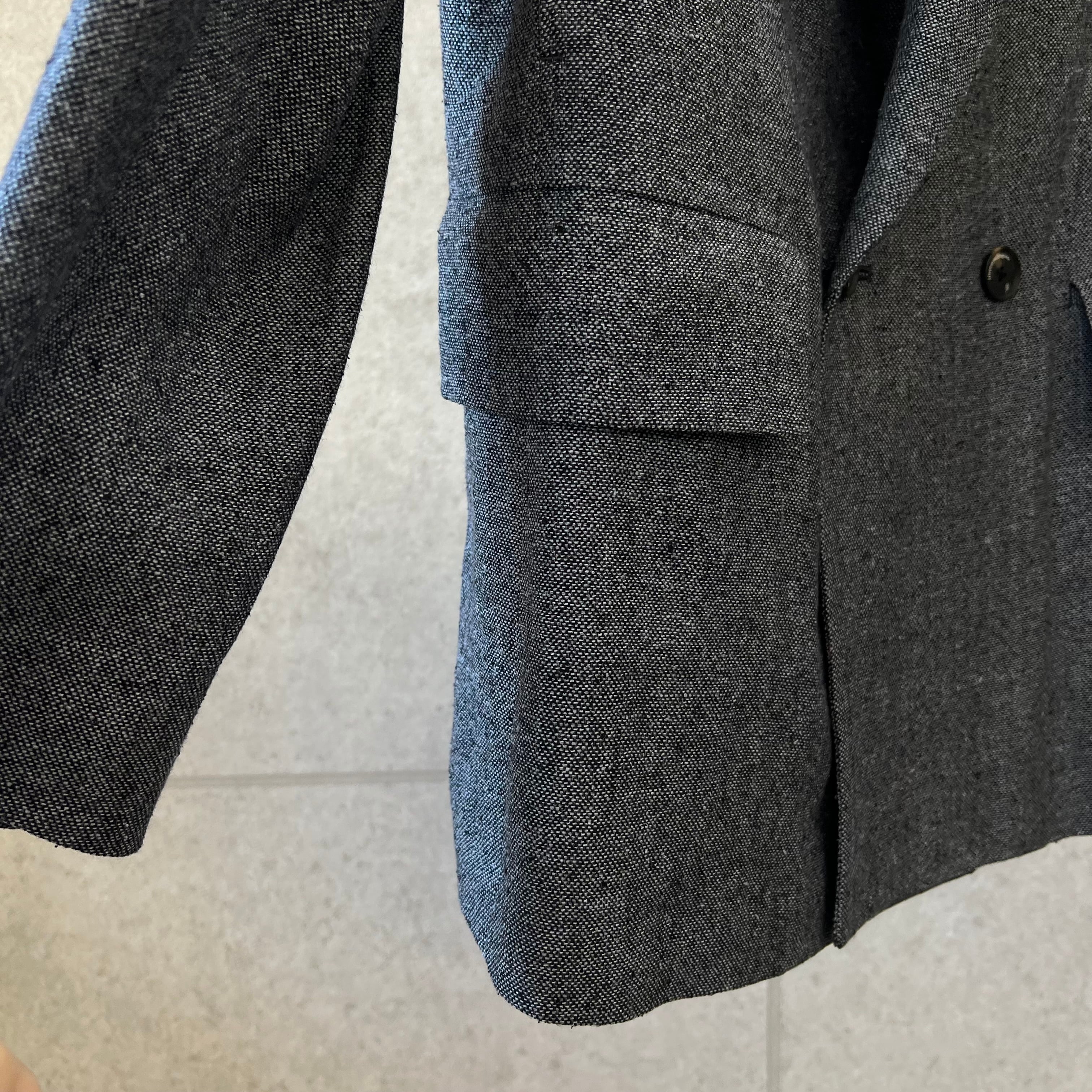 クラシカルな雰囲気が漂う、ダブルブレストのジャケット。釦位置は低めにとり、Vゾーンが広く見えるデザインです。脇下にシームポケットがあります。衿を立てて着用することも可能。袖の内側には、ブランドオリジナルの平ゴムが付いており、腕まくりがしやすい仕様になっています。野蚕のノイルシルクを使用した糸を、手で最大限に撚り上げた強撚シルク生地です。ナチュラルで不揃いな糸を手で撚ることで、ネップのある表情豊かな生地となります。