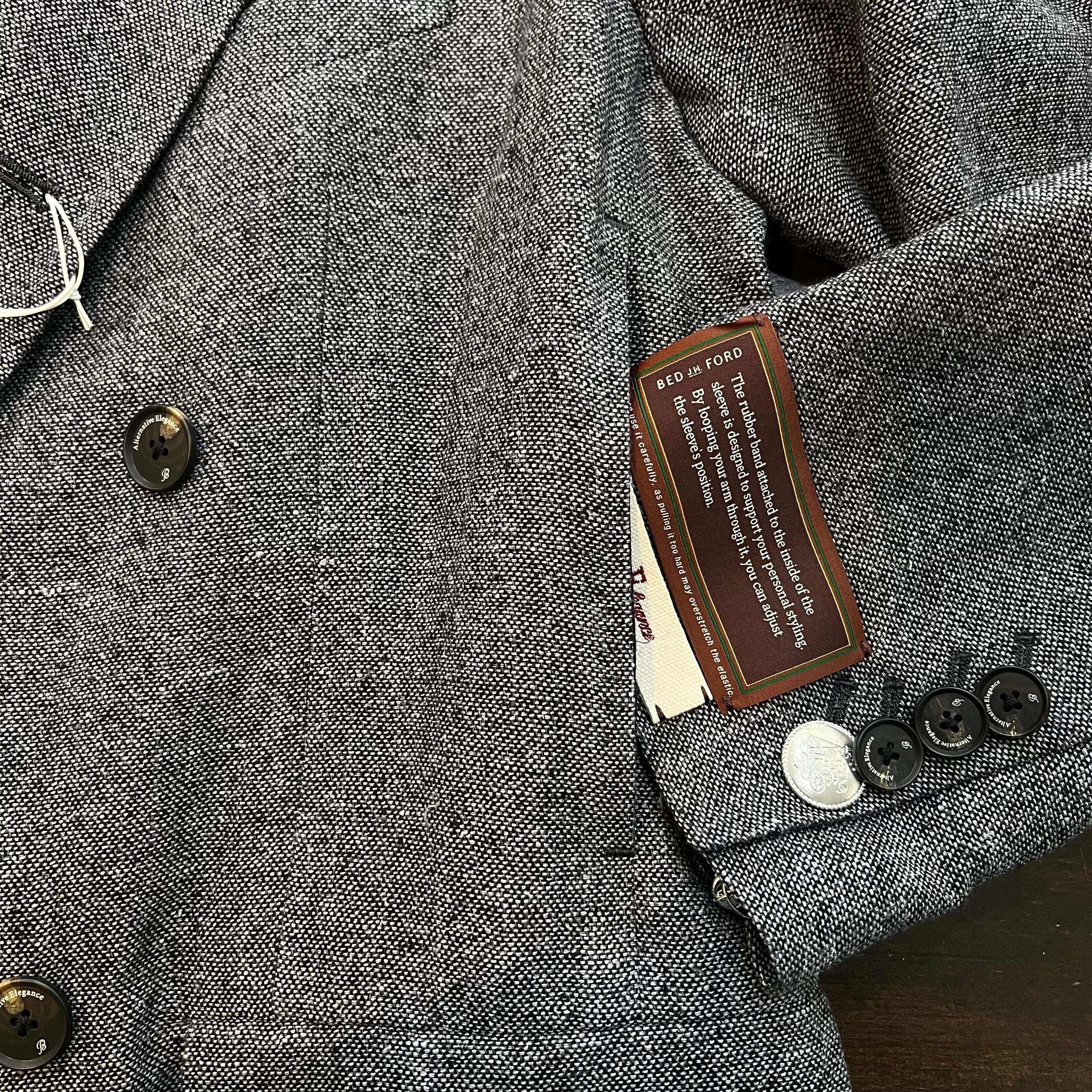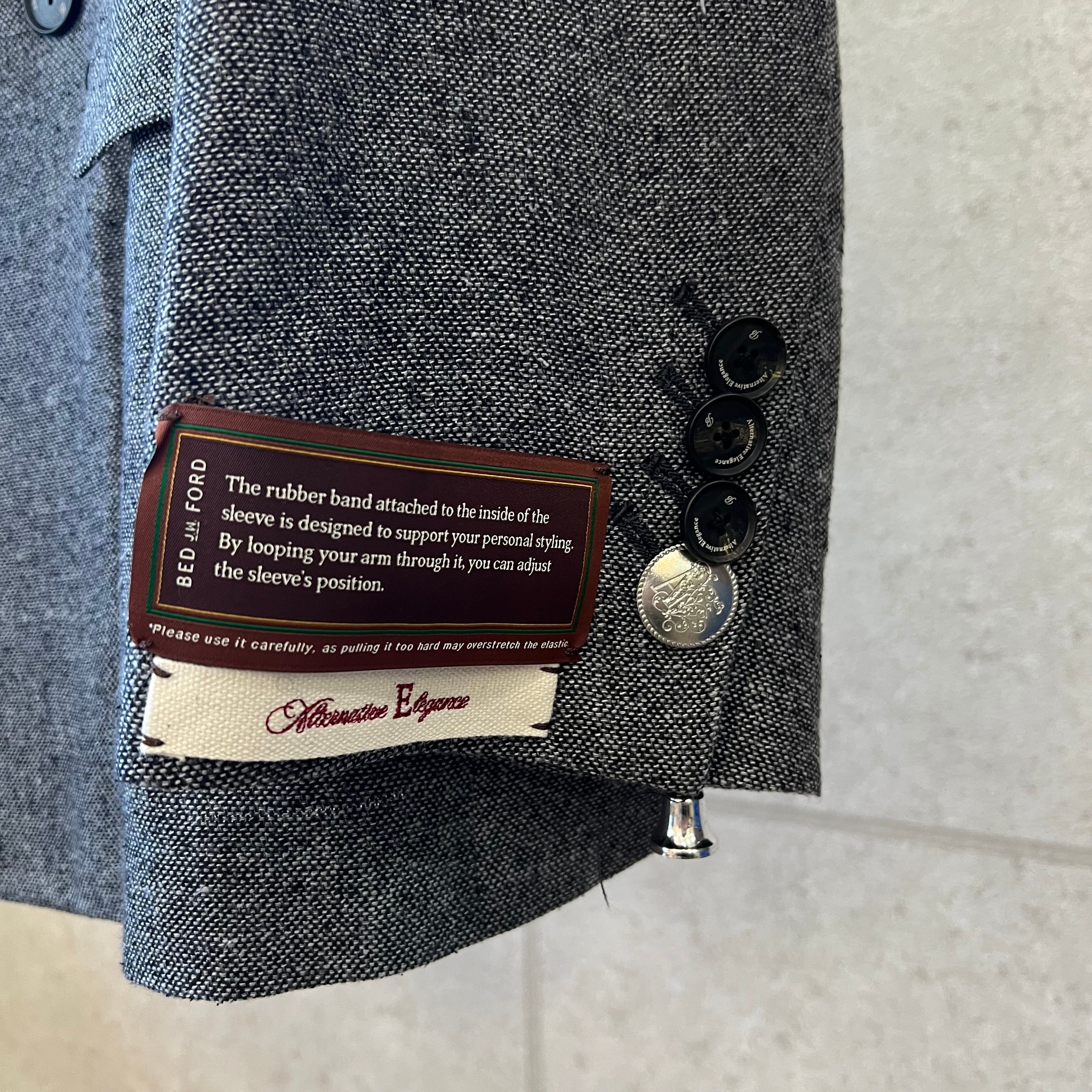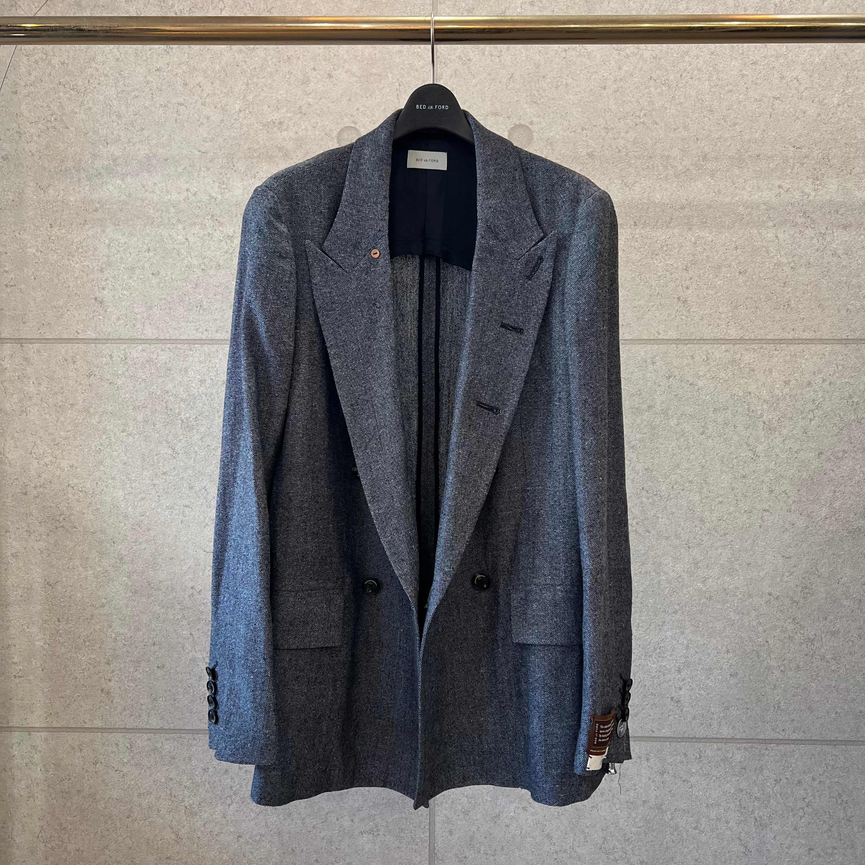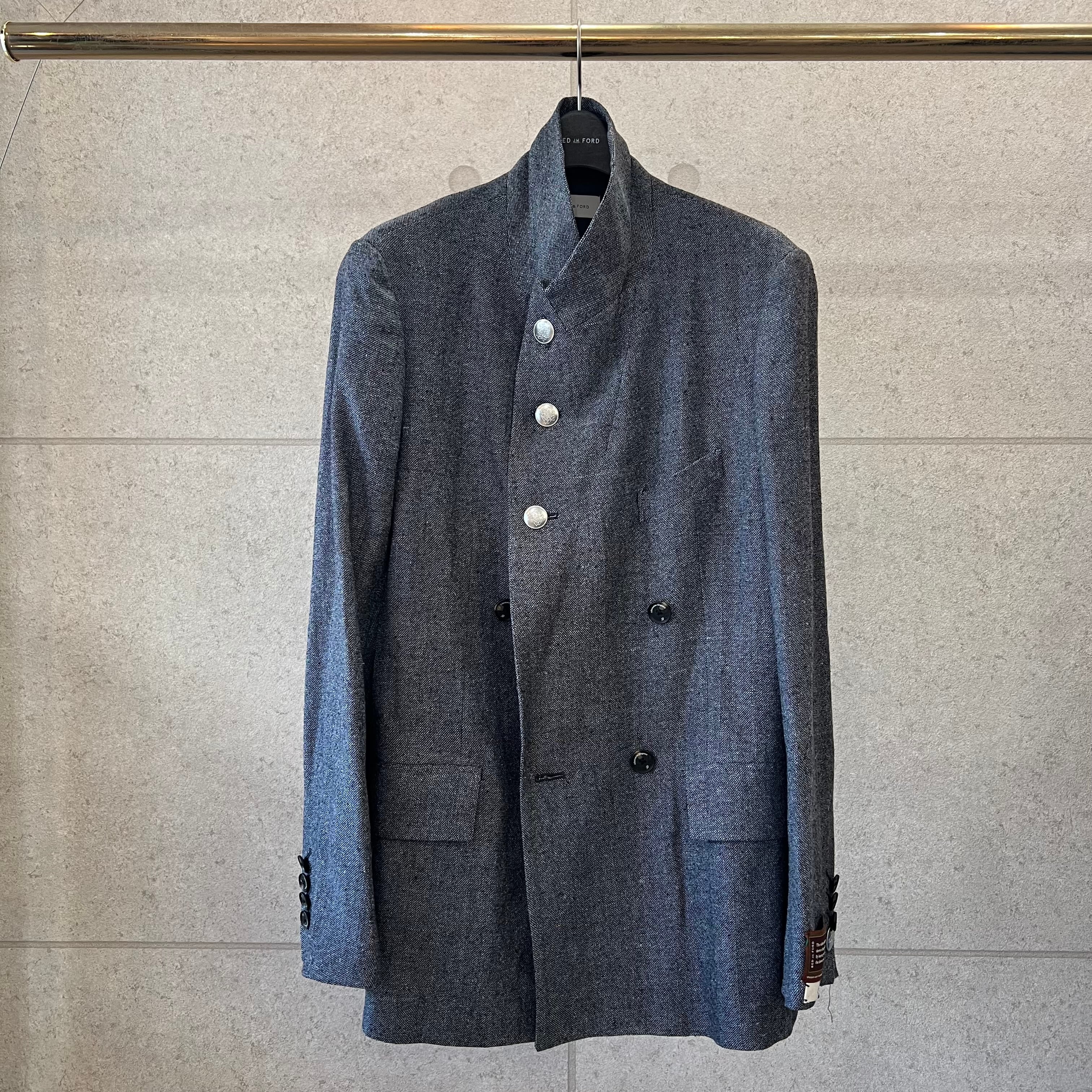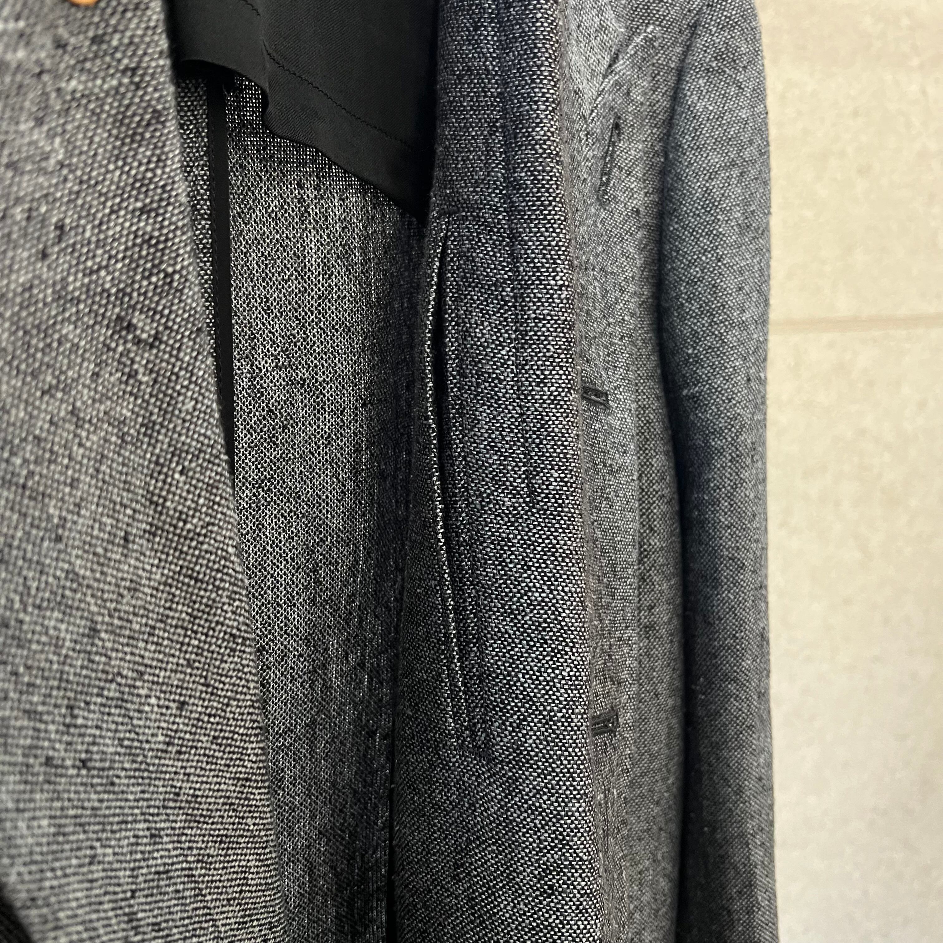 クラシカルな雰囲気が漂う、ダブルブレストのジャケット。釦位置は低めにとり、Vゾーンが広く見えるデザインです。脇下にシームポケットがあります。衿を立てて着用することも可能。袖の内側には、ブランドオリジナルの平ゴムが付いており、腕まくりがしやすい仕様になっています。野蚕のノイルシルクを使用した糸を、手で最大限に撚り上げた強撚シルク生地です。ナチュラルで不揃いな糸を手で撚ることで、ネップのある表情豊かな生地となります。