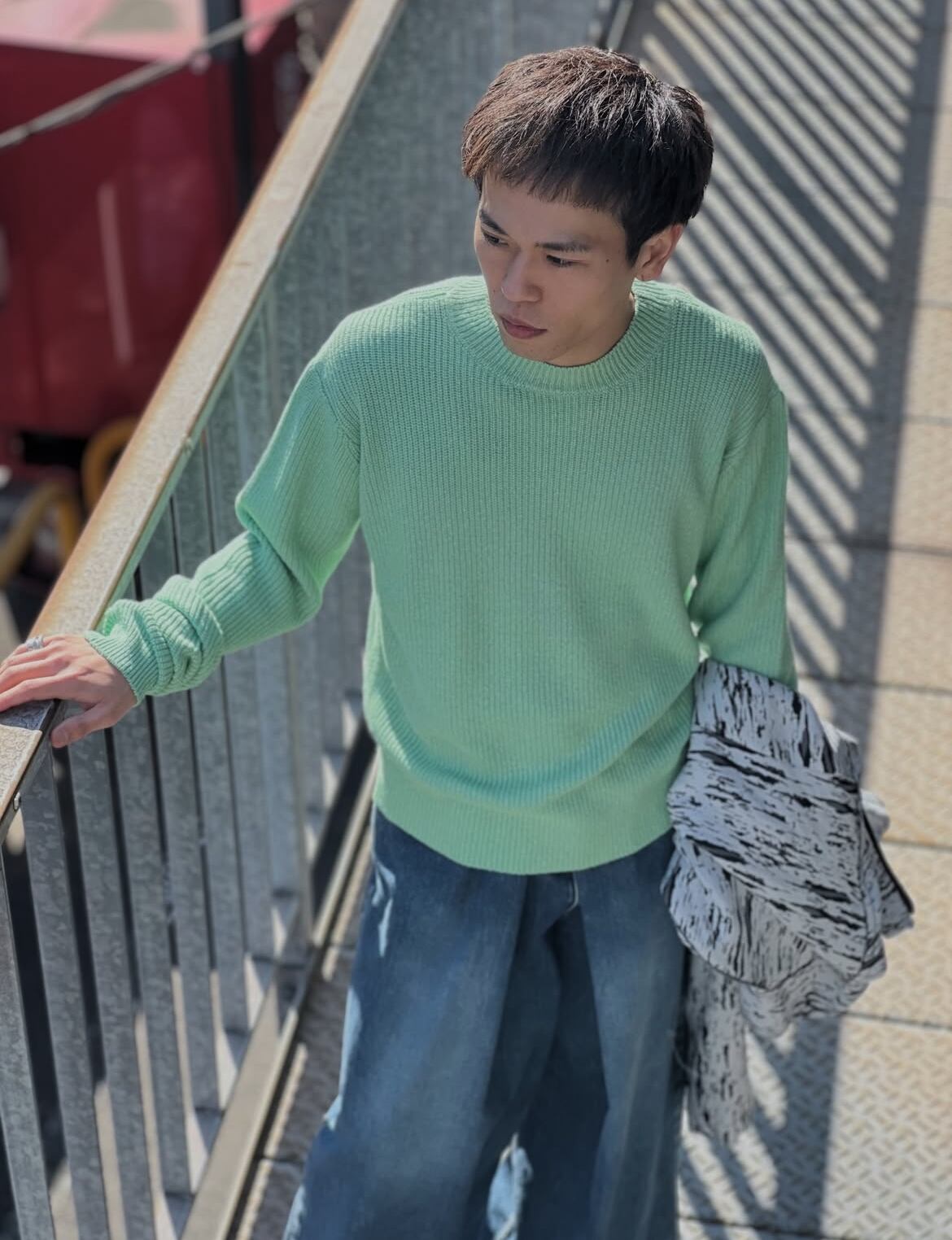 極端に袖を長くしたクルーネックニット。インド原産の野蚕(タサール蚕)の繭から採取されるタッサーシルクを使用しています。非常に希少なシルクで、繊維が太く、独特の筋があり不均一な表情を持ちます。タッサーシルクは、養殖の絹糸(家蚕系)よりも強度や耐久性に優れており、着ていくほどに肌に馴染んで柔らかくなりますが、水を通すとシャリ感が現れるのが特徴です。