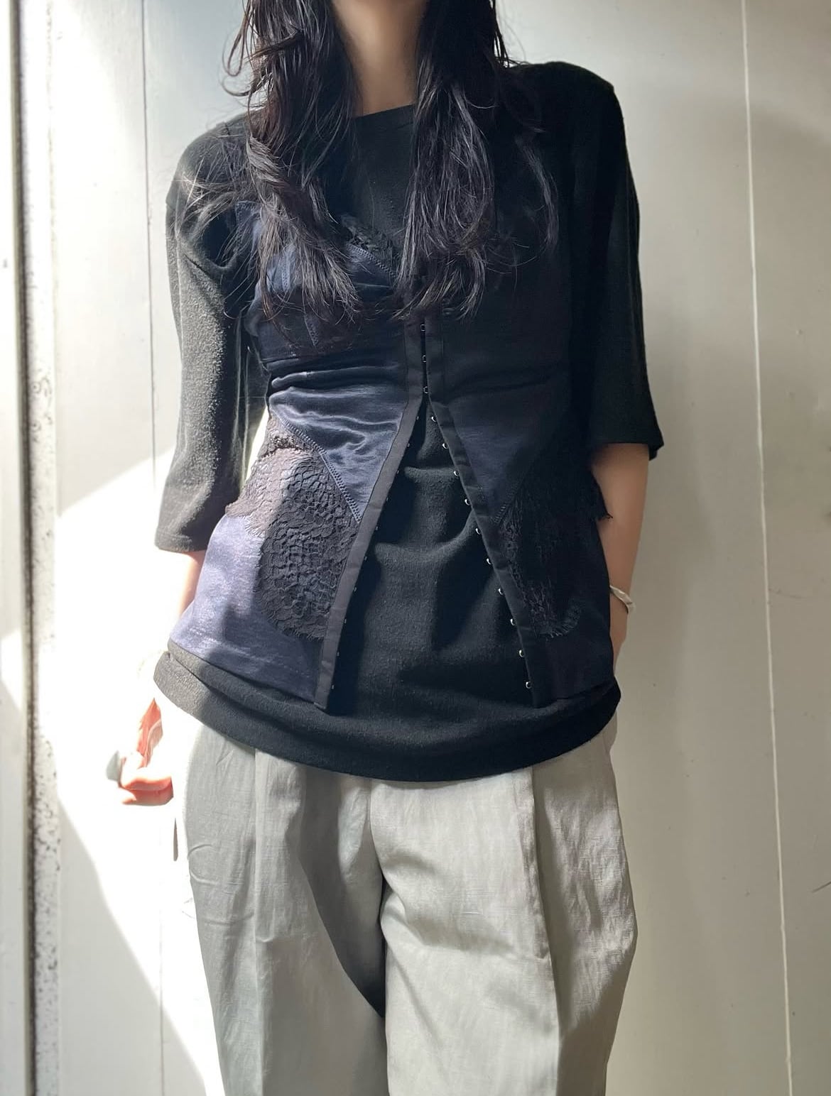表裏のコントラストが際立つプレーティング天竺を使用し、上品な艶と柔らかさ、透けにくい適度な肉感とドレープ性を備えた生地が特徴。