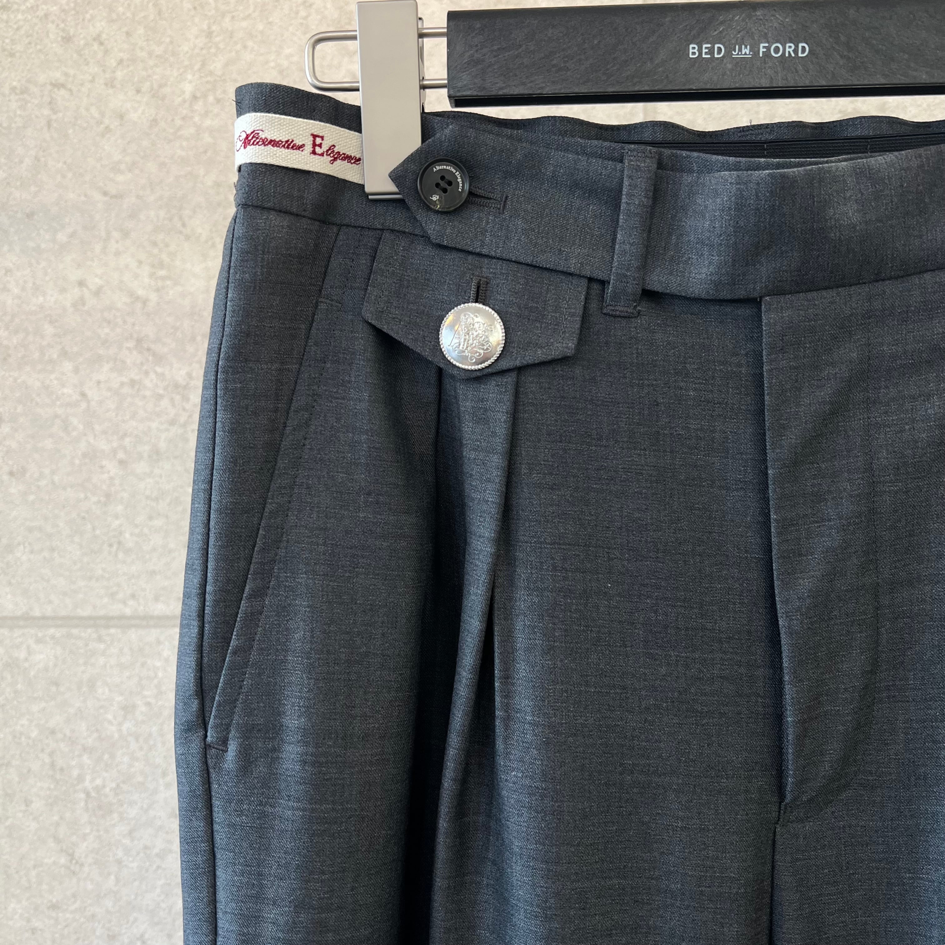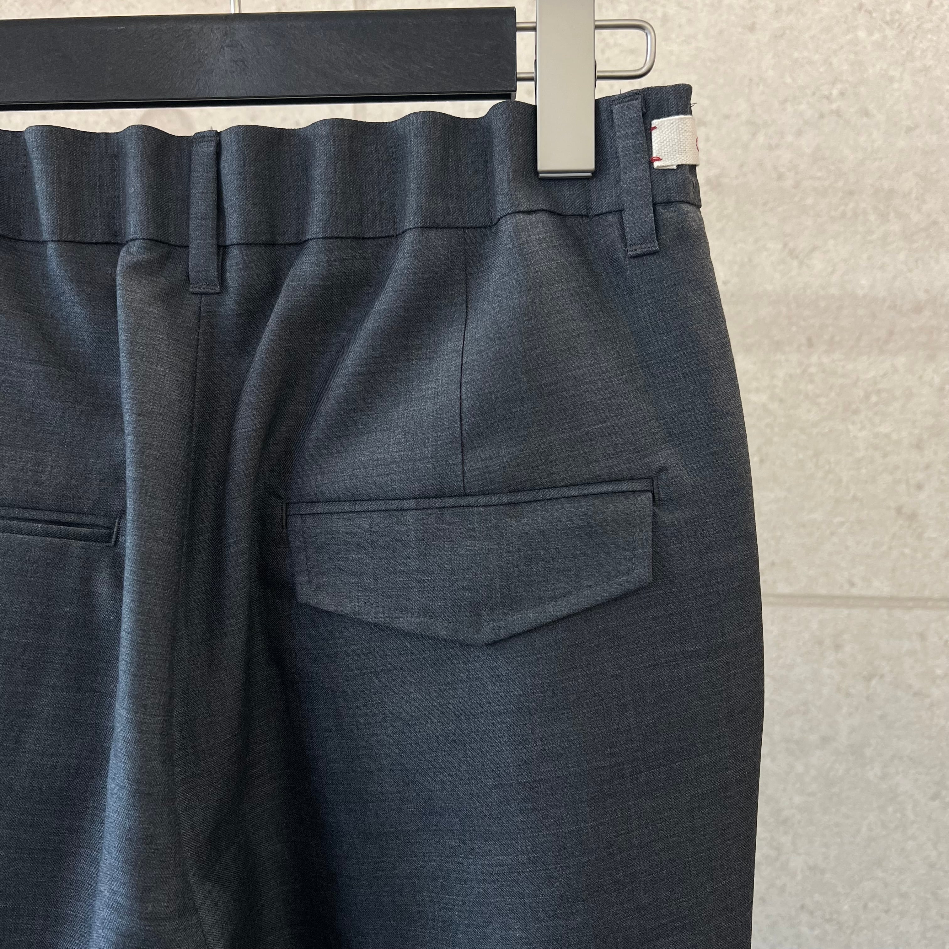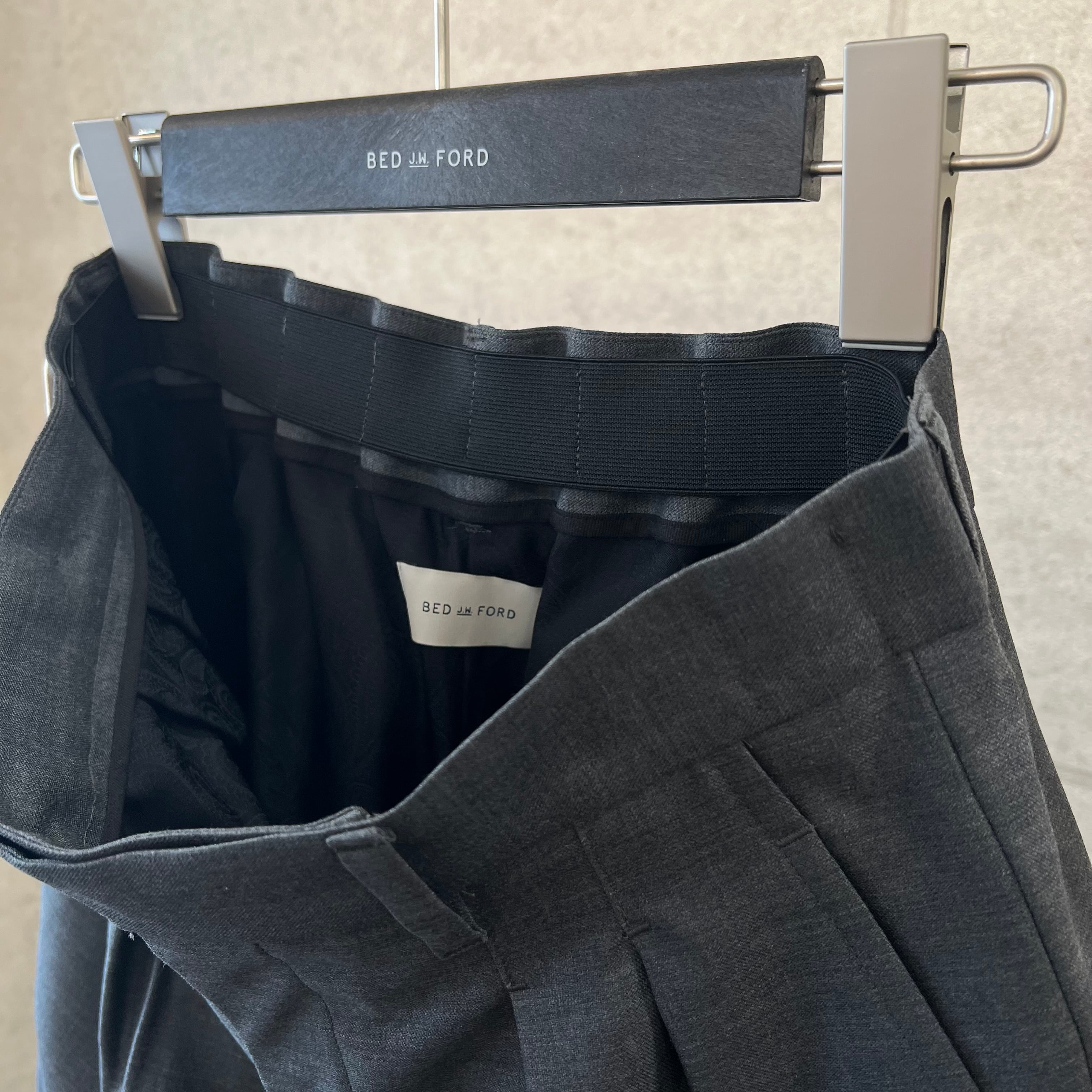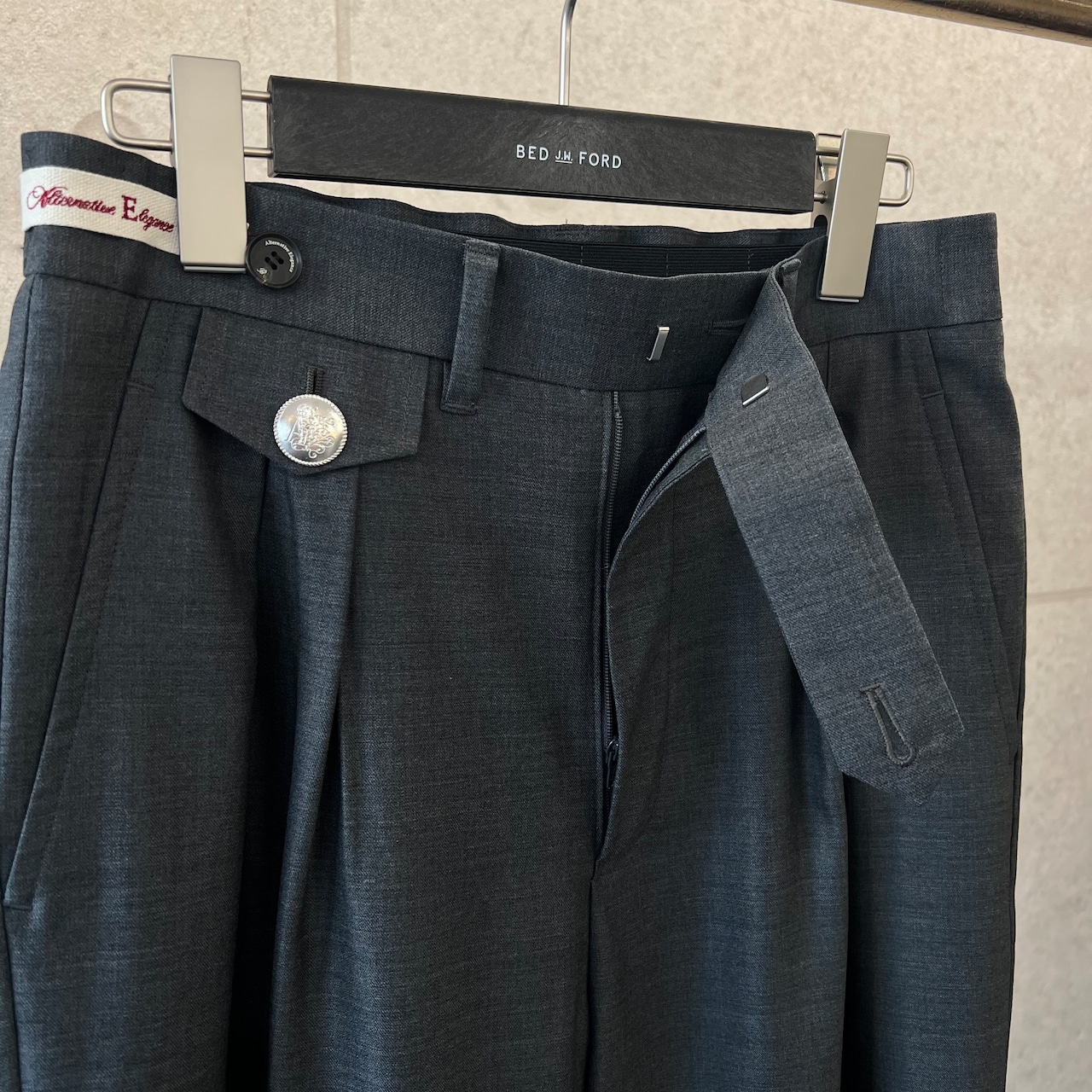ウエストベルトを蛇腹にし、内側にゴムを取り付けることによってデザインと機能美を共存させたスラックスです。