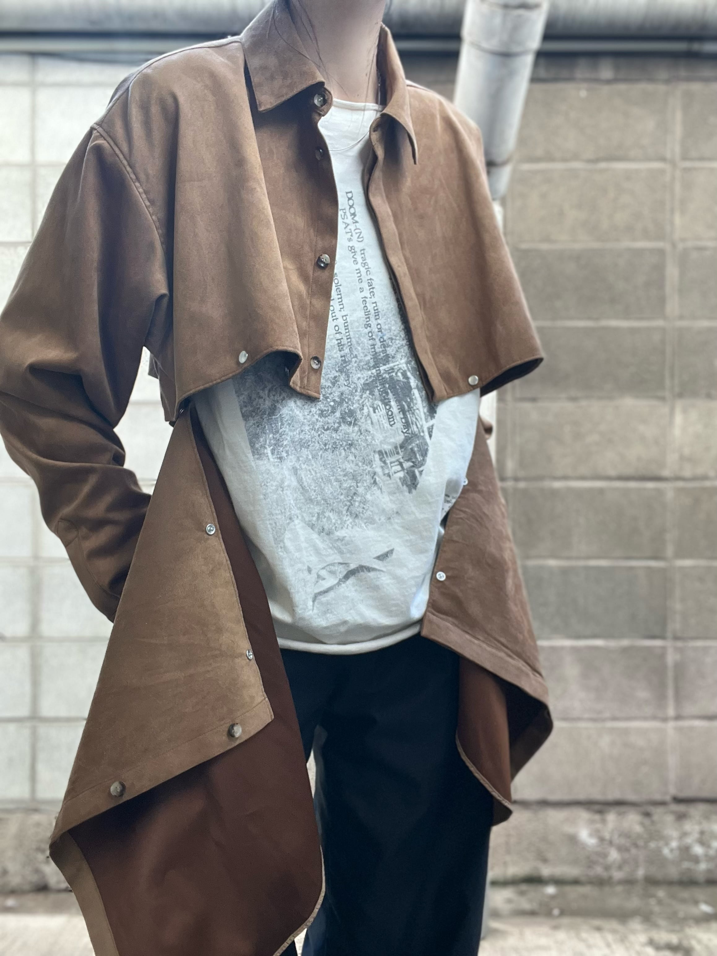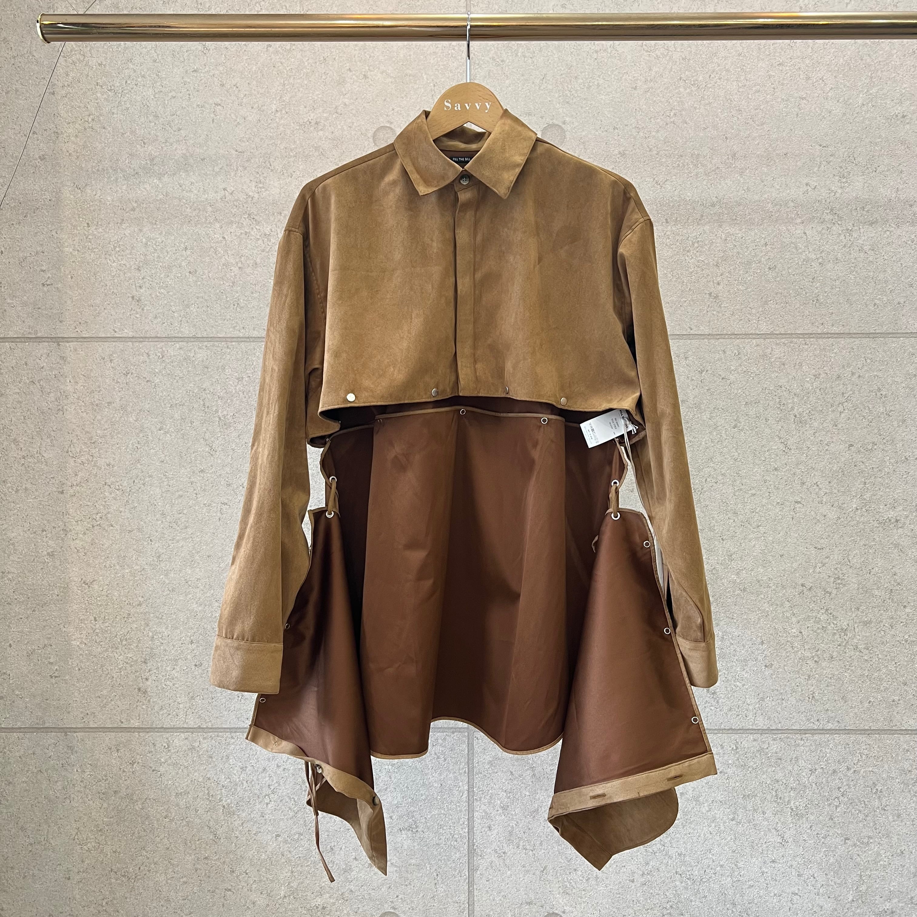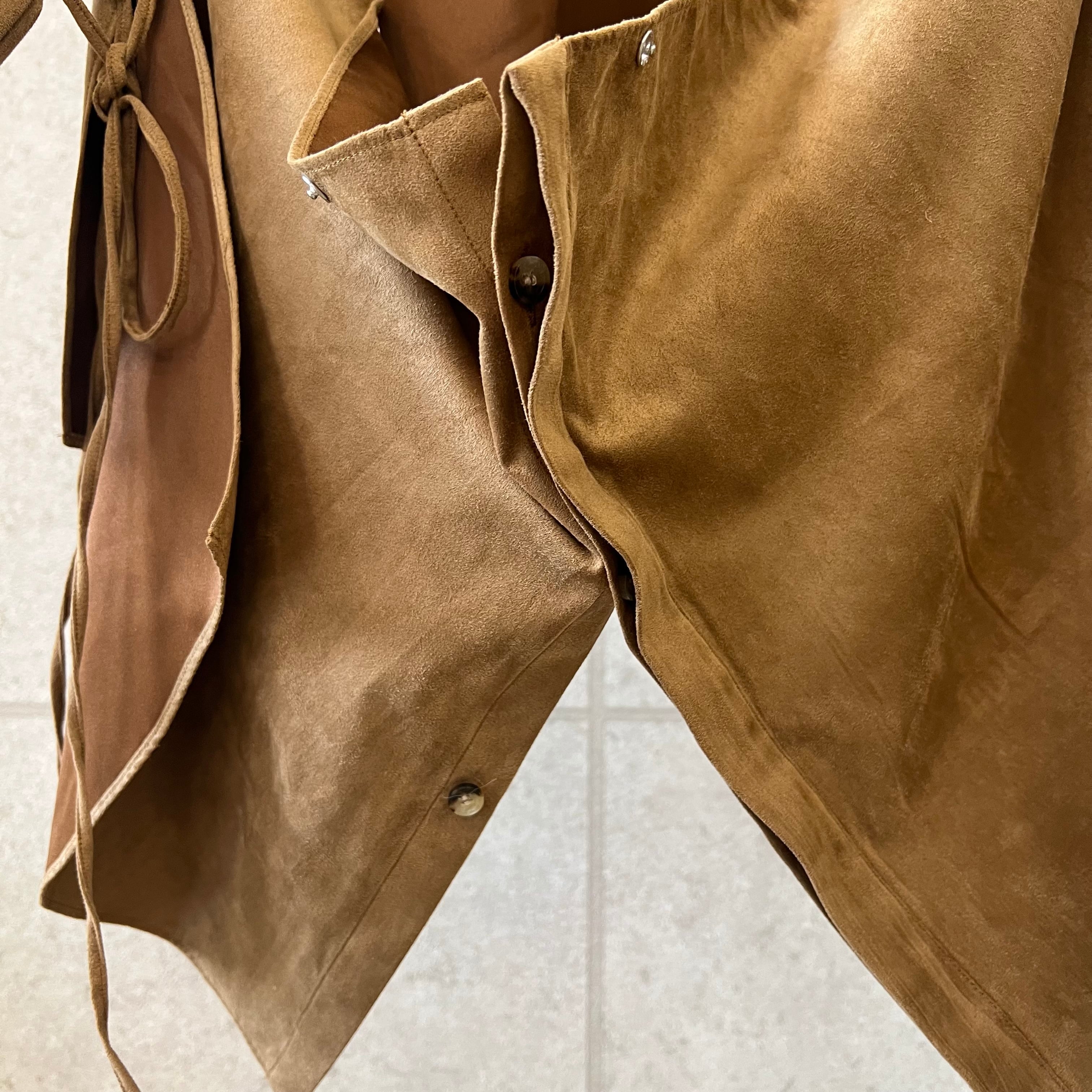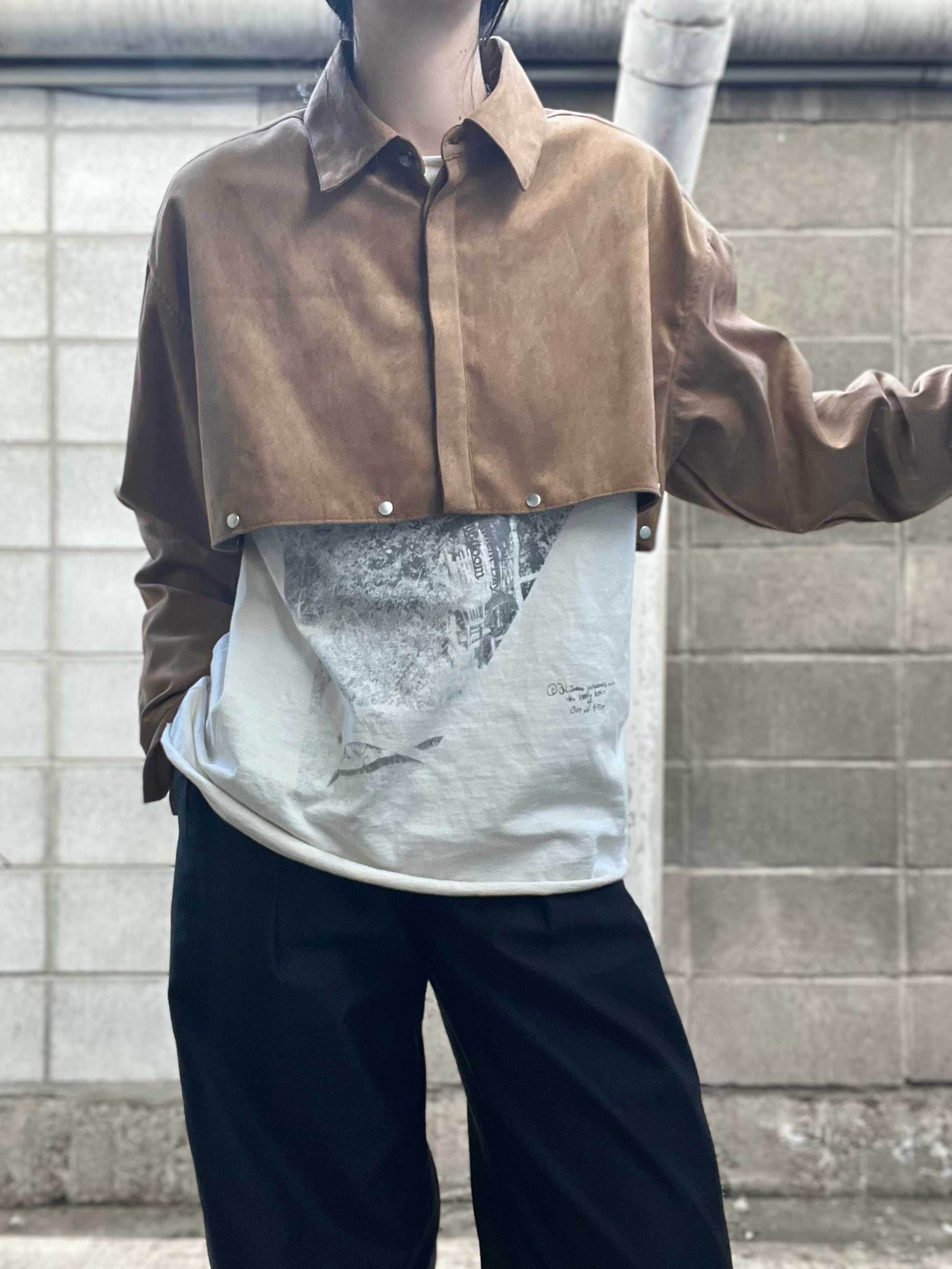 溶接工が着るユニフォームとしてVINTAGEでも稀な存在のジャケットをシャツに落とし込んだデザイン。フェイクスエードを使用しています。上下がスナップボタンで外れ短丈シャツとしても着用出来ます。前身のみ外すこともできます。脇に紐で調節できる仕様。