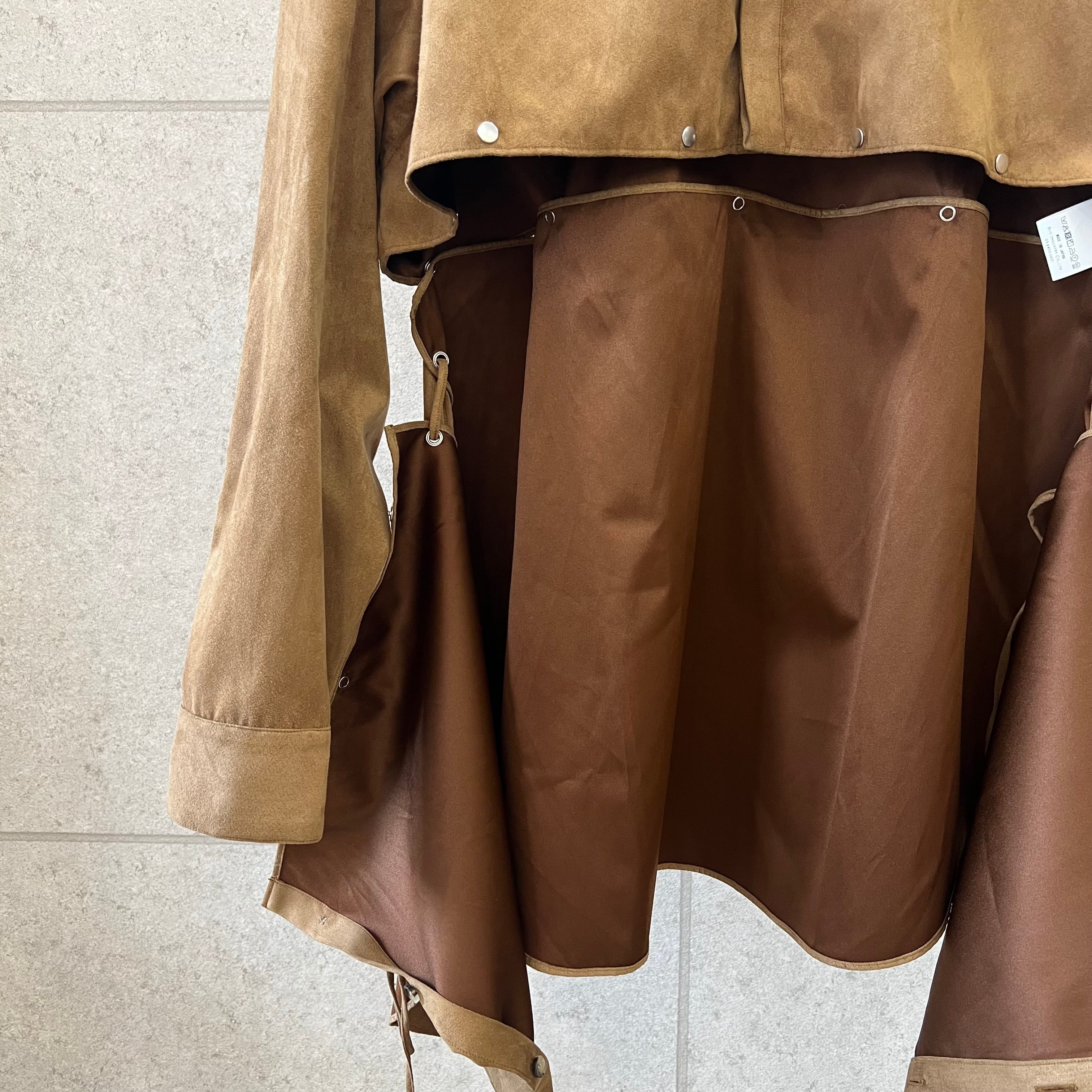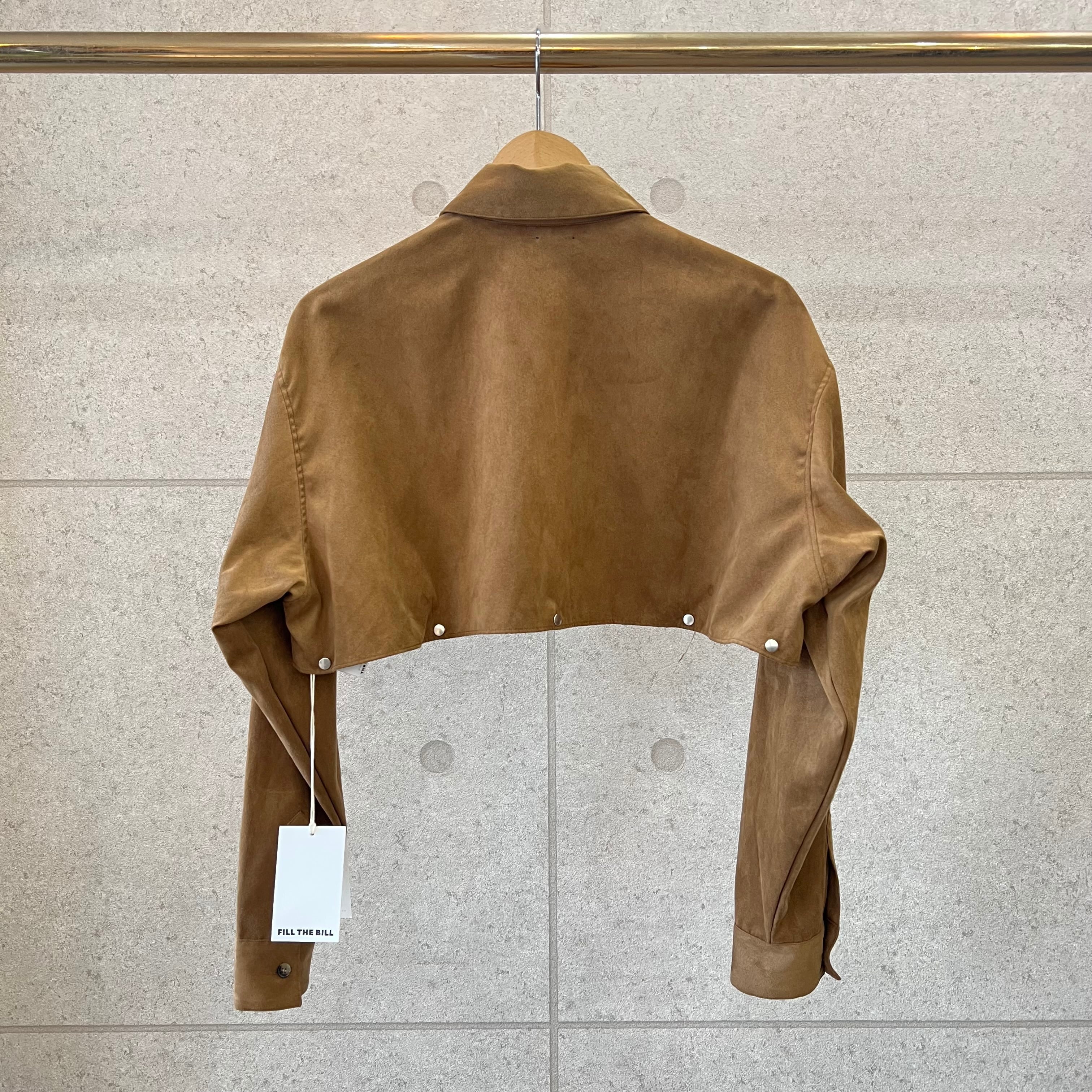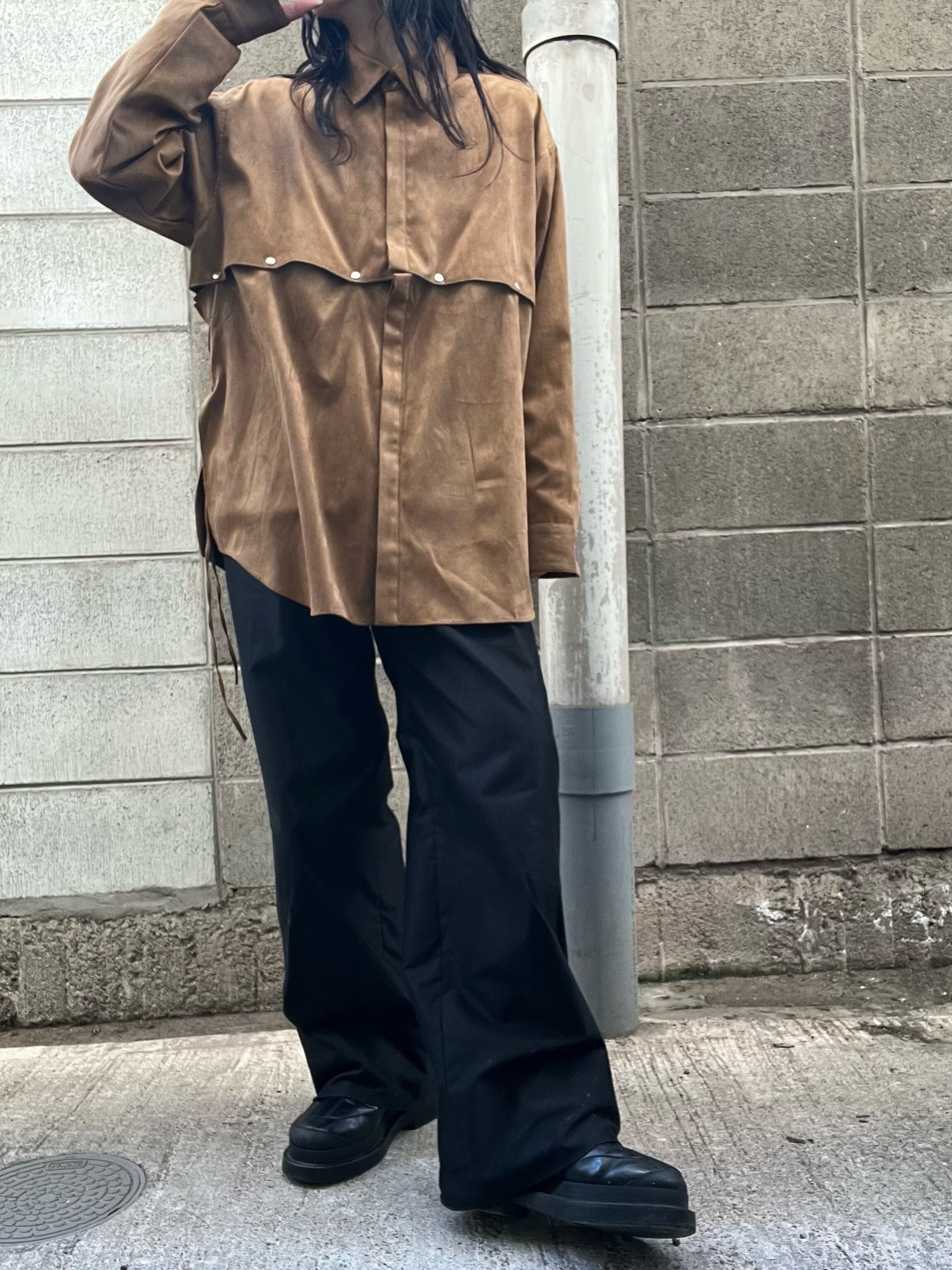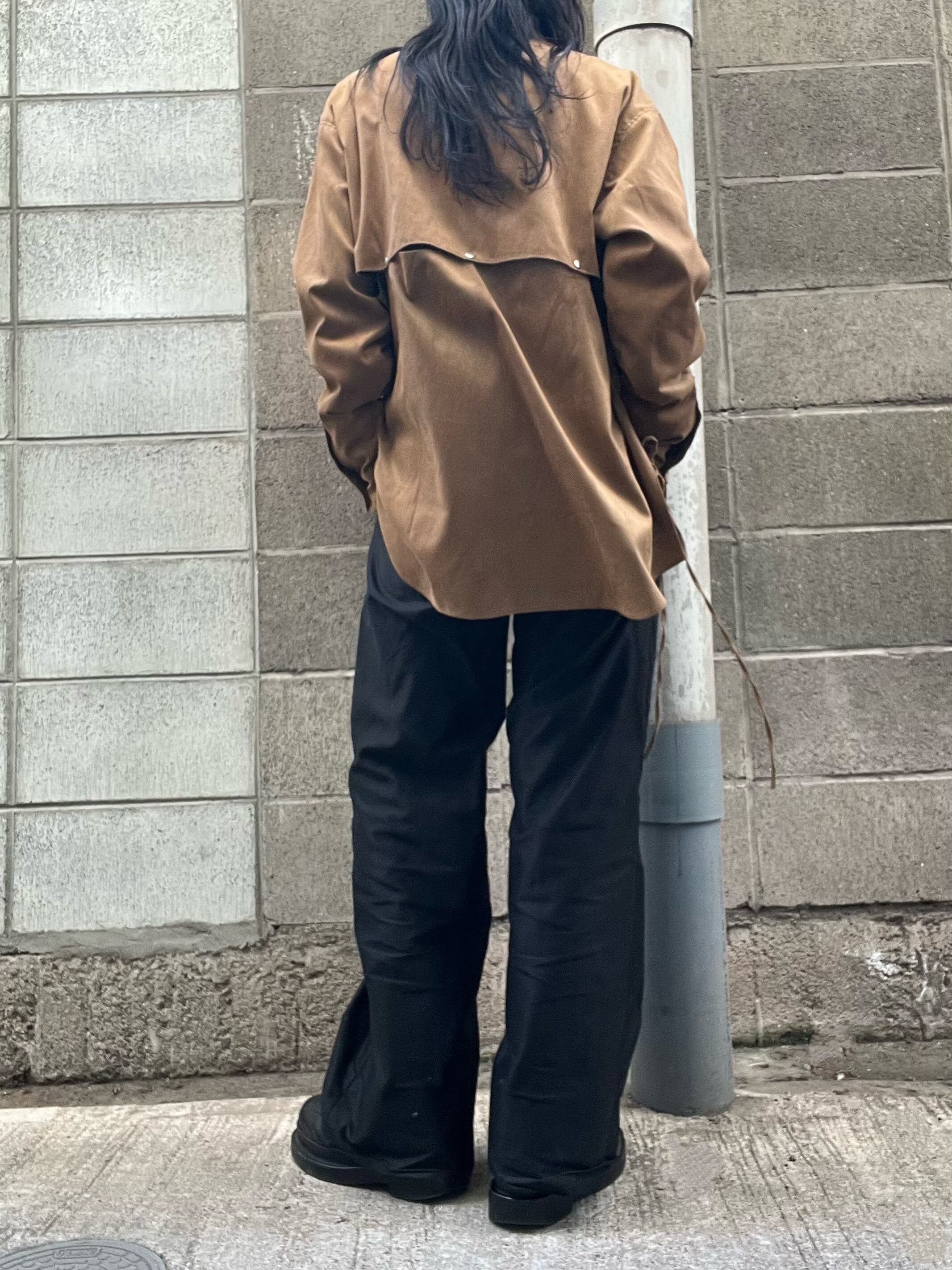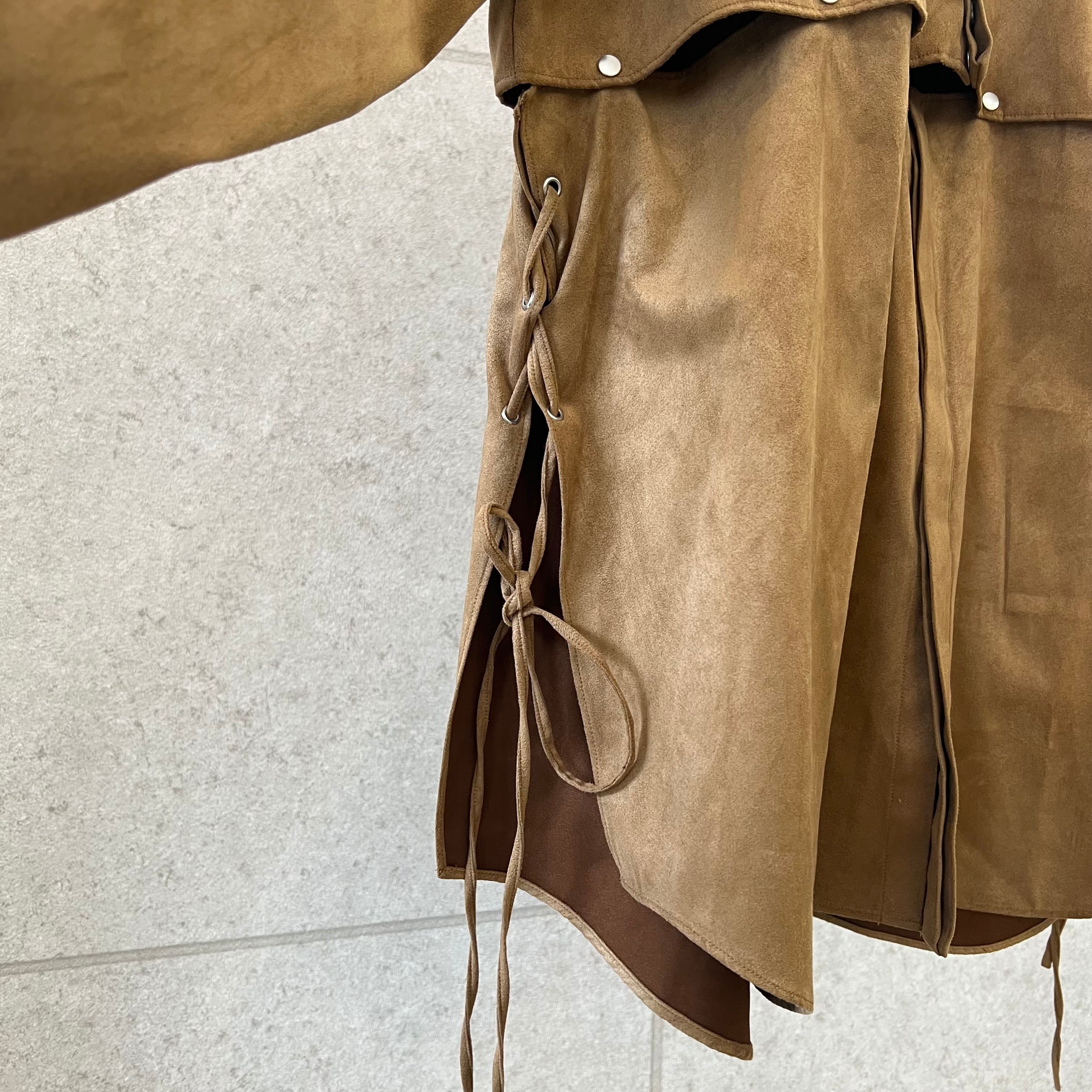 溶接工が着るユニフォームとしてVINTAGEでも稀な存在のジャケットをシャツに落とし込んだデザイン。フェイクスエードを使用しています。上下がスナップボタンで外れ短丈シャツとしても着用出来ます。前身のみ外すこともできます。脇に紐で調節できる仕様。