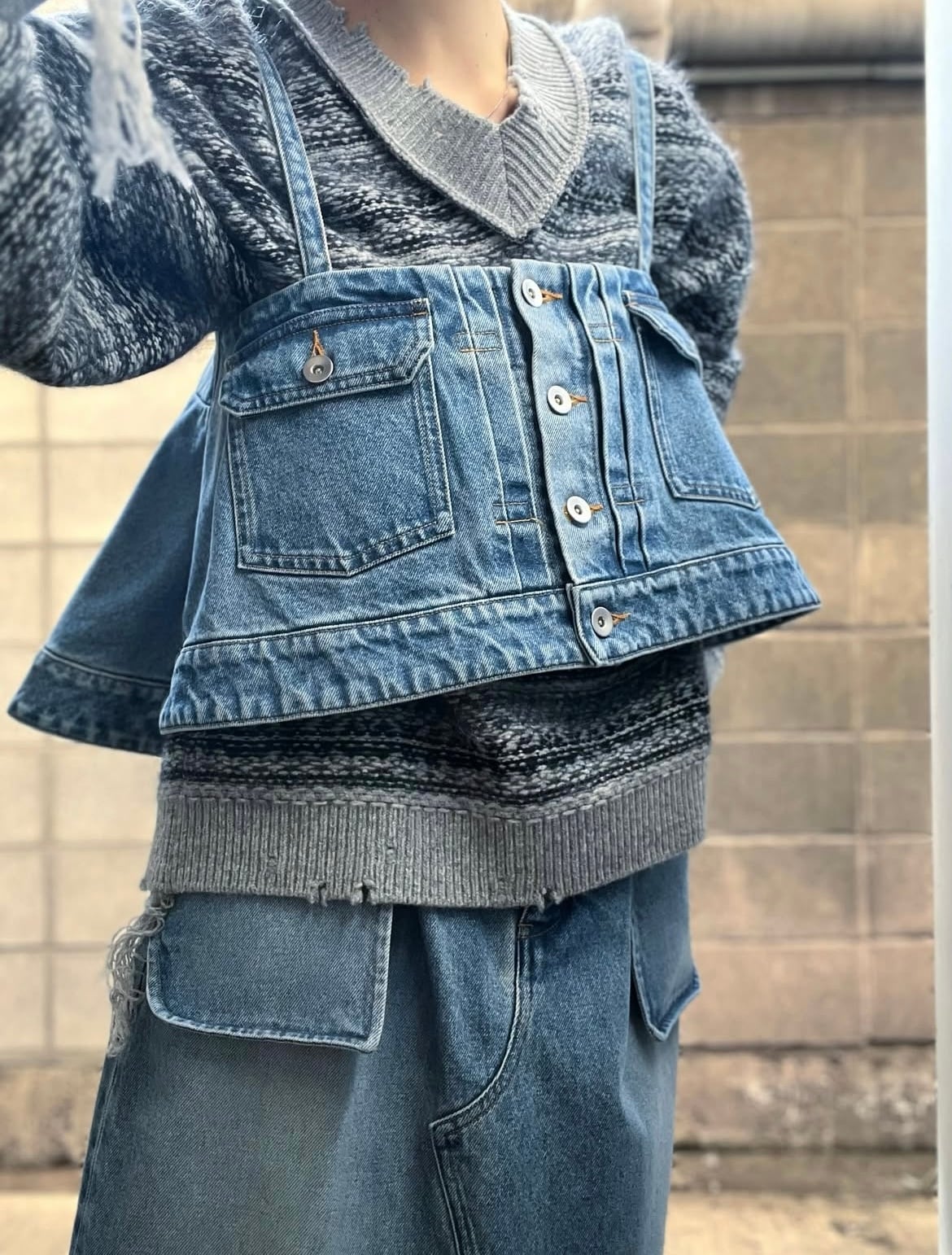 ラッフルシルエットのキャミトップスに製品洗い(バイオブリーチ加工)を施し、ムラやシボ感を表現。デニムジャケットのディテールを残したキャミソールの新型です。