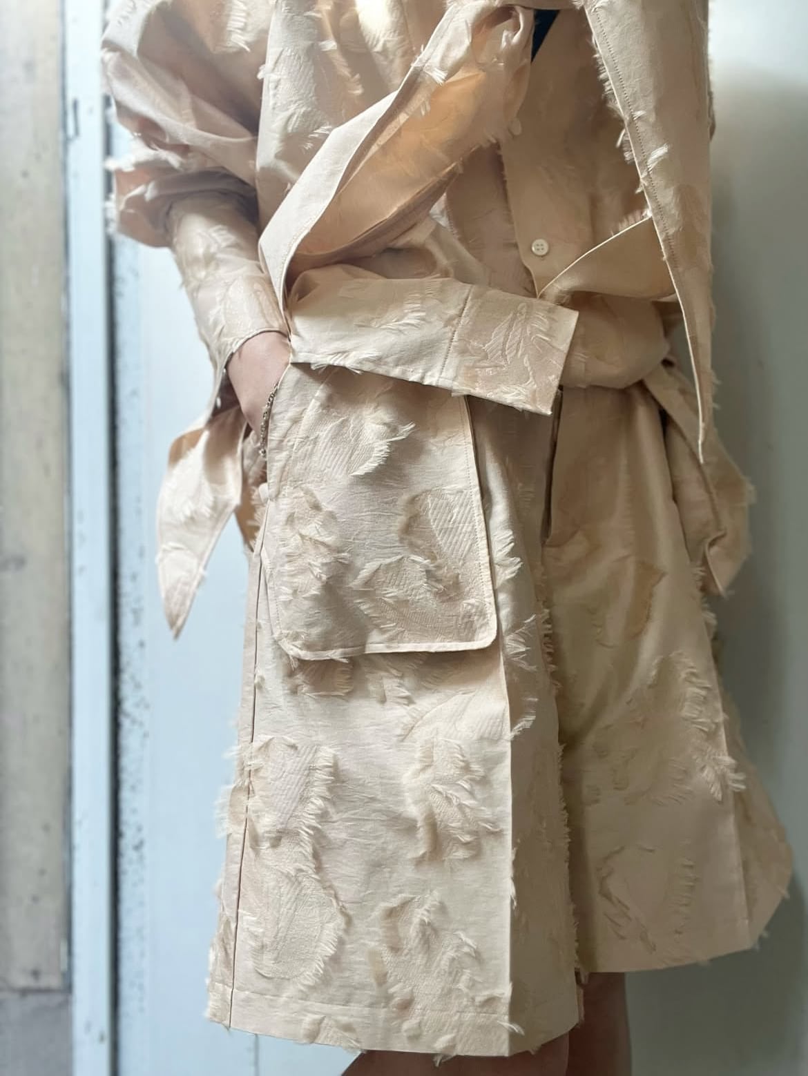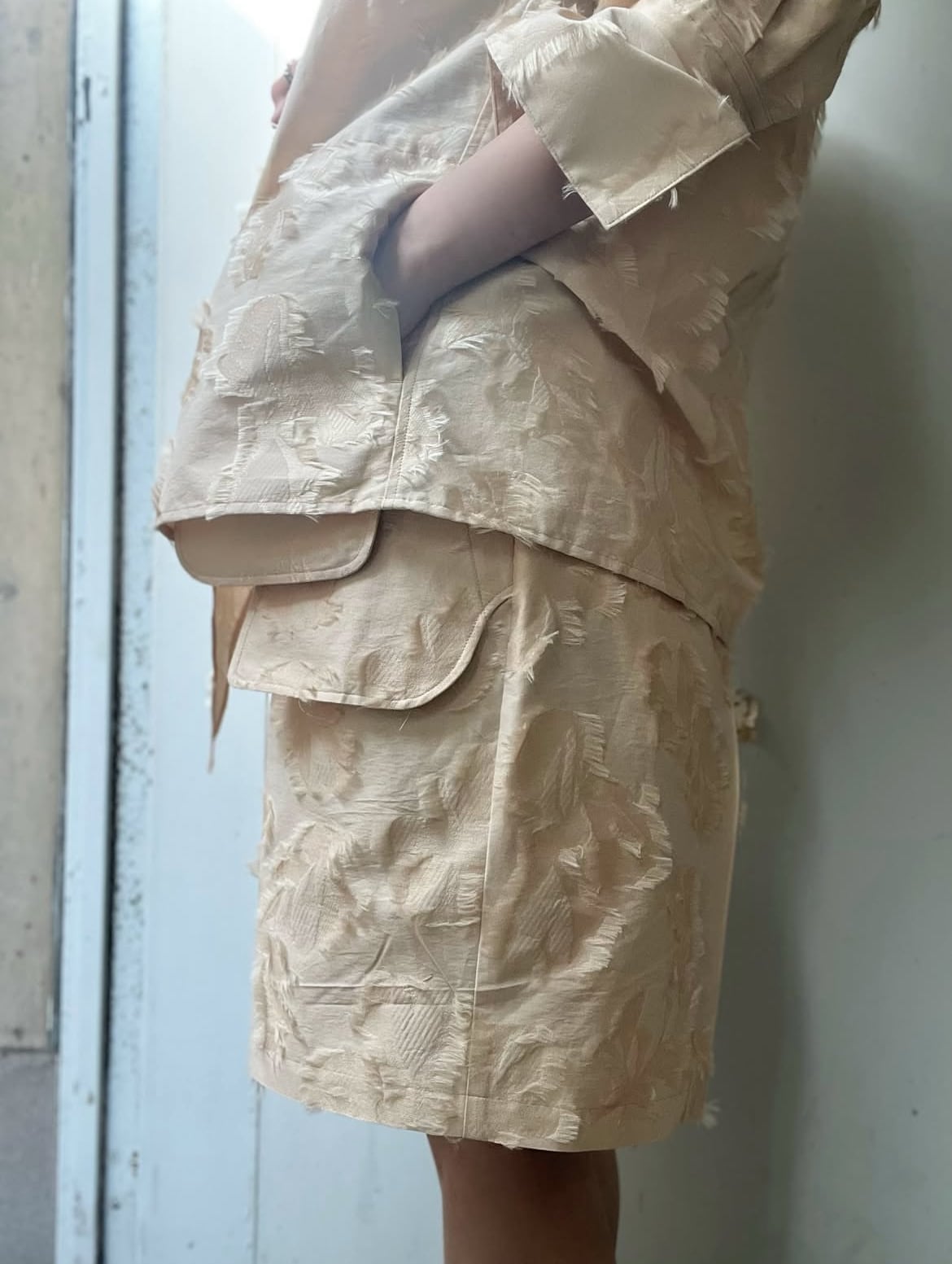 経糸にナイロン、緯糸のベースには綿、柄部分(ヒラヒラ部分)にはポリエステルを使用しており、同系色の中でも質感の違いを出して、表現豊かに織り上げたカットジャガードです。