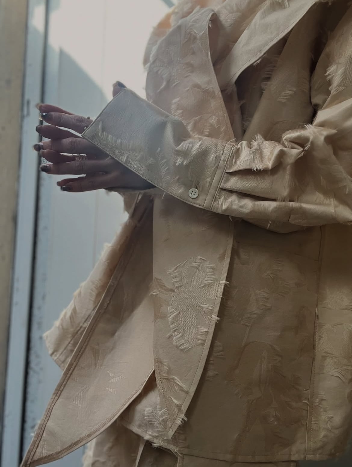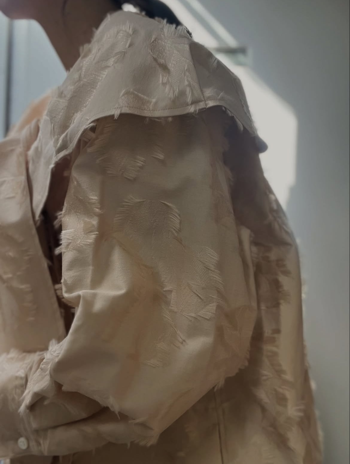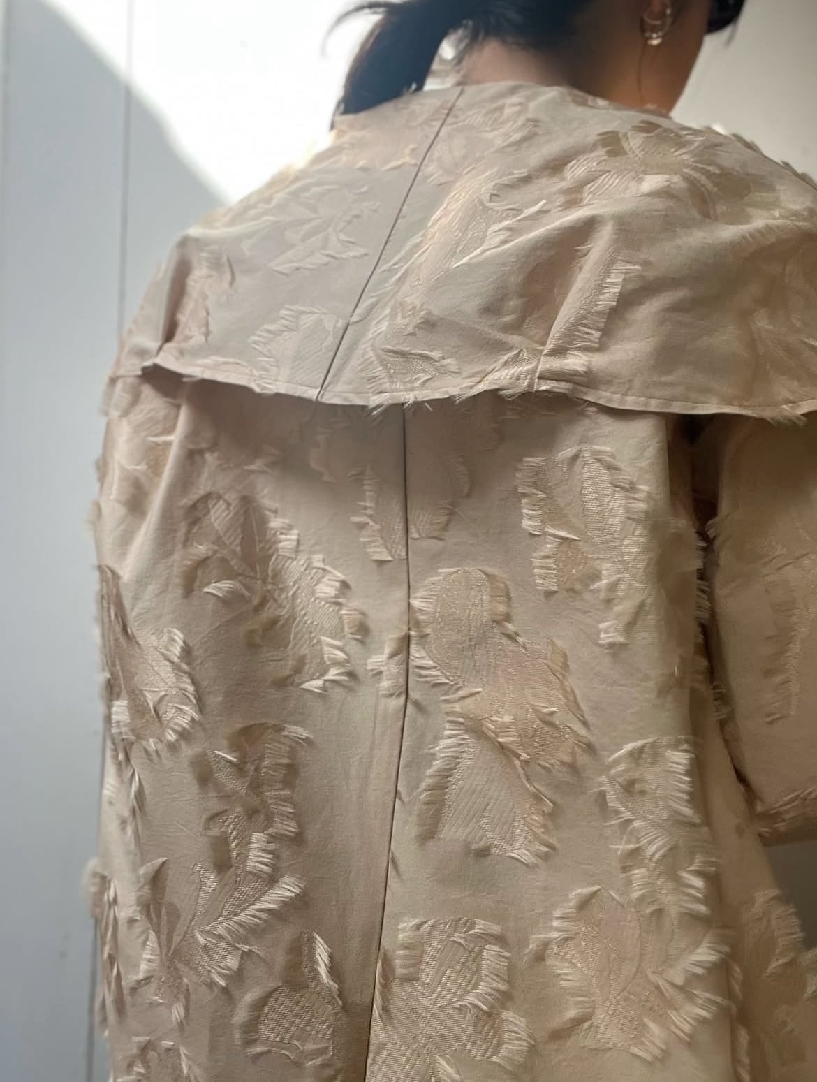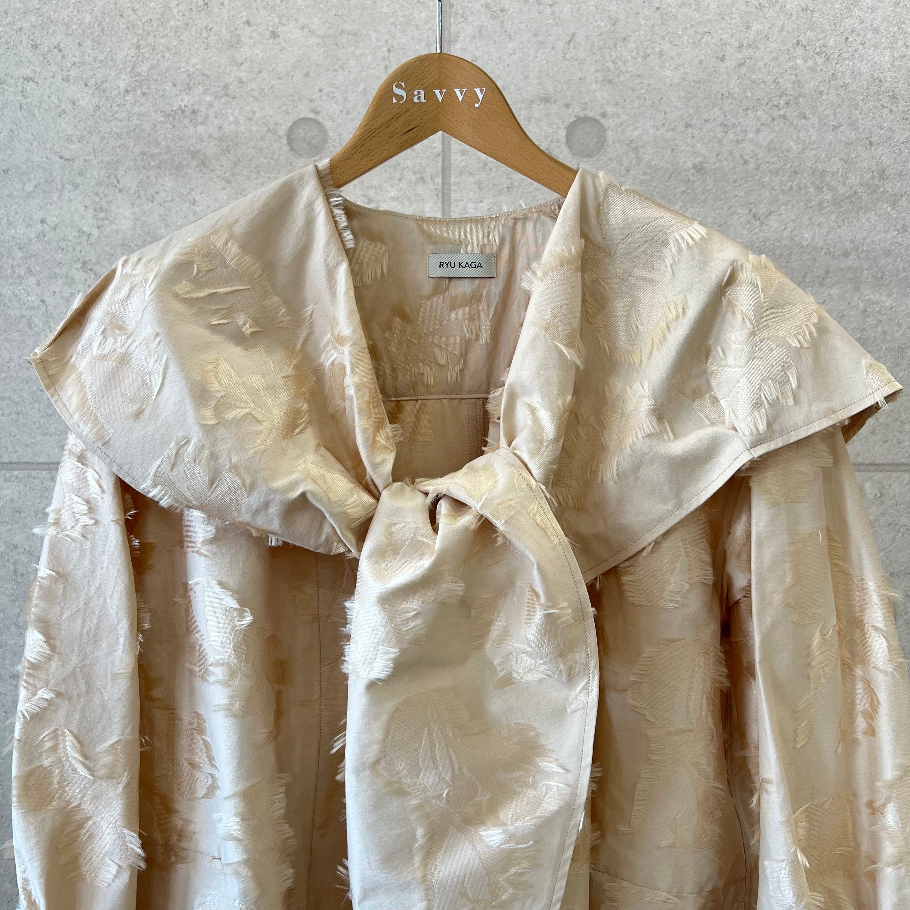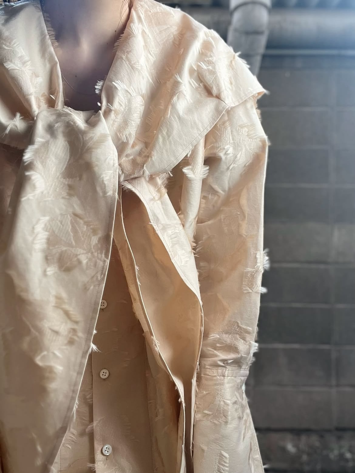・植物の葉からイメージした大きい衿は「リーフカラー」と名付け、ボウタイ/スカーフのように結べる仕様になっています。