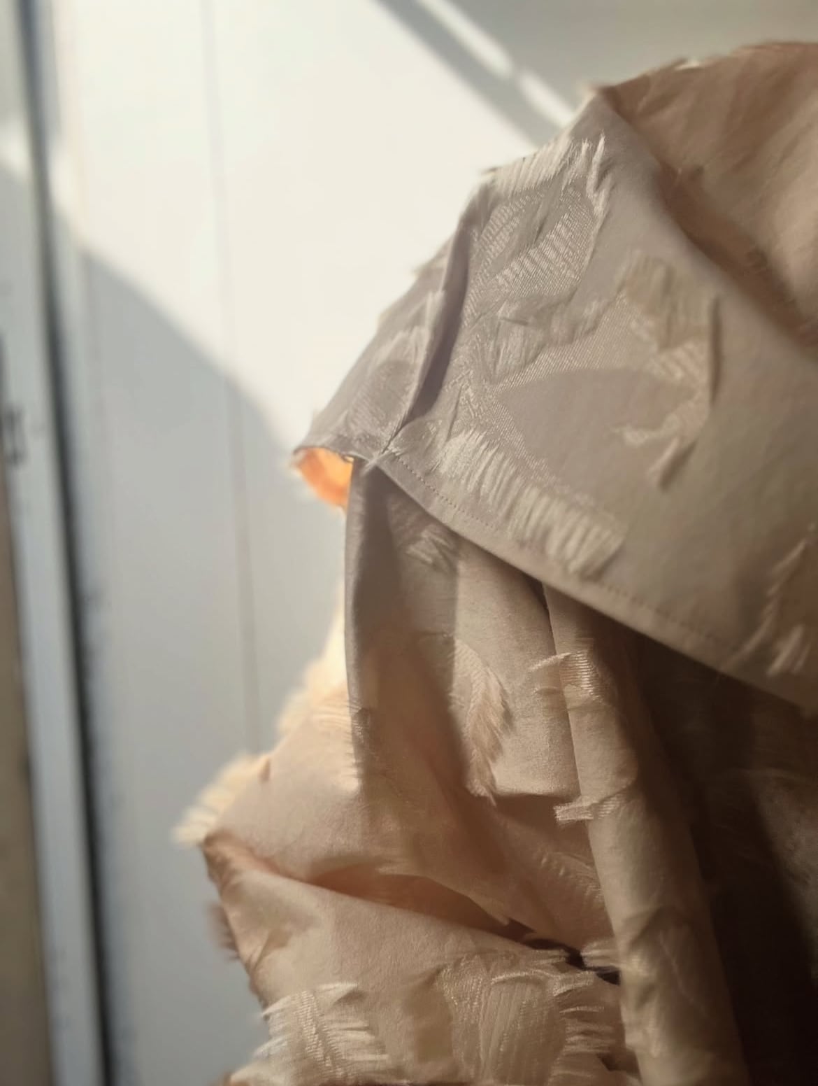 経糸にナイロン、緯糸のベースには綿、柄部分(ヒラヒラ部分)にはポリエステルを使用しており、同系色の中でも質感の違いを出して、表現豊かに織り上げたカットジャガードです。