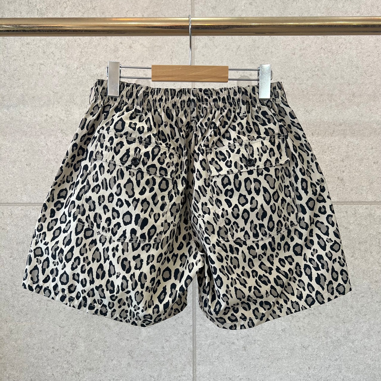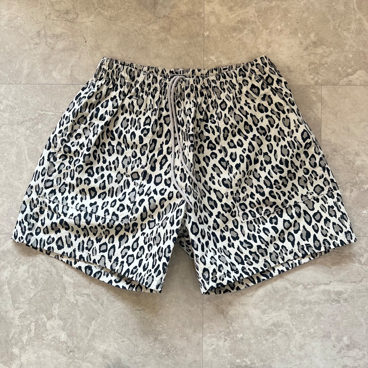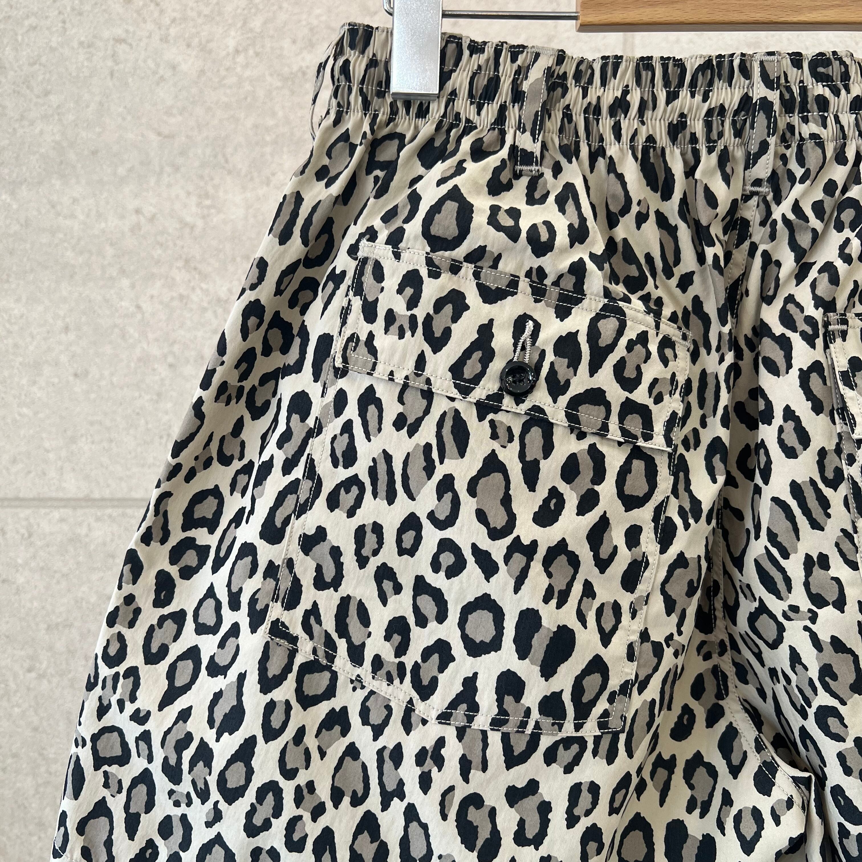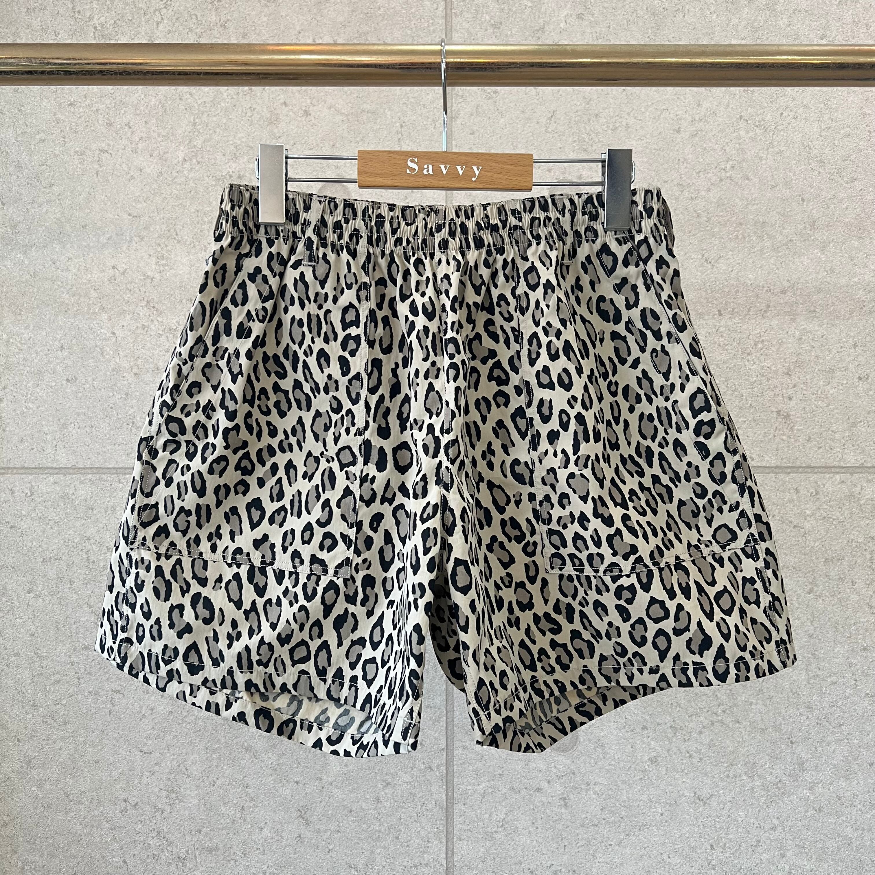 レオパード柄のイージーショーツは古い時代のスウィムショーツをアップデート。素材はコットンナイロンで、ハリ感のある素材感です。