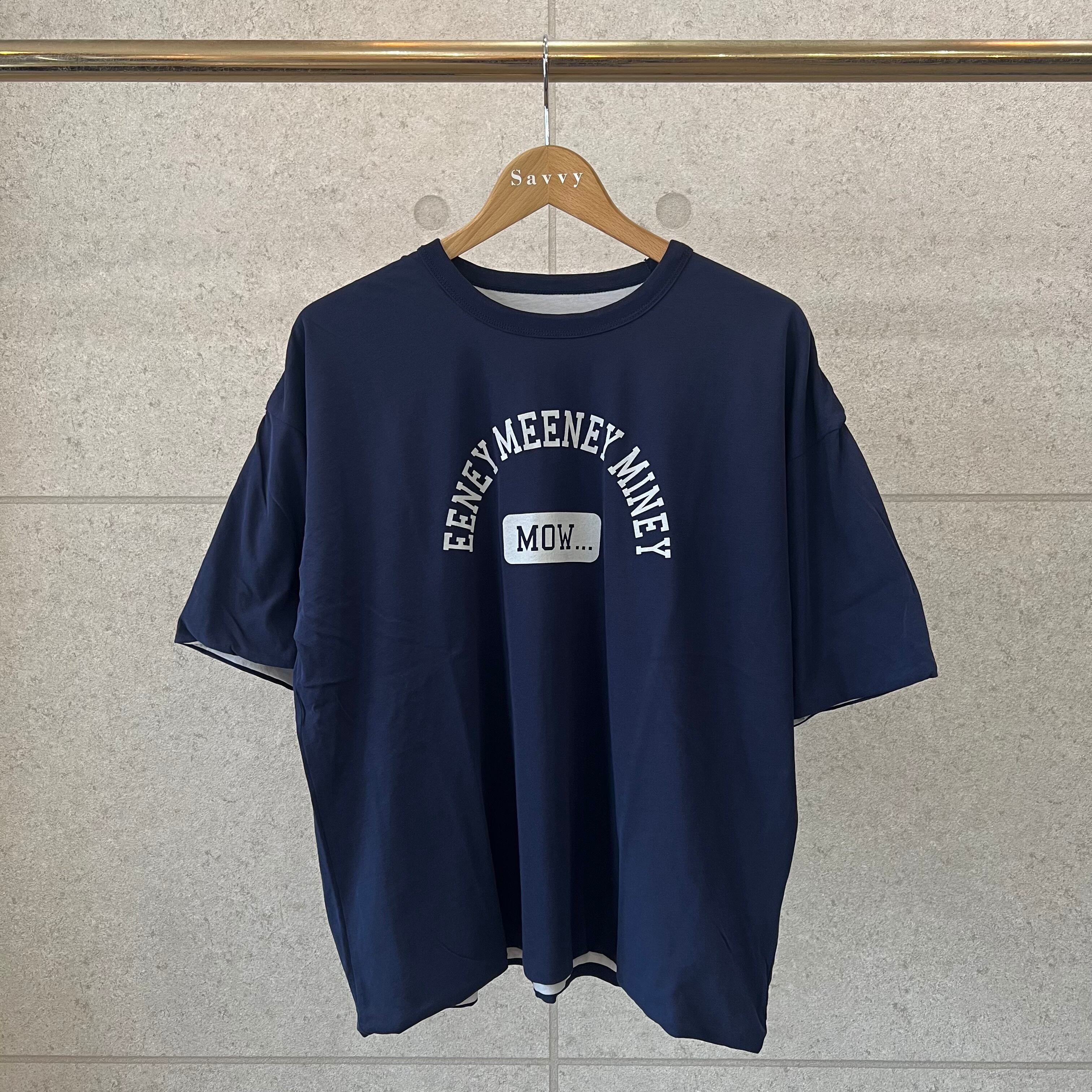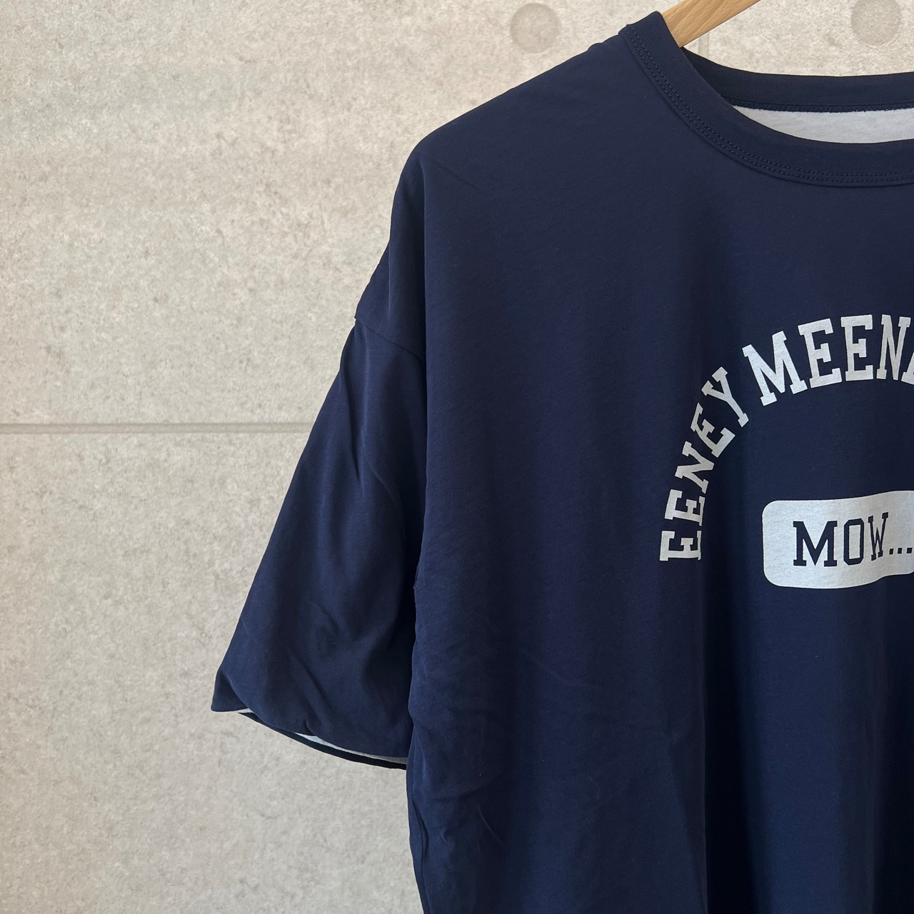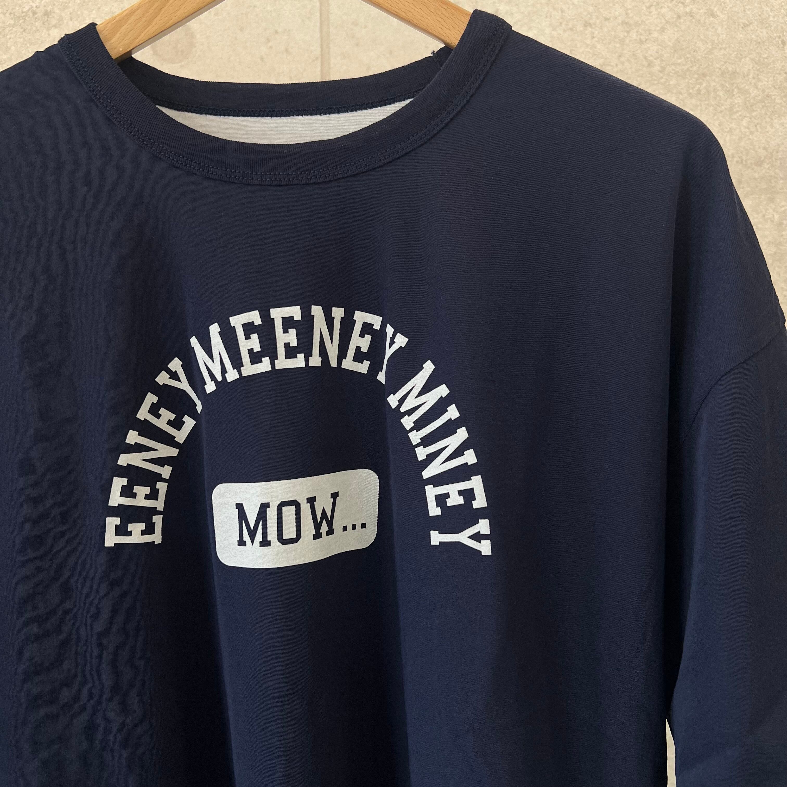 表はカレッジ風のプリント。裏側は背中にステンシル。EENEY MEENY MINEY MOW...は、日本語で言うと"どっちにしようかな~"という意味です。リバーシブルなので、そういう意味を付け加えています。