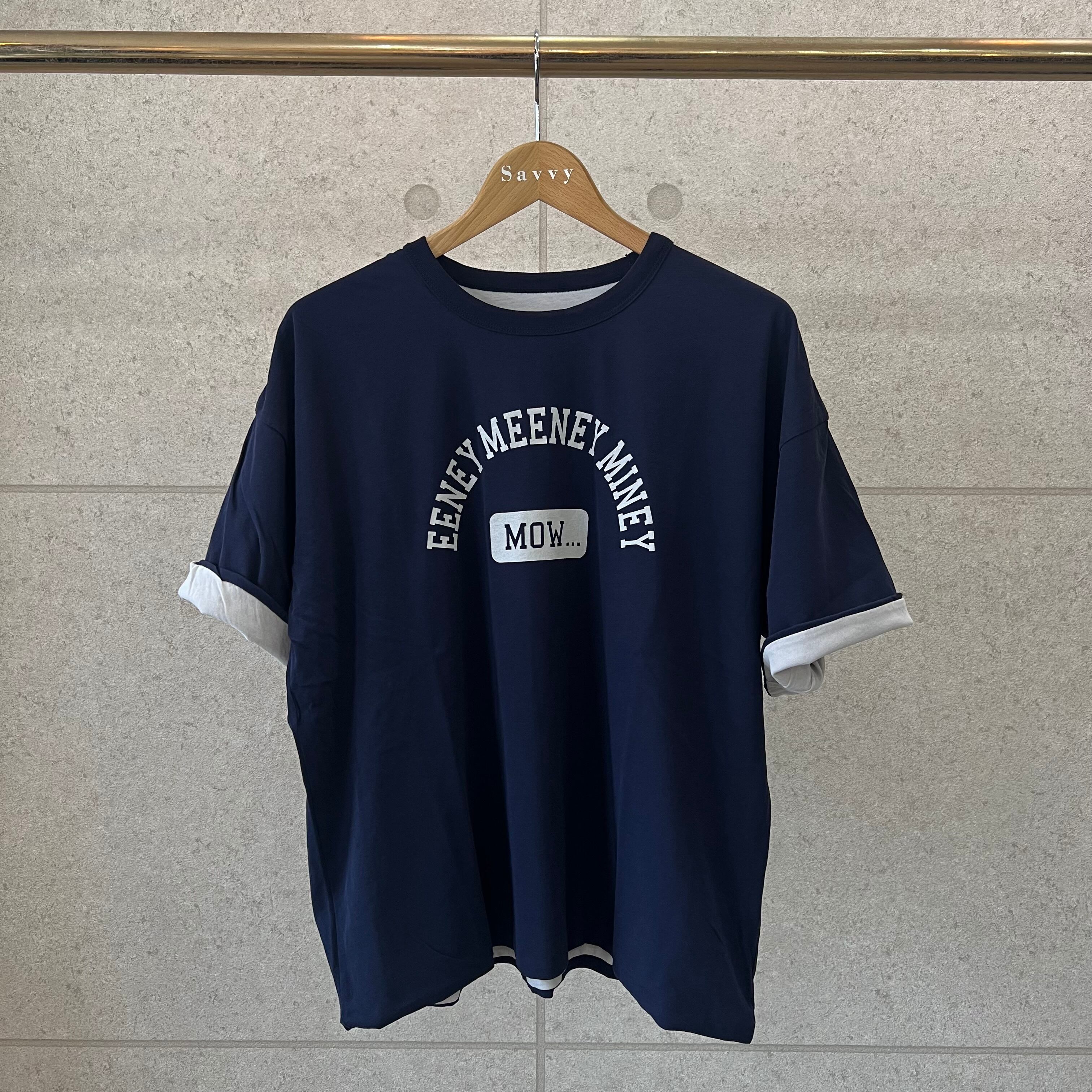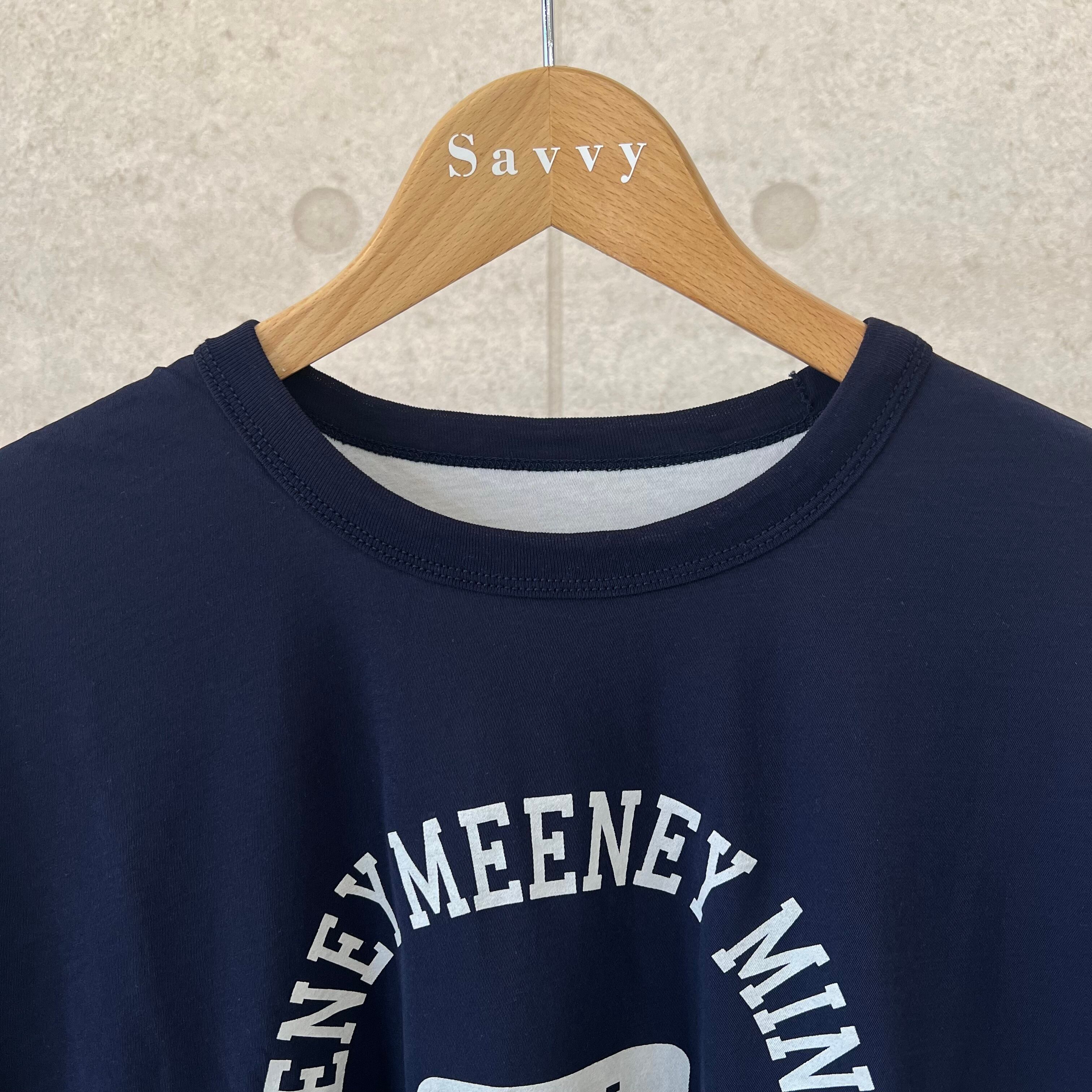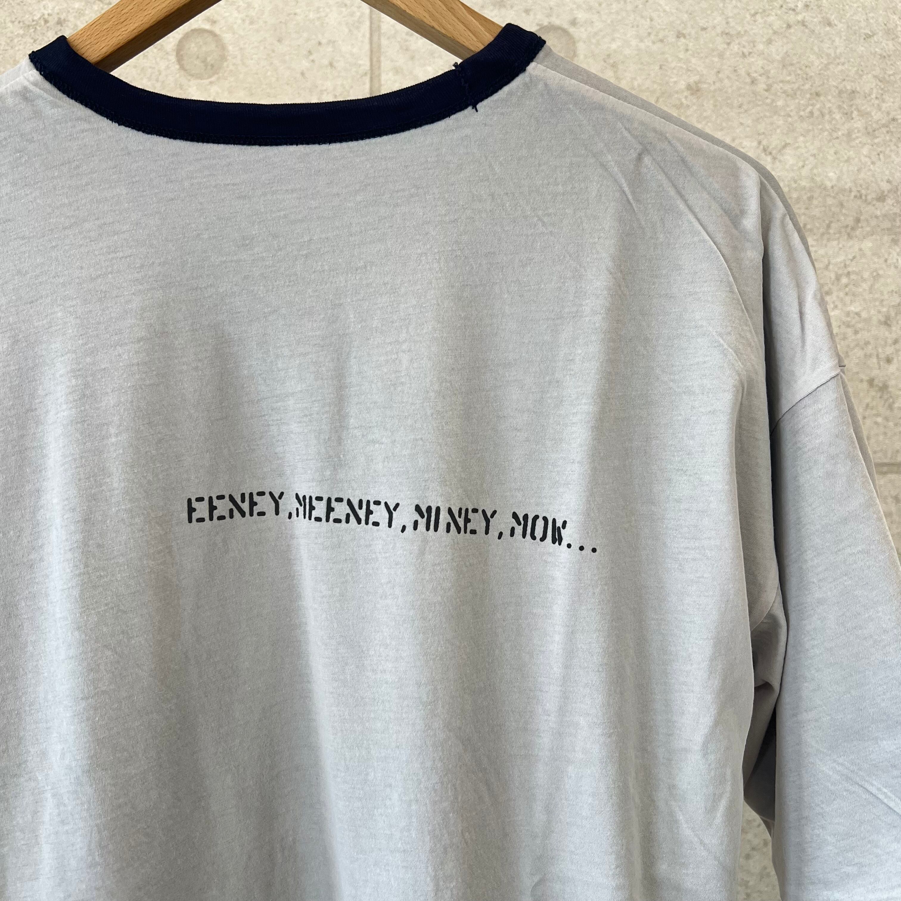 表はカレッジ風のプリント。裏側は背中にステンシル。EENEY MEENY MINEY MOW...は、日本語で言うと"どっちにしようかな~"という意味です。リバーシブルなので、そういう意味を付け加えています。