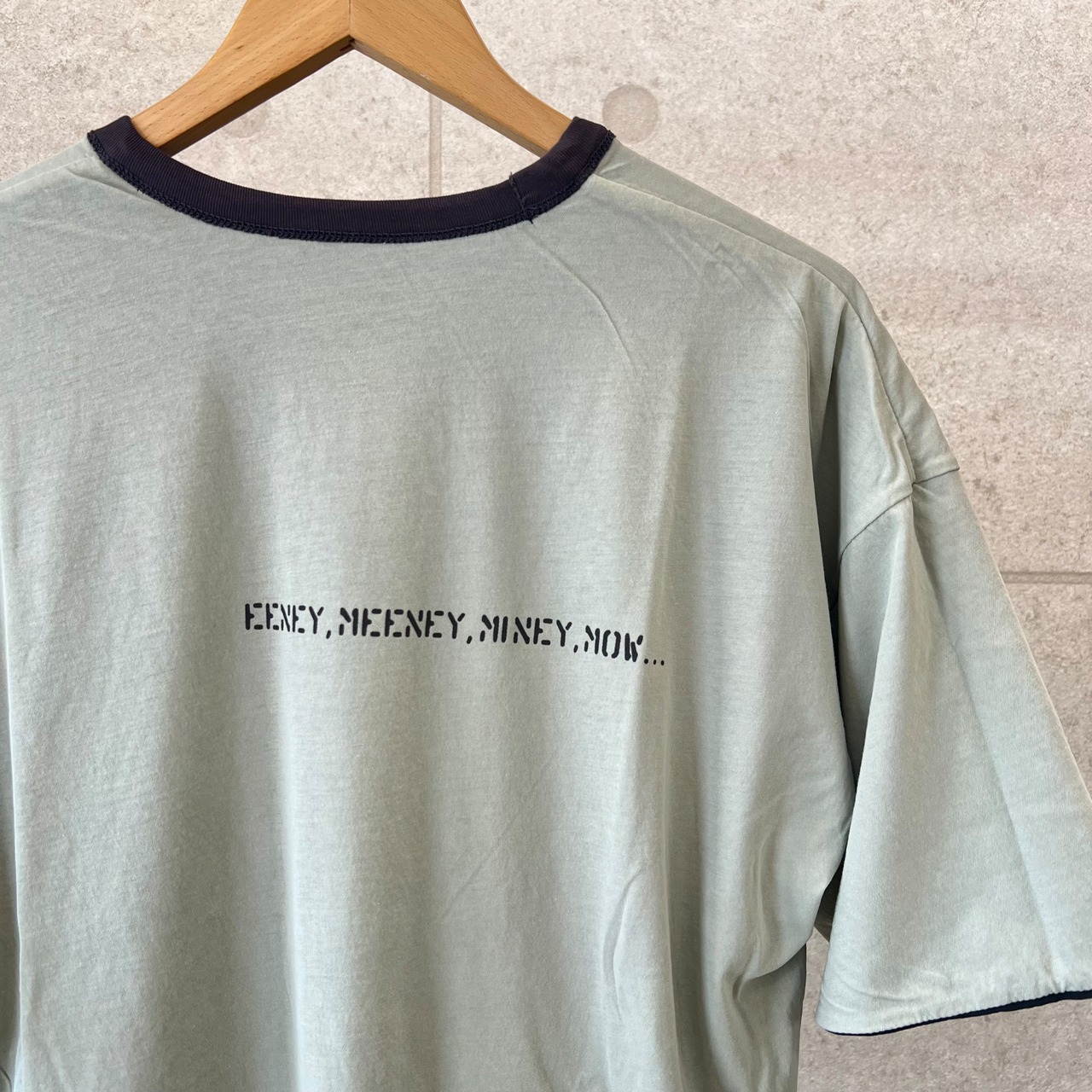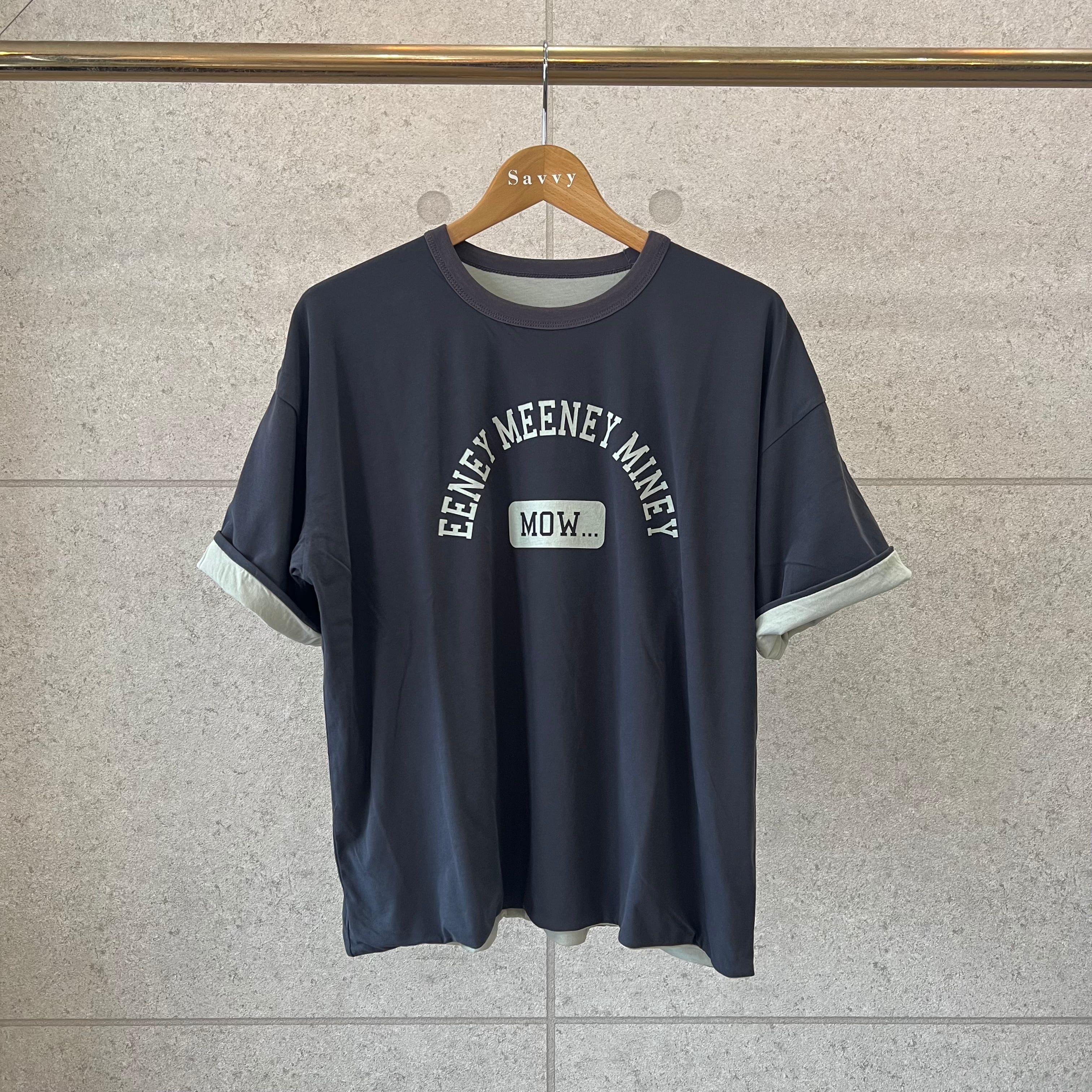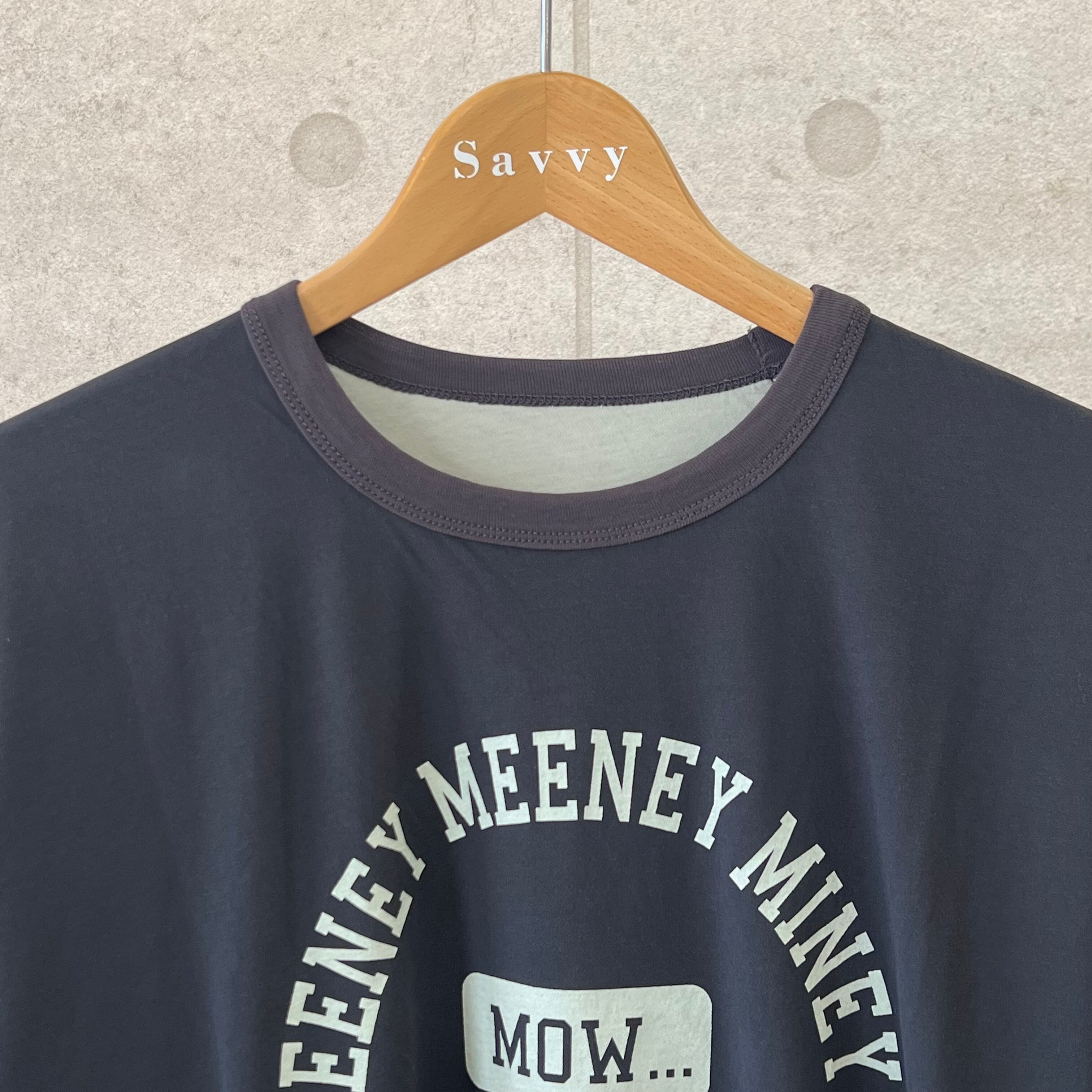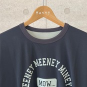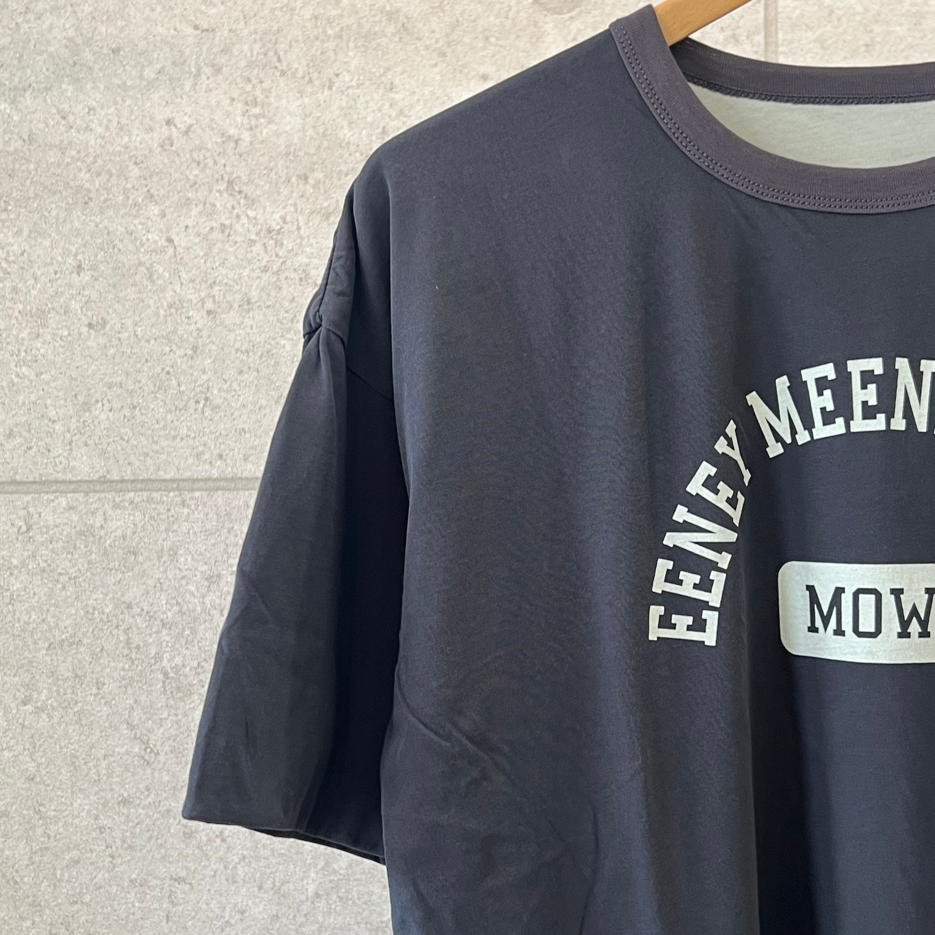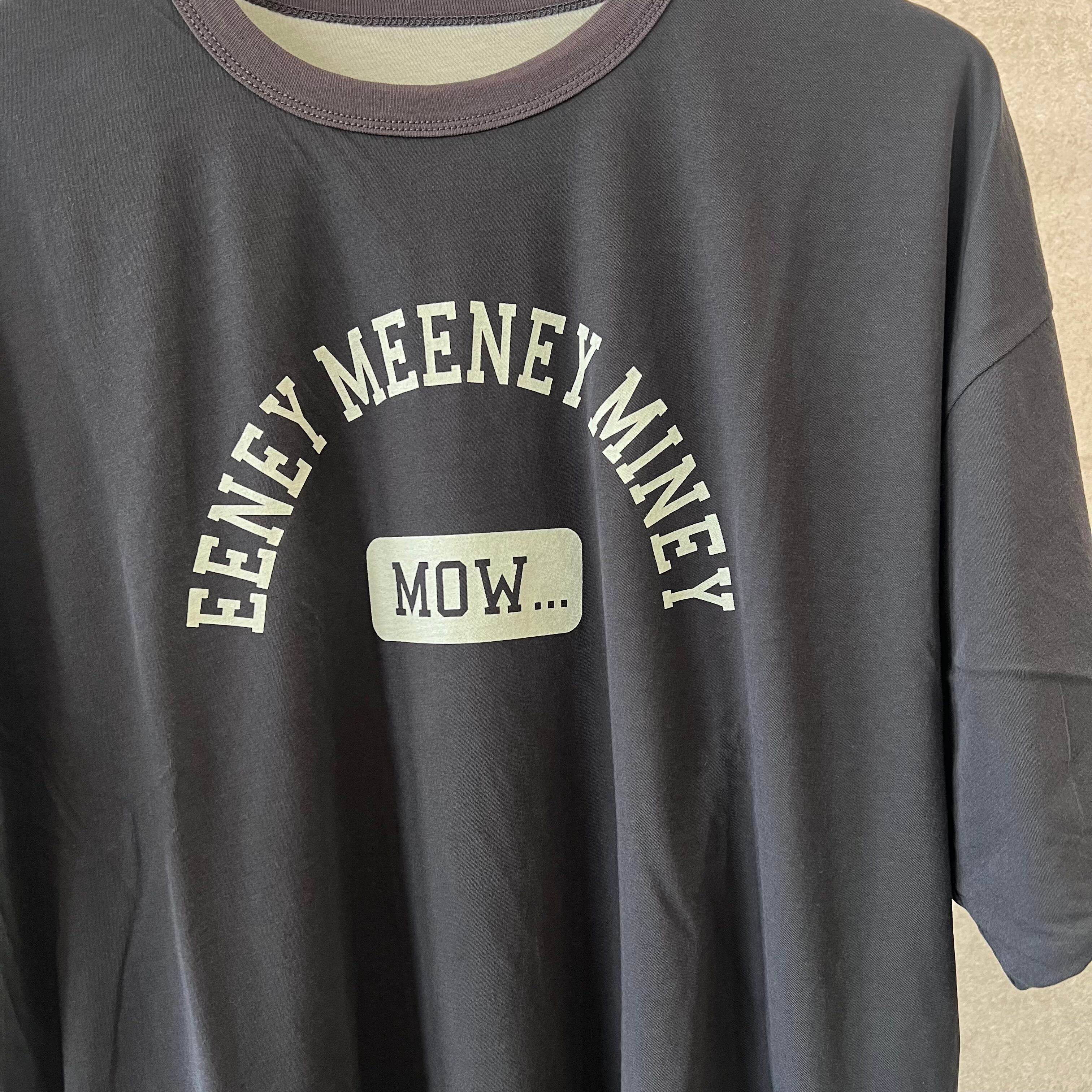 表はカレッジ風のプリント。裏側は背中にステンシル。EENEY MEENY MINEY MOW...は、日本語で言うと"どっちにしようかな~"という意味です。リバーシブルなので、そういう意味を付け加えています。