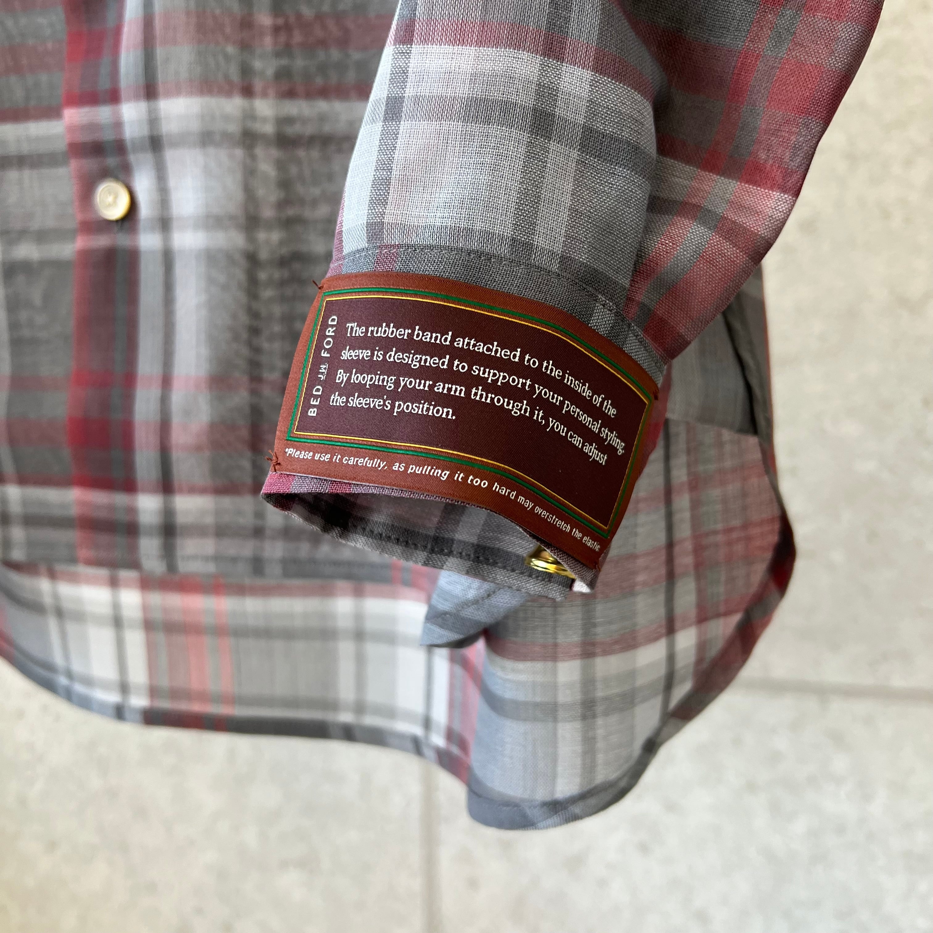 アメリカンカジュアルの印象が強いワークシャツを、BED J.W. FORDらしく上品なパターンと透け感のある生地で作成しています。袖の内側には、ブランドオリジナルの平ゴムが付いており、腕捲りがしやすい仕様になっております。