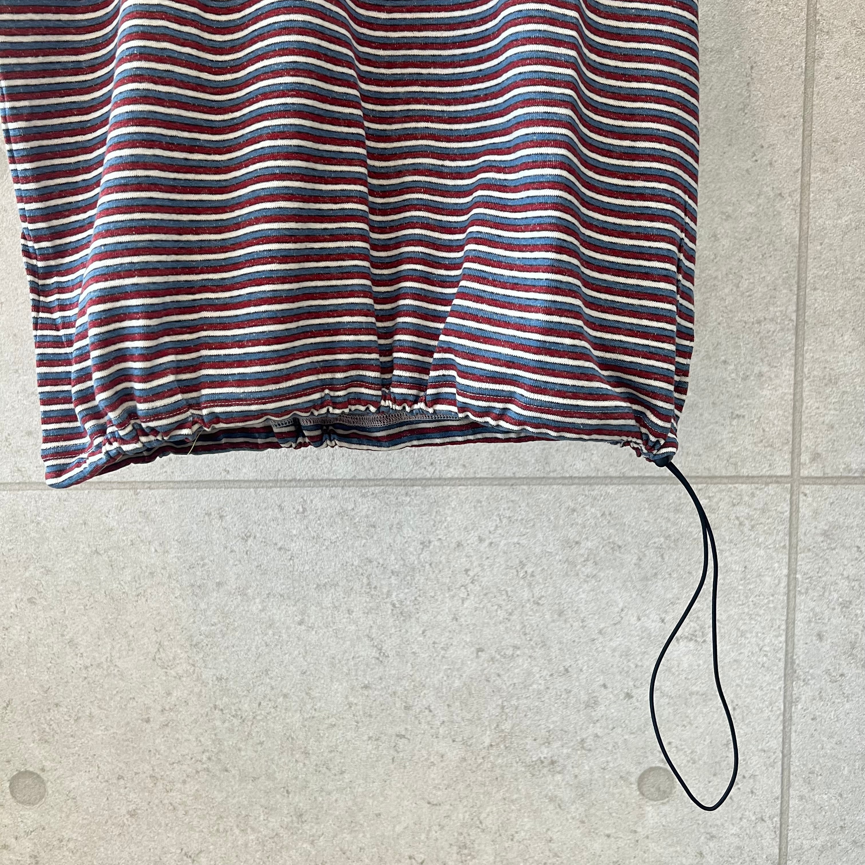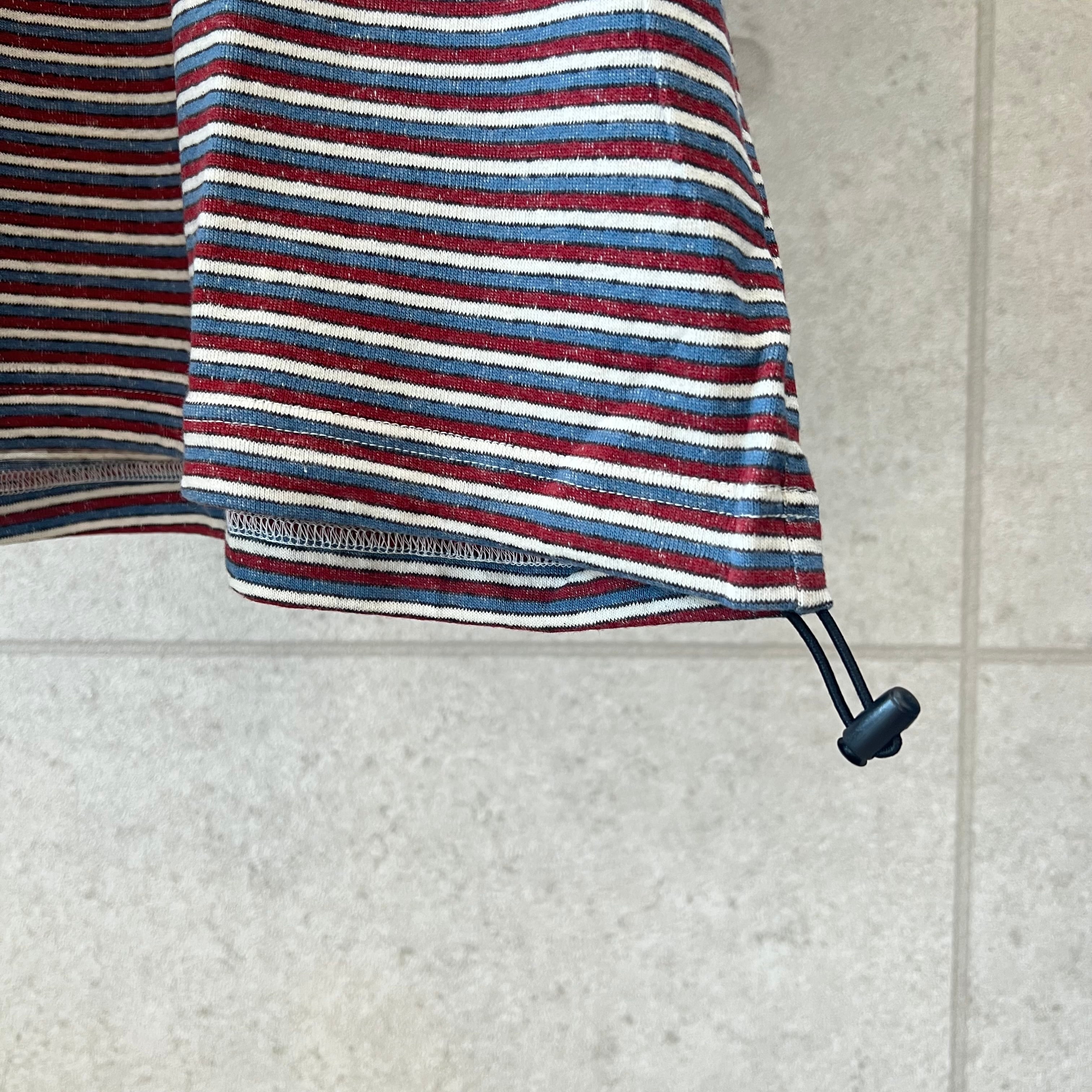 色彩鮮やかなマルチボーダー生地を採用した26・SSカットソーシリーズのオススメのアイテムです。それぞれに雰囲気の異なるボーダーカラーに加えてネオンカラーのリブを、襟と袖口に配した仕上がりとなります。スソ内にスピンドル&ストッパーを搭載し、着丈やシルエットコントロールが可能です。ポップな色合いながらコーディネートしやすく、薄着になる春にアクセントとしてしっかり活用出来るTシャツです。