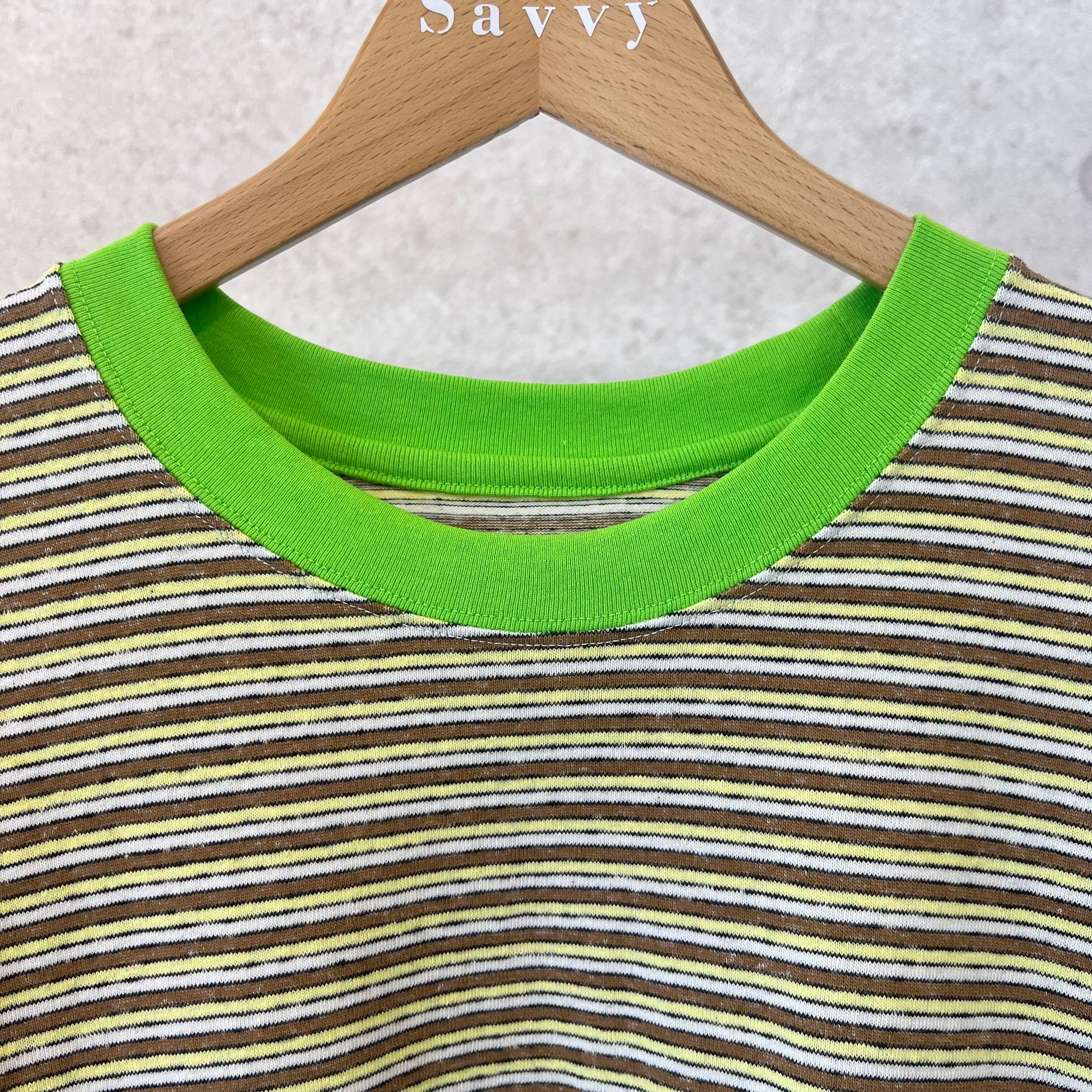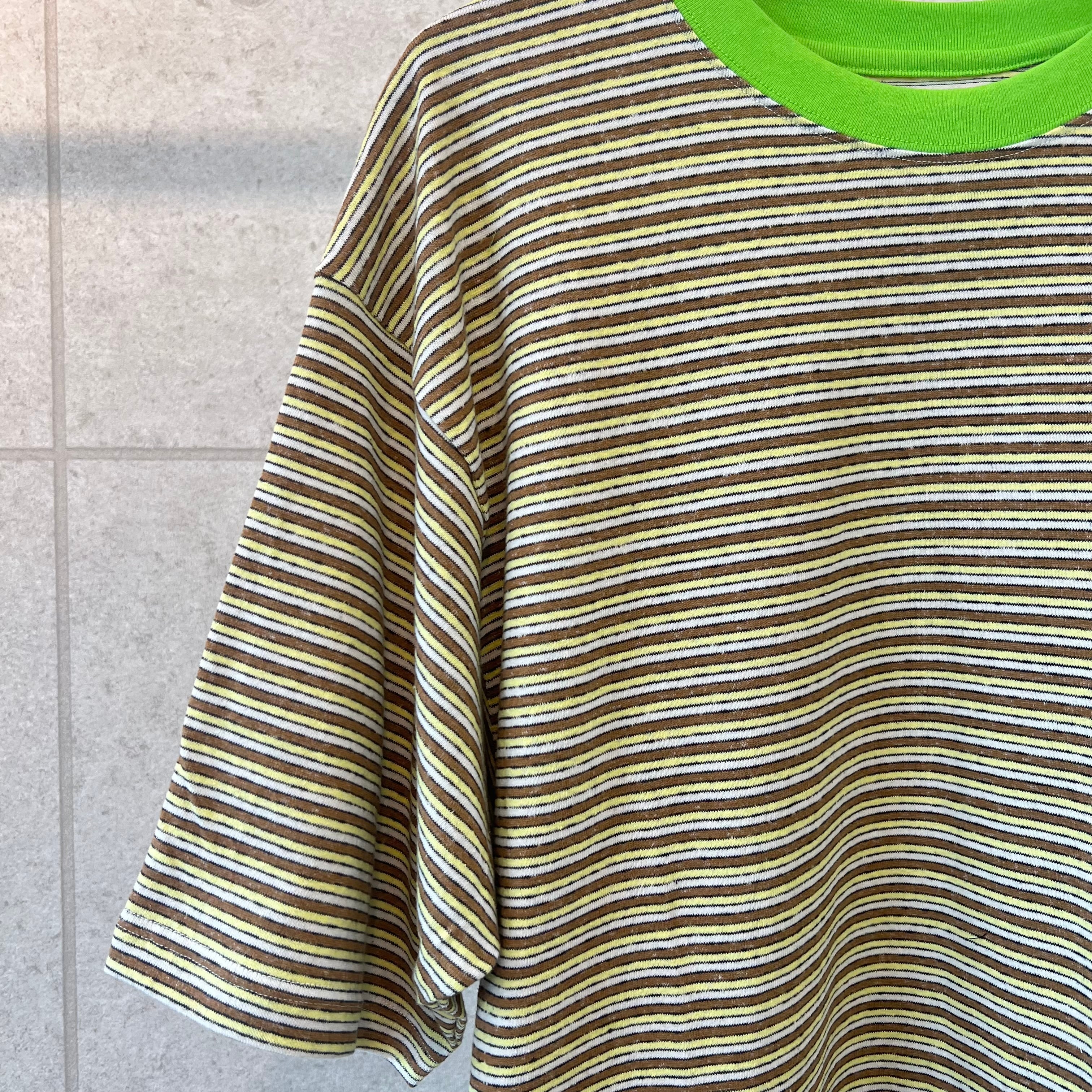 色彩鮮やかなマルチボーダー生地を採用した26・SSカットソーシリーズのオススメのアイテムです。それぞれに雰囲気の異なるボーダーカラーに加えてネオンカラーのリブを、襟と袖口に配した仕上がりとなります。スソ内にスピンドル&ストッパーを搭載し、着丈やシルエットコントロールが可能です。ポップな色合いながらコーディネートしやすく、薄着になる春にアクセントとしてしっかり活用出来るTシャツです。