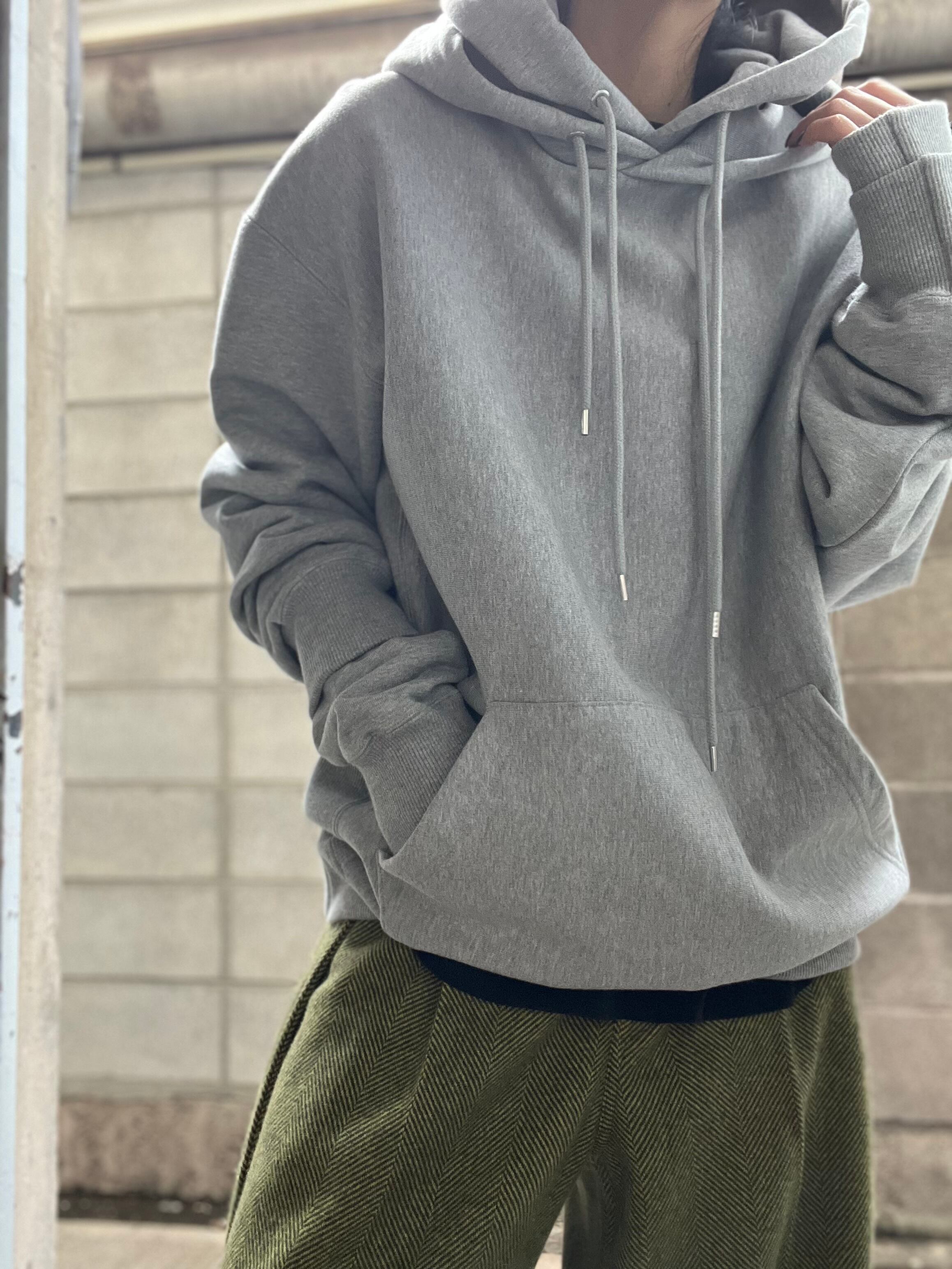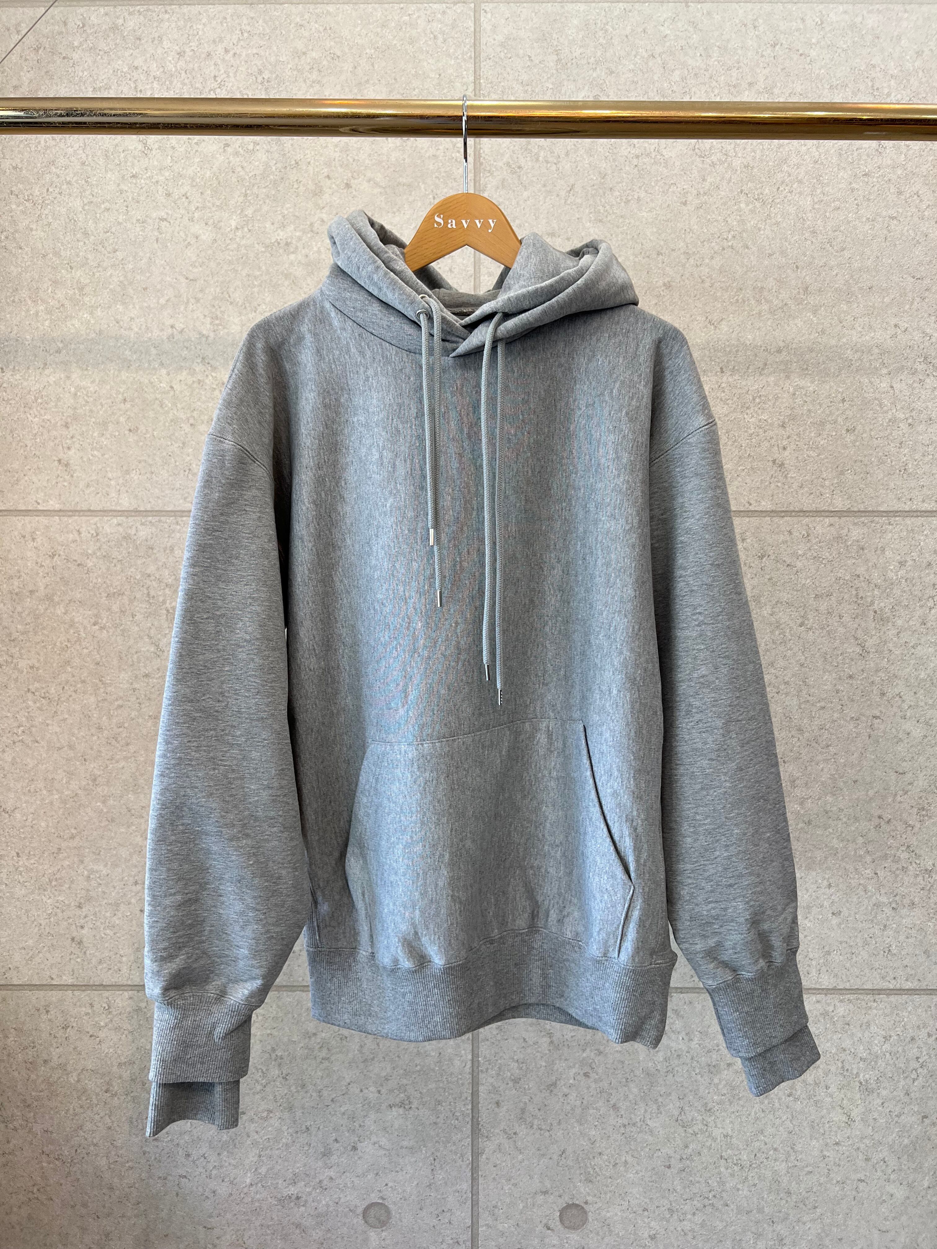 スタッキングのように同じアイテムを重ねたデザインが特徴的なダブル裏毛フーディー。