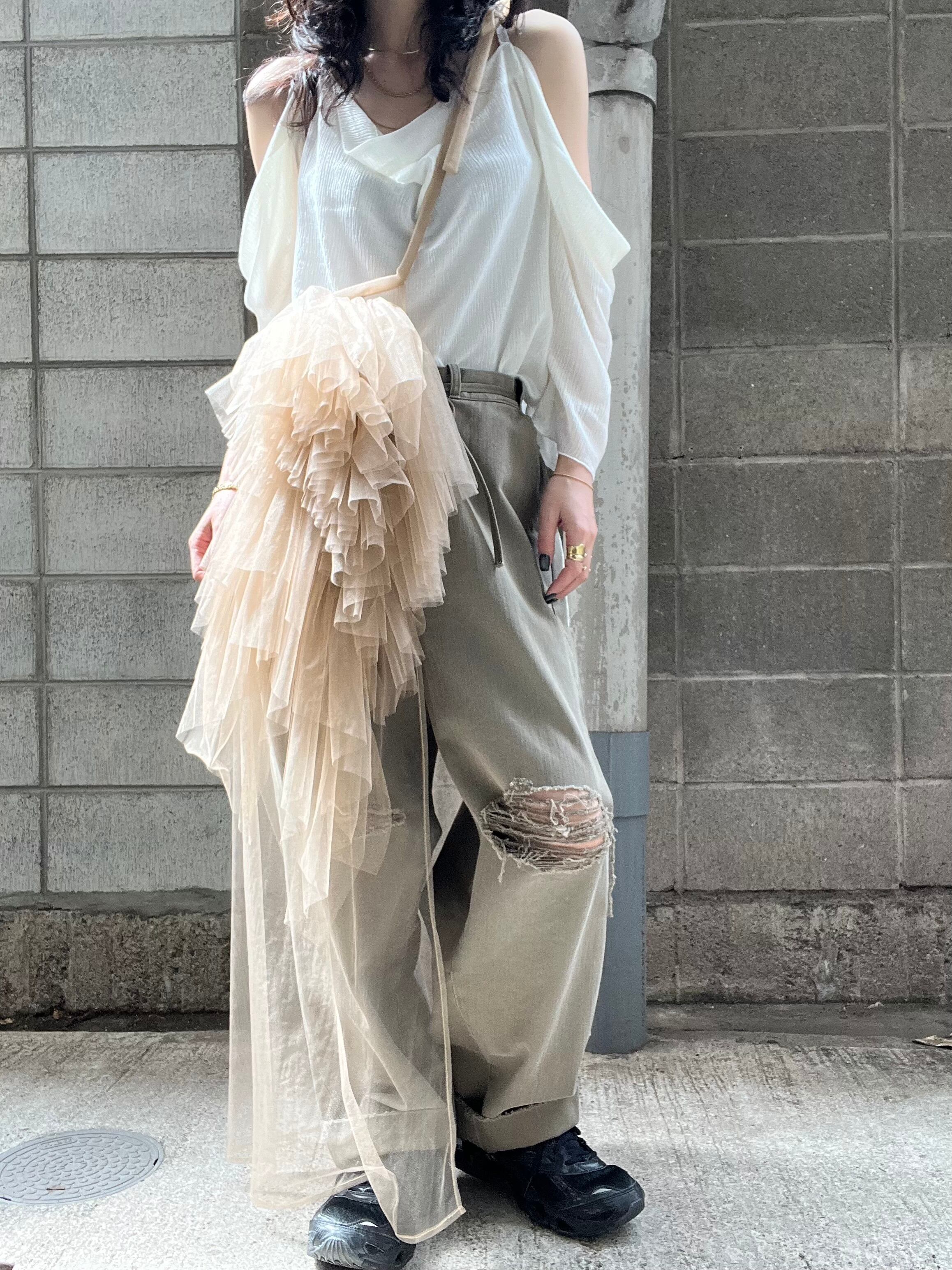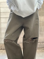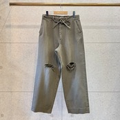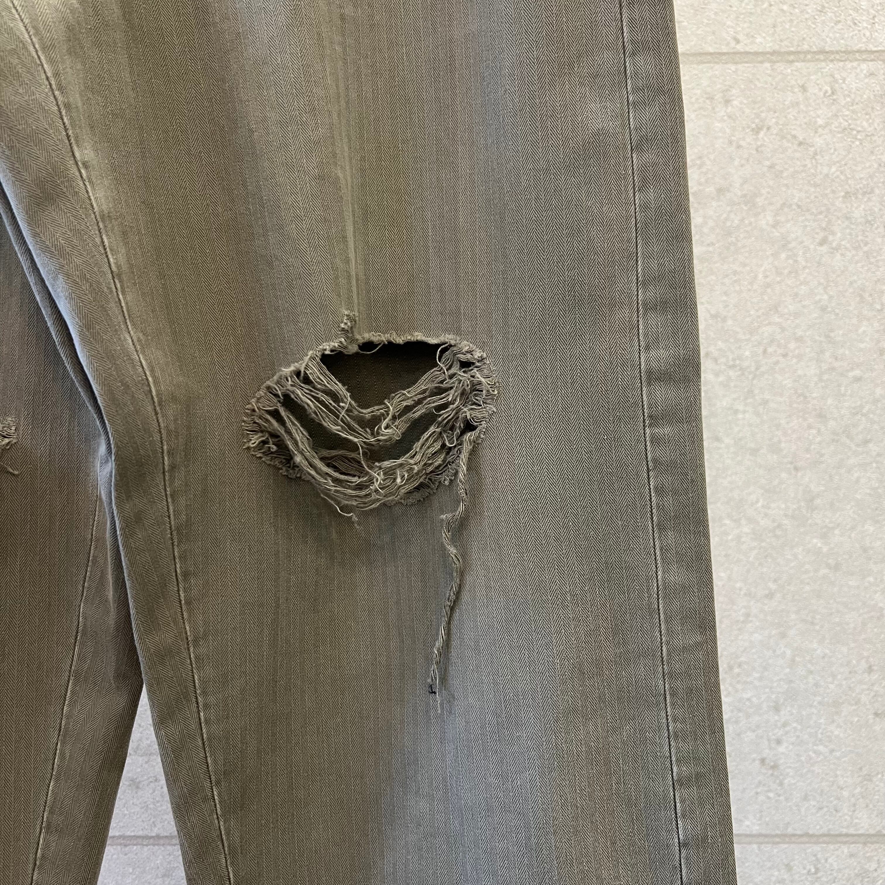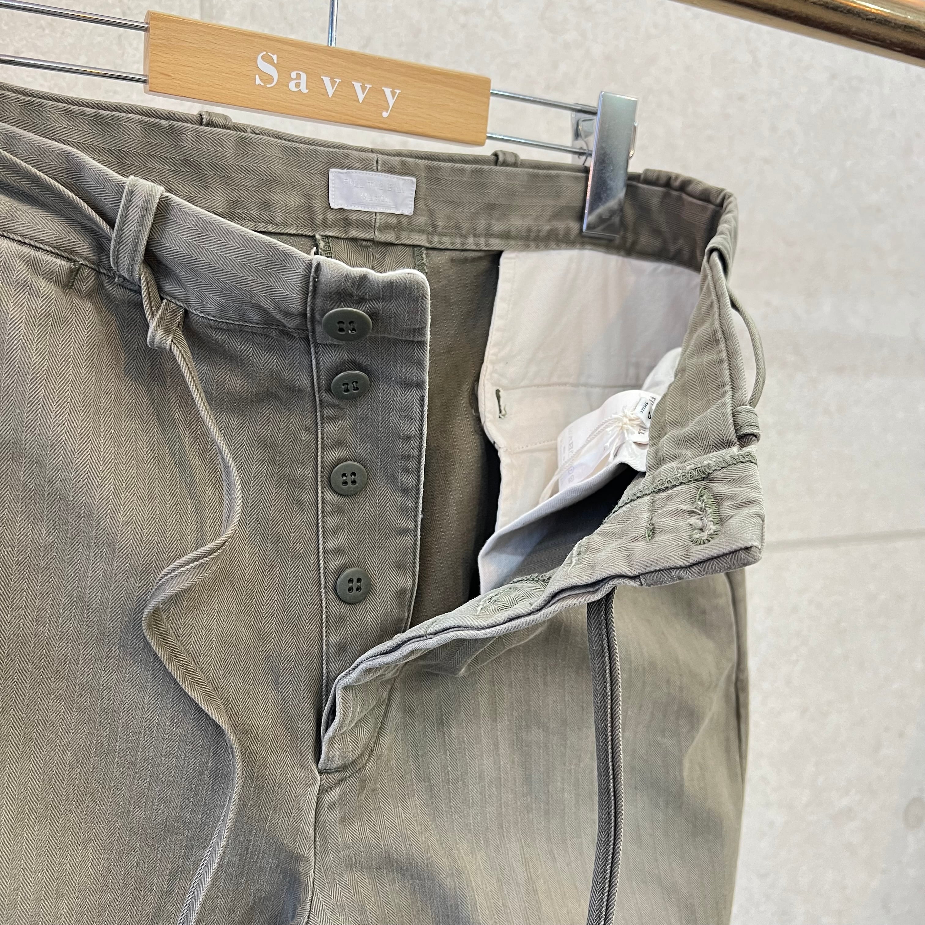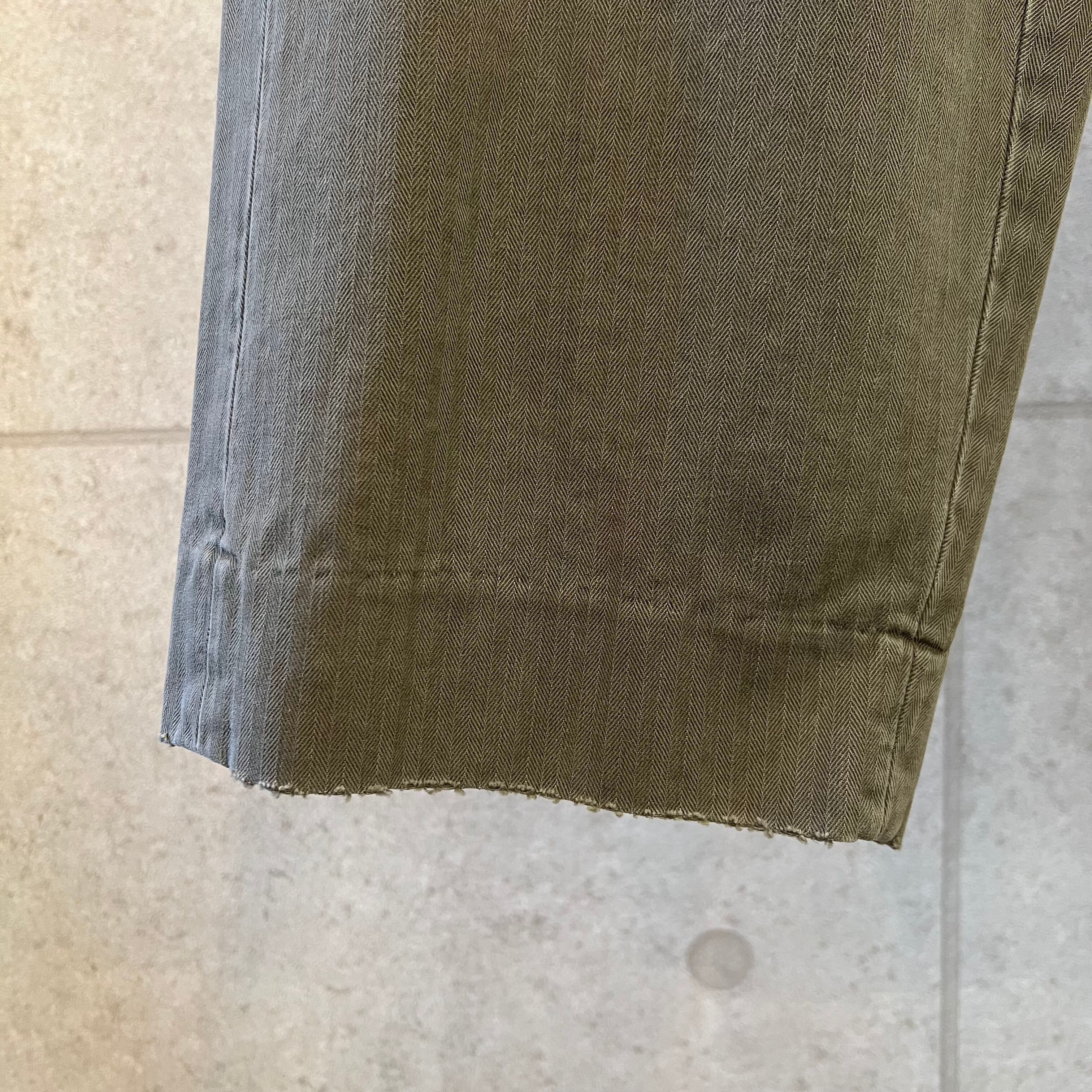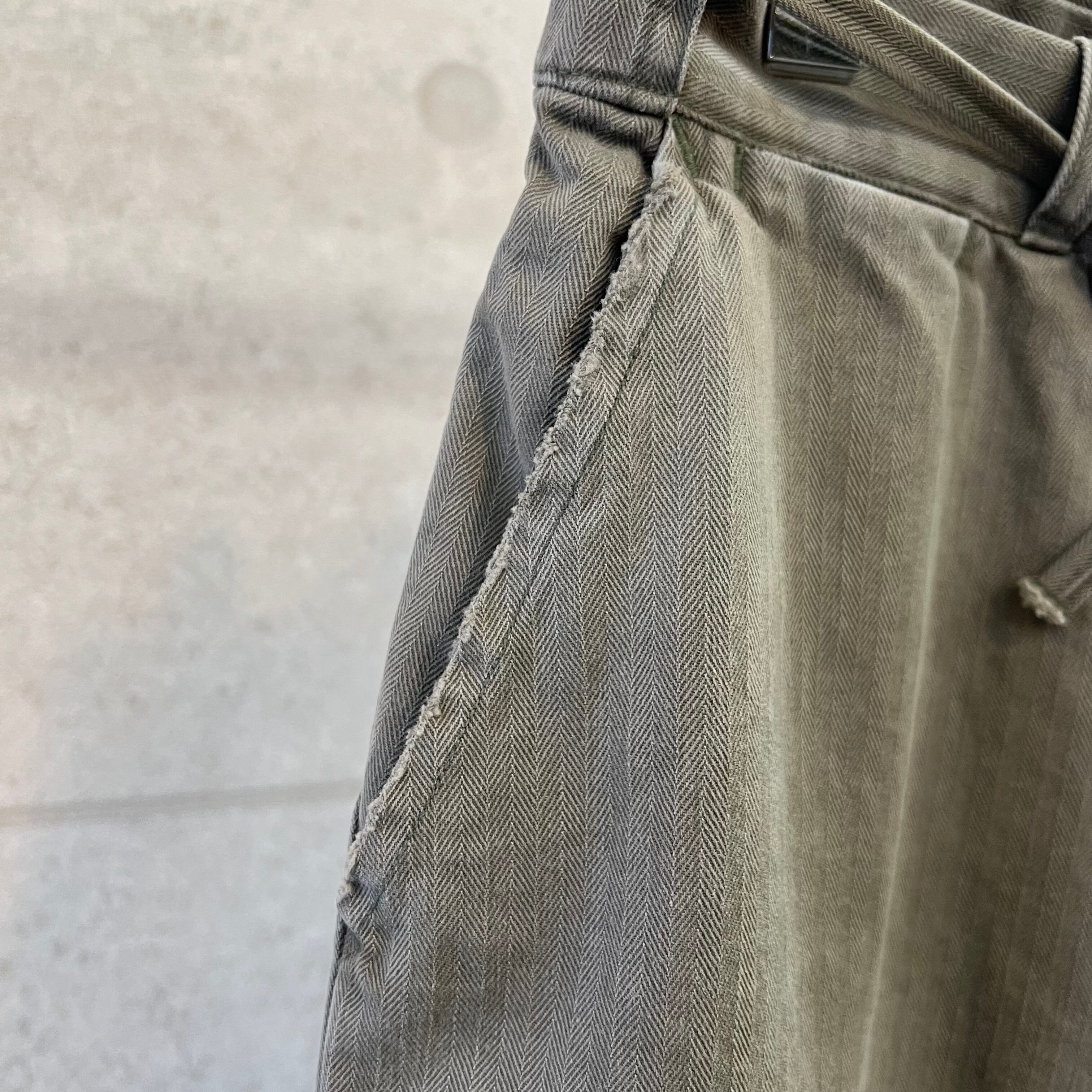 広島県の機屋さんが作る1940年代のUSMCヘリンボーンを復刻した生地を使用したワークトラウザー。全体的にハードな洗いをかけ、大胆な膝穴を開けた加工。