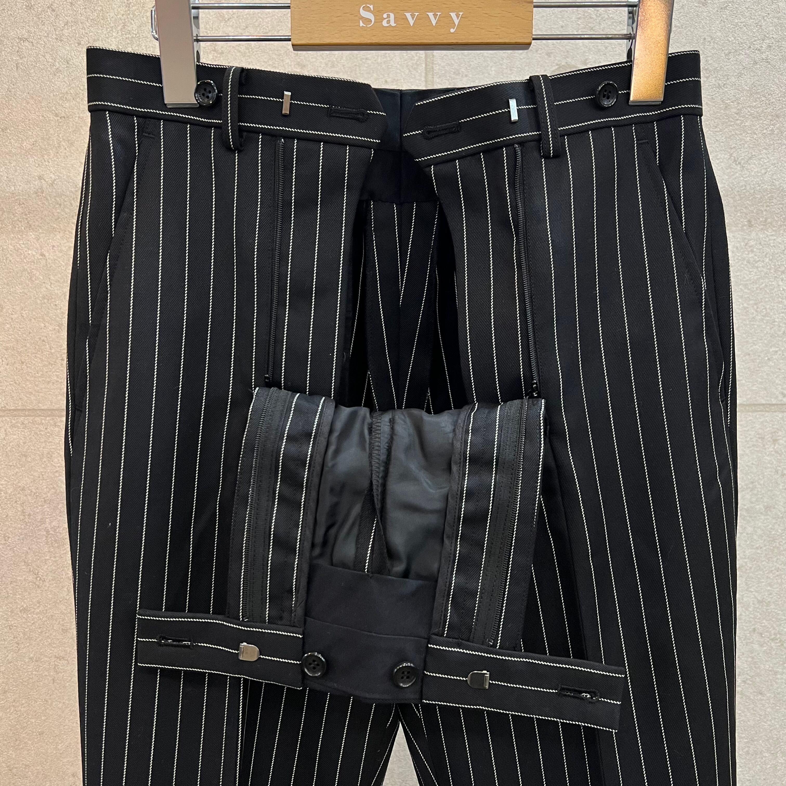 前開きが前左右に2ヶ所共存した、ダブルフロントノータックトラウザーズ。